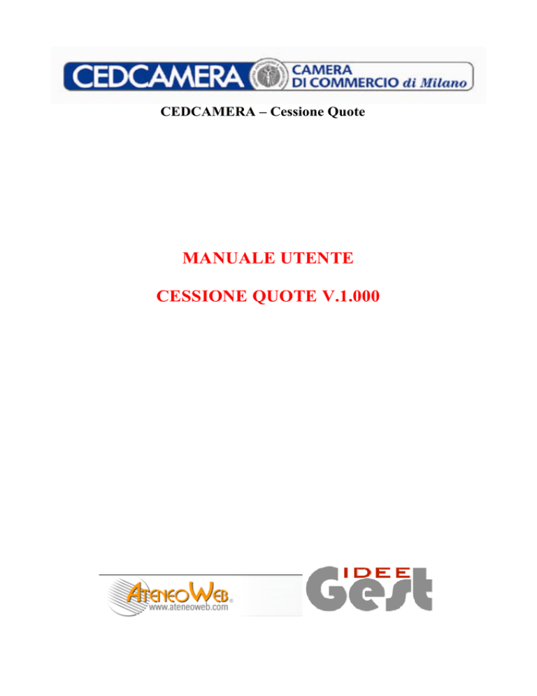 CEDCAMERA – Cessione Quote MANUALE UTENTE CESSIONE QUOTE V.1.000 1. Introduzione ..................................................................................................................................... 3 Requisiti di sistema ...................................................................................................................... 3 2. Installazione del software................................................................................................................. 4 Verifica automatica dei requisiti di installazione ......................................................................... 4 Installazione del software............................................................................................................. 4 Prima esecuzione del software: scelta del tipo di database .............................................................. 6 Gestione delle licenze in installazioni client-server ......................................................................... 7 3. Utilizzo del software ........................................................................................................................ 8 Richiesta di attivazione: ................................................................................................................. 11 Utilizzo delle barre strumenti e dei menù ...................................................................................... 12 Creazione di una nuova anagrafica ................................................................................................ 13 Elenco soci ................................................................................................................................. 14 Ricerca in anagrafica soggetti ........................................................................................................ 15 Creazione di una nuova pratica ...................................................................................................... 16 Intestazione pratica .................................................................................................................... 16 Trasferimenti .............................................................................................................................. 17 Selezione delle parti “dante causa” e “avente causa” ................................................................ 18 Scrittura atto ............................................................................................................................... 18 Registrazione.............................................................................................................................. 20 Firma digitale ............................................................................................................................. 21 Marcatura temporale .................................................................................................................. 21 Documenti per la registrazione e il pagamento .......................................................................... 21 Trasmissione telematica modello S6 (Fedra Plus) ..................................................................... 22 Funzioni di utilità ........................................................................................................................... 23 Backup e ripristino del database .................................................................................................... 24 Richiesta di assistenza.................................................................................................................... 24 Allegati ............................................................................................................................................... 25 allegato al software CESSIONE QUOTE ...................................................................................... 25 Check list........................................................................................................................................ 25 Documenti cedente/i ...................................................................................................................... 26 Documenti cessionario/i................................................................................................................. 27 Documenti relativi alla società oggetto della compravendita ........................................................ 28 Promemoria cessione ..................................................................................................................... 29 Atto sottoscritto con firme digitali: check list adempimenti dell’intermediario ............................ 32 1. Introduzione Il software “CEDCAMERA – Cessione Quote” è il software guida passo-passo per gestire il trasferimento di quote di partecipazione di società a responsabilità limitata ai sensi dell’art.36 del DL 112/2008, dalla stesura dell’atto di cessione, agli adempimenti fiscali, fino al deposito della pratica al registro imprese. Il software prevede: • la compilazione e stampa dell’incarico che i contraenti devono rilasciare all’intermediario abilitato • la formazione dell’Atto di Trasferimento Quote (guidata da una check list e personalizzabile con editor di videoscrittura) • la conversione dell'atto in formato PDF/A • l’apposizione delle firme digitali da parte dei contraenti e della marcatura temporale • la compilazione e stampa del modello 69 per la richiesta di registrazione dell'atto all’Agenzia Entrate • la compilazione e stampa del modello F23 per il pagamento dell’imposta di registro e dei bolli • la predisposizione del modello S6 (telematico) e dei relativi allegati per la trasmissione al Registro Imprese Requisiti di sistema Il software “CEDCAMERA – Cessione Quote” è stato sviluppato per poter funzionare su piattaforme Microsoft Windows con l’utilizzo di database Micr