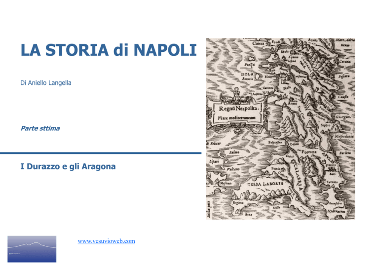 LA STORIA di NAPOLI Di Aniello Langella Parte sttima I Durazzo e gli Aragona www.vesuvioweb.com LA STORIA DELLA CITTA’ DI NAPOLI Piano generale del lavoro Origini, storia, leggende Prima parte Introduzione Le Origini della città di Nappoli Seconda parte Roma entra in città Terza parte Napoli diventa Ducato nel nome della libertà e dell’indipendenza Quarta parte Napoli diventa Normanna Quinta parte Il regno di Federico II Sesta parte Carlo d’Angiò re di Napoli Settima parte Napoli e gli Aragona Testo e ricerca di Aniello Langella 2007 © www.vesuvioweb.com 2 I Durazzo a Napoli La dinastia dei Durazzo vede in Carlo III un nuovo re, che tuttavia resse il potere in città per poco tempo afflitto dalle infinite problematiche di successione, di governo dei confini d’Ungheria e dalle gravi conseguenze cittadine di una ennesima pestilenza. A lui si deve la costruzione del Castello del Carmine. Il 24 febbraio del 1386 Carlo muore a Visegard in Ungheria dove si era recato per il conferimento della corona di quella Regione. La prematura morte di questo re che meritò l’appellativo di “breve”, in relazione al tempo di reggenza, trovò impreparato, incapace e poco più che dodicenne. La reggenza infatti fu affidata alla madre Margherita di Durazzo. Fino al 6 agosto del 1414 il neo re resse le difficili sorti della città contesa dagli Angiò ancora presenti nell’animo dei partenopei, sostenuti dalla famiglia Sanseverino e da Ottone di Brunswick vedovo di Giovanna I. A mostrare grande avversione contro il finto governo di Ladislao I di Napoli detto anche il magnanimo, troviamo un accanito sostenitore e discendente egli stesso della dinastia angioina: Luigi II d’Angiò. Nella città cominciarono così a formarsi due ideologie politiche. Una a favore di Luigi e l’altra di Ladislao re fantoccio retto da Margherita. Dalla semplice fazione e contesa politica si passò presto alla discordia concreta e la città subì una vera e propria guerra civile con tantissimi lutti. In questo clima infuocato e poco sicuro, Margherita, aveva a propria disposizione la guardia reale e l’appoggio della corte mentre la fazione opposta godeva di una larga maggioranza e del consenso della cittadinanza. www.stupormundi.it/Personaggi.html www.vesuvioweb.com 3 Tra la gente comune capeggiata da ex comandanti d’esercito e di marina, nacque una sorta di lega cittadina che venne detta la Lega del Buono Stato e anche soprannominata la Lega degli Otto, nel cui ordinamento interno si poteva riconoscere una magistratura composta da due rappresentanti per il Sedile di Montagna, da due per il Sedile del Popolo e da uno per ciascuno degli altri Sedili, che si propose di esercitare un severo controllo sugli atti degli ufficiali regi per prevenire e impedire ingiustizie. Margherita di Durazzo venuta a conoscenza di questo potere parallelo e avverso alla corona, non potendo agire con pugno ferreo e imporre quindi il proprio potere in quanto vi erano implicate le migliori famiglie della città, si alleò in gran segreto con le fazioni di popolani e le spinse a porre d’assedio il Tribunale di S. Lorenzo. Qui era consuetudine vi fossero le riunioni segrete degli Otto. La missione che doveva avere il carattere di sommossa si trasformò in vera battaglia e si svolse presso il Largo delle Corregge. La famiglia Durazzo uscì sconfitta da questa pugna violenta e inattesa. La vita e la storia di Ladislao che regnò a Napoli come re fino al 6 agosto del 1414. Egli fu anche re di Gerusalemme e di Sicilia, Conte di Provenza, re di Ungheria, e principe di Taranto. Fu un uomo benevolo e intelligente che seppe regnare con grande indipendenza anche se nelle prime fasi dovette subire la tutela della madre . Fu un uomo dotato di equilibrio tanto che oltre all’appellativo di magnanimo ereditò anche quello di “Lancillotto il Liberale” a causa del grande amore con cui trattò i propri sudditi. www.vesuvioweb.com Monumento sepolcrale di Margherita di Durazzo 1412 . Cattedrale di Salerno. Immagine tratta da www.culturacampania.rai.it 4 In alcuni testi figura anche come “Lancillotto il Vittorioso” per aver dimostrato in battaglia sangue freddo e certezza nelle azioni. Ebbe tra le tante idee di democrazia, una in particolare: voleva conquistare l’intera Italia e unificarla sotto la sua corona. Fu per questo che durante il periodo in cui dominava Taranto, volle tentare la conquista di Roma, occupandola dal 1404 al 1409. Napoli ebbe con Ladislao un re importante e saggio, docile e forte che non ebbe eredi diretti e che a soli quarant’anni morì a causa della lue, lasciando la corona alla sorella Giovanna. La nuova regina che venne detta seconda per non confonderla con la prima, ereditò un regno traballante e insicuro e poco assunse del carisma del fratello, e volendo seguire le orme della Giovanna I non tardò a dimostrare il suo vero animo di scandalosa e lussuriosa donna, passando da un amore ad un altro e da un letto all’altro senza ritegno alcuno. . Si deve a Giovanna II regina di Napoli l’aver ordinato la tomba monumentale eretta a memoria di Ladislao nella Chiesa di San Giovanni a Carbonara. www.vesuvioweb.com 1 Chiesa di San Giovanni a Carbonara 2 Ritratto di ladislao 5 Gli Aragonesi entrano a Napoli Non fu mai tenero il rapporto tra Giovanna di Durazzo e Alfonso V d’Aragona sovrano della Sicilia e di Spagna. La causa di questo dissidio si deve ricondurre al periodo di massimo fulgore della regina a Napoli, quando vedendosi minacciata da ribellioni continue chiese al sovrano un aiuto militare in cambio della corona stessa. Ma come sappiamo dalla storia ciò non avvenne e Alfonso che non era certo avvezzo a voltafaccia imprevisti come questo, alla morte di Giovanna I pose d’assedio la città e nel 1442 la conquistò con la forza. Nuovamente Napoli cambiava padrone e questa volta erano spagnoli. I timori della popolazione erano comprensibili e ancor di più dei vecchi fautori del dominio angioino. Ma questo per