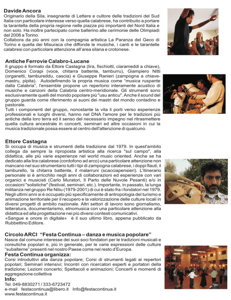 Davide Ancora Originario della Sila, insegnante di Lettere e cultore delle tradizioni del Sud Italia con particolare interesse verso quella calabrese, ha contribuito a portare la tarantella della propria regione nelle piazze più importanti del Nord Italia e non solo. Ha inoltre partecipato come ballerino alle cerimonie delle Olimpiadi del 2006 a Torino. Collabora da più anni con la compagnia artistica La Paranza del Geco di Torino e quella dei Misuraca che diffonde le musiche, i canti e le tarantelle calabresi con particolare attenzione all’area silana e crotonese. Antiche Ferrovie Calabro-Lucane Il gruppo è formato da Ettore Castagna (lira, fischiotti, ciarameddi a chiave), Domenico Corapi (voce, chitarra battente, tamburru), Giampiero Nitti (organetti, tambureddu, cascia) e Giuseppe Ranieri (zampogna a chiavemastru, pipita). Autodefinendo la propria musica come “musica ruspante dalla Calabria”, l'ensemble propone un repertorio interamente acustico di musiche e canzoni della Calabria centro-meridionale. Gli strumenti sono esclusivamente quelli del mondo popolare più "usu anticu". Anche il sound del gruppo guarda come riferimento ai suoni dei mastri del mondo contadino e pastorale. Tutti i componenti del gruppo, nonostante la vita li porti verso esperienze professionali e luoghi diversi, hanno nel DNA l'amore per le tradizioni più antiche della loro terra ed il senso del necessario impegno nel ritrasmettere quella cultura ancestrale in concerti, seminari ed altre occasioni in cui la musica tradizionale possa essere al centro dell'attenzione di qualcuno. Ettore Castagna Si occupa di musica e strumenti della tradizione dal 1979. In quest'ambito collega da sempre la riproposta artistica alla ricerca "sul campo", alla didattica, alle più varie esperienze nel world music oriented. Anche se ha dedicato alla lira calabrese (cordofono ad arco) una particolare attenzione non mancano nel suo strumentario tutti i tipi di zampogna calabrese, i doppi flauti, il tamburello, la chitarra battente, il malarruni (scacciapensieri). L'itinerario personale si è arricchito negli anni di collaborazioni ed esperienze con vari organici e musicisti (Carlo Muratori, Il Parto delle Nuvole Pesanti) e/o in occasioni "solistiche" (festival, seminari, etc.). Importante, in passato, la lunga militanza nel gruppo Re Niliu (1979-2001) di cui è stato fra i fondatori nel 1979. Negli ultimi anni si è occupato più specificamente di antropologia del turismo e animazione territoriale per il recupero e la valorizzazione delle culture locali in diversi progetti di ambito nazionale. Altri settori di lavoro sono giornalismo, letteratura, documentarismo, etnomusica con una particolare attenzione alla didattica ed alla progettazione nei più diversi contesti comunicativi. «Sangue e onore in digitale» è il suo ultimo libro, appena pubblicato da Rubbettino Editore. Circolo ARCI “Festa Continua – danza e musica popolare” Nasce dal comune interesse dei suoi soci fondatori per le tradizioni musicali e coreutiche popolari e, più in generale, per le varie espressioni delle culture “subalterne” presenti nel nostro Paese come nel resto d’Europa. Festa Continua organizza: Corsi introduttivi alla danza popolare; Corsi di strumenti legati ai repertori popolari; Seminari intensivi; Incontri con ricercatori esperti e portatori della tradizione; Lezioni concerto; Spettacoli e animazioni; Concerti e momenti di aggregazione collettiva Info: Tel. 049-8830271 / 333-6723472 e-mail festacontinua@libero.it Info@festacontinua.it www.festacontinua.it