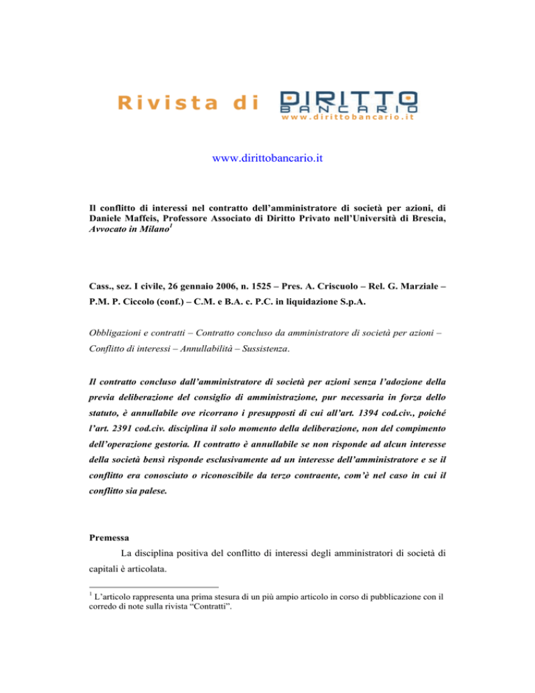 www.dirittobancario.it Il conflitto di interessi nel contratto dell’amministratore di società per azioni, di Daniele Maffeis, Professore Associato di Diritto Privato nell’Università di Brescia, Avvocato in Milano1 Cass., sez. I civile, 26 gennaio 2006, n. 1525 – Pres. A. Criscuolo – Rel. G. Marziale – P.M. P. Ciccolo (conf.) – C.M. e B.A. c. P.C. in liquidazione S.p.A. Obbligazioni e contratti – Contratto concluso da amministratore di società per azioni – Conflitto di interessi – Annullabilità – Sussistenza. Il contratto concluso dall’amministratore di società per azioni senza l’adozione della previa deliberazione del consiglio di amministrazione, pur necessaria in forza dello statuto, è annullabile ove ricorrano i presupposti di cui all’art. 1394 cod.civ., poiché l’art. 2391 cod.civ. disciplina il solo momento della deliberazione, non del compimento dell’operazione gestoria. Il contratto è annullabile se non risponde ad alcun interesse della società bensì risponde esclusivamente ad un interesse dell’amministratore e se il conflitto era conosciuto o riconoscibile da terzo contraente, com’è nel caso in cui il conflitto sia palese. Premessa La disciplina positiva del conflitto di interessi degli amministratori di società di capitali è articolata. 1 L’articolo rappresenta una prima stesura di un più ampio articolo in corso di pubblicazione con il corredo di note sulla rivista “Contratti”. Il conflitto di interessi può infatti riguardare momenti diversi, in particolare può riguardare il momento della deliberazione del consiglio di amministrazione (se non si è in presenza di un amministratore unico) ovvero il diverso momento del compimento da parte dell’amministratore – unico o delegato o che abbia omesso di sottoporre il compimento dell’operazione alla discussione ed all’approvazione del consiglio – di un’operazione gestoria. Il conflitto di interessi nelle deliberazioni del consiglio è disciplinato, per ciò che riguarda la società per azioni, dall’art. 2391 cod.civ. La vecchia disciplina dell’art. 2391 cod.civ., rubricata “Conflitto d’interessi”, così disponeva: “L’amministratore, che in una determinata operazione ha, per conto proprio o di terzi, interesse in conflitto con quello della società, deve darne notizia agli altri amministratori e al collegio sindacale, e deve astenersi dal partecipare alle deliberazioni riguardanti l’operazione stessa. In caso d’inosservanza, l’amministratore risponde delle perdite che siano derivate alla società dal compimento dell’operazione. La deliberazione del consiglio, qualora possa recare danno alla società, può, entro tre mesi dalla sua data, essere impugnata dagli amministratori assenti o dissenzienti e dai sindaci se, senza il voto dell’amministratore che doveva astenersi, non si sarebbe raggiunta la maggioranza richiesta. In ogni caso sono salvi i diritti acquistati in buona fede dai terzi in base ad atti compiuti in esecuzione della deliberazione”. Dunque, stando ai precetti del vecchio art. 2391 cod.civ., la tutela appariva preventiva, perché l’amministratore era tenuto, prima della discussione e della deliberazione, a dare notizia dell’interesse in conflitto e ad astenersi dal partecipare alla deliberazione. Tuttavia la tutela, già in base alla littera legis, era successiva, perché sia il rimedio risarcitorio sia il rimedio impugnatorio erano subordinati al danno: il rimedio impugnatorio operava “qualora” – recitava il vecchio art. 2391 – “la deliberazione possa recare danno alla società” ed il rimedio risarcitorio operava in presenza di “perdite che siano derivate alla società dal compimento dell’operazione”. Il nuovo art. 2391 obbliga l’amministratore a comunicare “ogni interesse nell’operazione”, non più “l’interesse in conflitto con quello della società”. La norma impedisce che l’amministratore possa continuare, come accadeva sotto il vecchio regime, a decidere, lui solo, circa l’esistenza di un suo rilevante interesse nell’operazione, per trasferire al consiglio, opportunamente informato, una decisione sulla convenienza della deliberazione per la società. 2 Inoltre il nuovo art. 2391 non prevede un obbligo di astensione dell’amministratore interessato (arg. ex art. 2391, comma 2): esso obbliga il consiglio a motivare adeguatamente le ragioni e la convenienza per la società dell’operazione, quando la deliberazione sia stata assunta dopo che un amministratore abbia comunicato di essere interessato (art. 2391, comma 2). Se si tratta invece di società a responsabilità limitata, occorre distinguere tra vecchia e nuova disciplina per identificare quali siano le norme applicabili alla decisione del consiglio. Nella vecchia disciplina il conflitto di interessi dell’amministratore di s.r.l. era soggetto all’art. 2391 cod.civ., giusta il richiamo di cui all’art. 2487, comma 2 cod.civ. Nella nuova disciplina invece esistono discipline diverse per il conflitto di interessi degli amministratori di s.p.a. e di s.r.l. Per le decisioni in materia di s.r.l., l’art. 2375 ter, comma 2 così dispone: “Le decisioni adottate dal consiglio di amministrazione con il voto determinante di un amministratore in conflitto di interessi con la società, qualora le cagionino un danno patrimoniale, possono essere impugnate entro tre mesi dagli amministratori e, ove esistenti, dai soggetti previsti dall’articolo 2477. In ogni caso sono salvi i diritti acquistati in buona fede dai terzi in base ad atti compiuti in esecuzione della decisione”. Manca, nella società a responsabilità limitata, l’obbligo dell’amministratore interessato di informare gli altri amministratori con il correlato obbligo di motivazione delle ragioni e della convenienza dell’operazione; e manca, come nella s.p.a., l’obbligo di astensione dalla decisione. La decisione è annullabile se è stata adotta con il voto determinante 