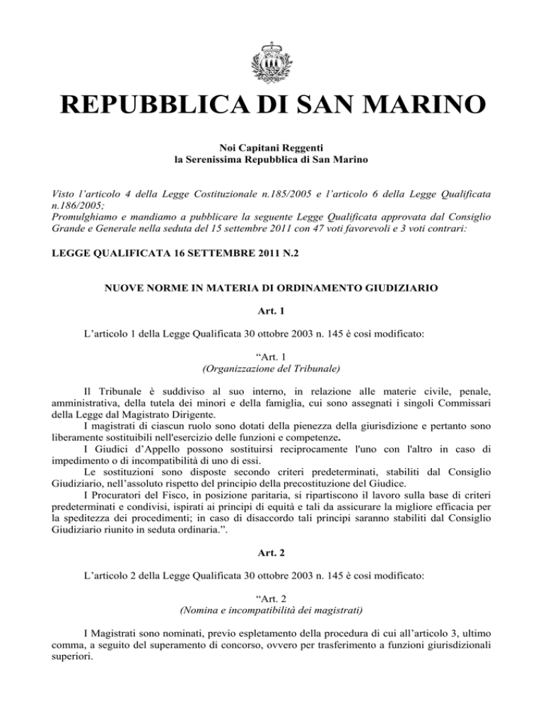 REPUBBLICA DI SAN MARINO Noi Capitani Reggenti la Serenissima Repubblica di San Marino Visto l’articolo 4 della Legge Costituzionale n.185/2005 e l’articolo 6 della Legge Qualificata n.186/2005; Promulghiamo e mandiamo a pubblicare la seguente Legge Qualificata approvata dal Consiglio Grande e Generale nella seduta del 15 settembre 2011 con 47 voti favorevoli e 3 voti contrari: LEGGE QUALIFICATA 16 SETTEMBRE 2011 N.2 NUOVE NORME IN MATERIA DI ORDINAMENTO GIUDIZIARIO Art. 1 L’articolo 1 della Legge Qualificata 30 ottobre 2003 n. 145 è così modificato: “Art. 1 (Organizzazione del Tribunale) Il Tribunale è suddiviso al suo interno, in relazione alle materie civile, penale, amministrativa, della tutela dei minori e della famiglia, cui sono assegnati i singoli Commissari della Legge dal Magistrato Dirigente. I magistrati di ciascun ruolo sono dotati della pienezza della giurisdizione e pertanto sono liberamente sostituibili nell'esercizio delle funzioni e competenze. I Giudici d’Appello possono sostituirsi reciprocamente l'uno con l'altro in caso di impedimento o di incompatibilità di uno di essi. Le sostituzioni sono disposte secondo criteri predeterminati, stabiliti dal Consiglio Giudiziario, nell’assoluto rispetto del principio della precostituzione del Giudice. I Procuratori del Fisco, in posizione paritaria, si ripartiscono il lavoro sulla base di criteri predeterminati e condivisi, ispirati ai principi di equità e tali da assicurare la migliore efficacia per la speditezza dei procedimenti; in caso di disaccordo tali principi saranno stabiliti dal Consiglio Giudiziario riunito in seduta ordinaria.”. Art. 2 L’articolo 2 della Legge Qualificata 30 ottobre 2003 n. 145 è così modificato: “Art. 2 (Nomina e incompatibilità dei magistrati) I Magistrati sono nominati, previo espletamento della procedura di cui all’articolo 3, ultimo comma, a seguito del superamento di concorso, ovvero per trasferimento a funzioni giurisdizionali superiori. I Giudici per la terza istanza, i Giudici per i rimedi straordinari ed i Giudici per l’azione di responsabilità civile dei magistrati sono nominati dal Consiglio Giudiziario. I Magistrati devono dimostrare specifica professionalità, obiettività ed imparzialità. Nell'espletamento dell'incarico devono sempre manifestare sicura dottrina e prudente equilibrio e costantemente tenere un’irreprensibile condotta civile e morale. L'Ufficio di Magistrato è incompatibile con l'assunzione di incarichi e con l'iscrizione a movimenti o partiti politici o ad associazioni sindacali, con la presentazione di candidature in elezioni politiche ed amministrative, con l'esercizio di attività commerciali o industriali, con l'assunzione delle cariche di amministratore e sindaco in società e, limitatamente ai Commissari della Legge, al Procuratore del Fisco e agli Uditori, con l'esercizio della libera professione e l'assunzione di altri uffici ed impieghi pubblici o privati sia nel territorio della Repubblica sia all'estero, escluso l’incarico di docente universitario, per quanto compatibile. L’Ufficio di Magistrato d’appello o di grado superiore è incompatibile con l’esercizio della professione nel territorio della Repubblica. E’ fatto divieto al coniuge, al convivente more uxorio ed ai parenti ed affini entro il 3° grado dei Magistrati di esercitare il patrocinio avanti al Tribunale Unico. Lo status giuridico del Magistrato è regolamentato con legge ordinaria. Il trattamento retributivo dei Magistrati è stabilito dalla legge ordinaria. In ottemperanza all'articolo 4, comma 2, della Dichiarazione dei Diritti dei Cittadini e dei Principi Fondamentali dell'Ordinamento Sammarinese, ai cittadini sammarinesi è garantita la possibilità di accesso alla magistratura. I Magistrati assumono l’incarico prestando giuramento nelle mani dell'Ecc.ma Reggenza.”. Art. 3 L’articolo 3 della Legge Qualificata 30 ottobre 2003 n. 145 è così modificato: “Art.3 (Reclutamento dei magistrati) I Giudici per la terza istanza ed i Giudici per i rimedi straordinari, in numero di due per ogni Ufficio, ed i sei Giudici per l’azione di responsabilità civile dei magistrati, un titolare ed un supplente per ogni grado di giudizio, sono nominati dal Consiglio Giudiziario, a maggioranza dei due terzi. I Giudici d’Appello sono nominati a seguito di apposito concorso per titoli avanti ad una Commissione giudicatrice composta da tre membri, di cui uno con funzioni di presidente, designati dal Consiglio Giudiziario fra personalità di chiara fama, nell’ambito del diritto, anche esterne alla magistratura sammarinese, ovvero fra i Giudici d’Appello o di grado superiore. Non possono far parte della Commissione gli iscritti all’Albo degli Avvocati e notai, dei dottori commercialisti e dei ragionieri della Repubblica, il coniuge, il convivente more uxorio, i parenti ed affini sino al 3° grado di iscritti a tali ordinamenti professionali. I Commissari della Legge, il Procuratore del Fisco, gli Uditori Commissariali sono nominati a seguito di concorso per esami, da tenersi mediante una prova scritta ed un colloquio orale, avanti ad una Commissione Giudicatrice costituita da tre membri designati dal Consiglio Giudiziario tra personalità di chiara fama nell’ambito del diritto anche esterne alla magistratura sammarinese ovvero tra i Giudici d’Appello o di grado superiore, di cui uno con funzioni di presidente. Non possono far parte della Commissione gli iscritti all’Albo degli avvocati e notai, dei dottori commercialisti e dei ragionieri della Repubblica, il coniuge, il convivente more uxorio, i parenti ed affini sino al 3° grado di iscritti a tali albi. La graduatoria formata a seguito dei concorsi, con l’indicazione dei vincitori, viene trasmessa al Consiglio Grande e Generale che ne prende atto. La disciplina per la selezione dei candidati e la procedura di svolgimento della prova si svolgono, in quanto compatibili con la presente legge, secondo 