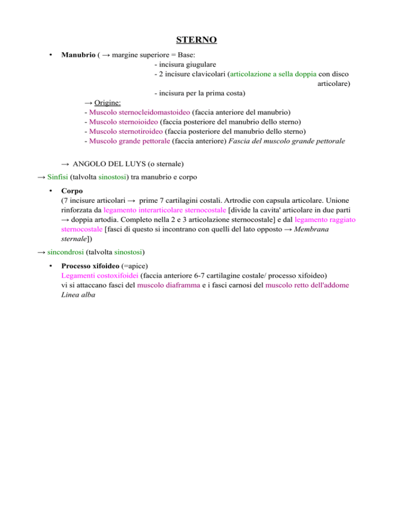 STERNO • Manubrio ( → margine superiore = Base: - incisura giugulare - 2 incisure clavicolari (articolazione a sella doppia con disco articolare) - incisura per la prima costa) → Origine: - Muscolo sternocleidomastoideo (faccia anteriore del manubrio) - Muscolo sternoioideo (faccia posteriore del manubrio dello sterno) - Muscolo sternotiroideo (faccia posteriore del manubrio dello sterno) - Muscolo grande pettorale (faccia anteriore) Fascia del muscolo grande pettorale → ANGOLO DEL LUYS (o sternale) → Sinfisi (talvolta sinostosi) tra manubrio e corpo • Corpo (7 incisure articolari → prime 7 cartilagini costali. Artrodie con capsula articolare. Unione rinforzata da legamento interarticolare sternocostale [divide la cavita' articolare in due parti → doppia artodia. Completo nella 2 e 3 articolazione sternocostale] e dal legamento raggiato sternocostale [fasci di questo si incontrano con quelli del lato opposto → Membrana sternale]) → sincondrosi (talvolta sinostosi) • Processo xifoideo (=apice) Legamenti costoxifoidei (faccia anteriore 6-7 cartilagine costale/ processo xifoideo) vi si attaccano fasci del muscolo diaframma e i fasci carnosi del muscolo retto dell'addome Linea alba