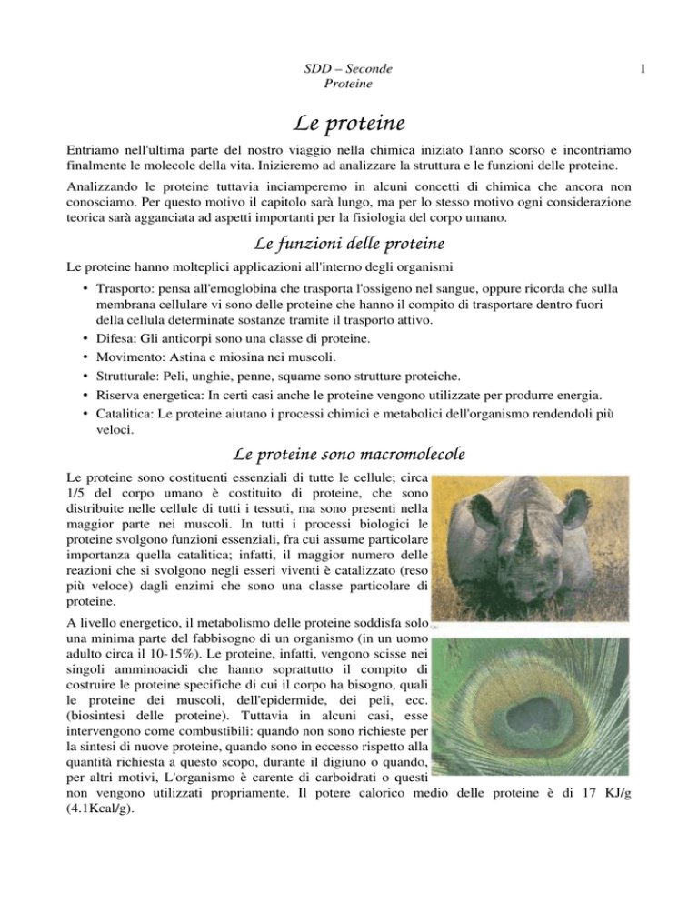 SDD – Seconde Proteine Le proteine Entriamo nell'ultima parte del nostro viaggio nella chimica iniziato l'anno scorso e incontriamo finalmente le molecole della vita. Inizieremo ad analizzare la struttura e le funzioni delle proteine. Analizzando le proteine tuttavia inciamperemo in alcuni concetti di chimica che ancora non conosciamo. Per questo motivo il capitolo sarà lungo, ma per lo stesso motivo ogni considerazione teorica sarà agganciata ad aspetti importanti per la fisiologia del corpo umano. Le funzioni delle proteine Le proteine hanno molteplici applicazioni all'interno degli organismi • Trasporto: pensa all'emoglobina che trasporta l'ossigeno nel sangue, oppure ricorda che sulla membrana cellulare vi sono delle proteine che hanno il compito di trasportare dentro fuori della cellula determinate sostanze tramite il trasporto attivo. • Difesa: Gli anticorpi sono una classe di proteine. • Movimento: Astina e miosina nei muscoli. • Strutturale: Peli, unghie, penne, squame sono strutture proteiche. • Riserva energetica: In certi casi anche le proteine vengono utilizzate per produrre energia. • Catalitica: Le proteine aiutano i processi chimici e metabolici dell'organismo rendendoli più veloci. Le proteine sono macromolecole Le proteine sono costituenti essenziali di tutte le cellule; circa 1/5 del corpo umano è costituito di proteine, che sono distribuite nelle cellule di tutti i tessuti, ma sono presenti nella maggior parte nei muscoli. In tutti i processi biologici le proteine svolgono funzioni essenziali, fra cui assume particolare importanza quella catalitica; infatti, il maggior numero delle reazioni che si svolgono negli esseri viventi è catalizzato (reso più veloce) dagli enzimi che sono una classe particolare di proteine. A livello energetico, il metabolismo delle proteine soddisfa solo una minima parte del fabbisogno di un organismo (in un uomo adulto circa il 10-15%). Le proteine, infatti, vengono scisse nei singoli amminoacidi che hanno soprattutto il compito di costruire le proteine specifiche di cui il corpo ha bisogno, quali le proteine dei muscoli, dell'epidermide, dei peli, ecc. (biosintesi delle proteine). Tuttavia in alcuni casi, esse intervengono come combustibili: quando non sono richieste per la sintesi di nuove proteine, quando sono in eccesso rispetto alla quantità richiesta a questo scopo, durante il digiuno o quando, per altri motivi, L'organismo è carente di carboidrati o questi non vengono utilizzati propriamente. Il potere calorico medio delle proteine è di 17 KJ/g (4.1Kcal/g). 1 SDD – Seconde Proteine Gli amminoacidi Le proteine sono polimeri di amminoacidi (aa), la cui struttura generica è: Il radicale R differenzia un amminoacido da un altro. Gli amminoacidi che costituiscono le proteine sono 20, di cui 8 sono detti essenziali per l'uomo visto che devono essere assunti con il cibo poiché il nostro organismo non è in grado di sintetizzarli. In particolare trovate nelle immagini la rappresentazione di tutti gli amminoacidi. Si può notare come alcuni di questi hanno radicali apolari, altri invece sono polari se non addirittura ionici (a dipendenza del pH). Gli amminoacidi polari solitamente di trovano sulla superficie delle proteine mentre quelli apolari spesso si trovano all'interno delle proteine, senza essere a contatto con l'acqua. Ci sono poi alcuni amminoacidi particolari. La metionina è molto importante perché, come vedremo 2 SDD – Seconde Proteine più avanti, è il segnale di inizio di ogni nuova proteina: ogni proteina inizia quindi con una metionina. La prolina è l'unico amminoacido che differisce drasticamente, essendo ciclico. Questo amminoacido forma catene molto rigide ed è soprattutto presente nelle strutture proteiche di sostegno, cioè nella cartilagine, nei tendini, ecc. È l'amminoacido principale contenuto nel collagene. Infine la cisteina è anche molto importante perché é in grado di formare dei ponti disolfuro (vedrete più avanti). Legame peptidico Nelle proteine gli amminoacidi sono legati tra loro con un legame peptidico, che si stabiliscono tra il gruppo carbossilico (acido) di una molecola e il gruppo amminico (basico) di un'altra; la catena che così si forma è detta catena polipeptidica, chiamata anche peptide.La reazione di formazione dei peptidi è prevede che per ogni legame tra aa che si forma si libera una molecola di acqua.Questa reazione è anche chiamata condensazione. A livello biologico la reazione di condensazione di aa per formare peptidi è controllata da enzimi. La reazione può anche essere facilmente invertita e dai peptidi l'organismo è in grado di smontare i singoli mattoni che possono essere riutilizzati per nuove e diverse strutture. Si può tranquillamente affermare che questa catena di montaggio e smontaggio lavori incessantemente. Le proteine possono avere svariate dimensioni a dipendenza del numero di amminoacidi che le formano; possono raggiungere gradi di complessità e masse molecolari elevatissime: un enzima del fegato bovino è formato da 8300 aa e la sua massa molecolare è di circa 1'000'000 uma. La struttura delle proteine può risultare molto complessa; infatti la catena polipeptidica si avvolge su sé stessa in maniera precisa. Per questo motivo si suddivide la struttura in quattro livelli di organizzazione. 3 SDD – Seconde Proteine Struttura primaria La struttura primaria esprime la sequenza degli aa. La sua conoscenza è fondamentale, anche perché è proprio la sequenza degli amminoacidi che determina poi i livelli superiori di organizzazione. La prima dimostrazione di una sequenza di aa fu eseguita su una proteina molto importante, l'insulina. Questa scoperta dimostrò che ogni proteina ha una sua sequenza specifica di aa, determinata geneticamente. Malattie gravissime sono collegate all'alterazione anche di un singolo aa nella sequenza del peptide; per esempio l'anemia falciforme è dovuta ad un difetto della molecola dell'emoglobina: in questo ca
