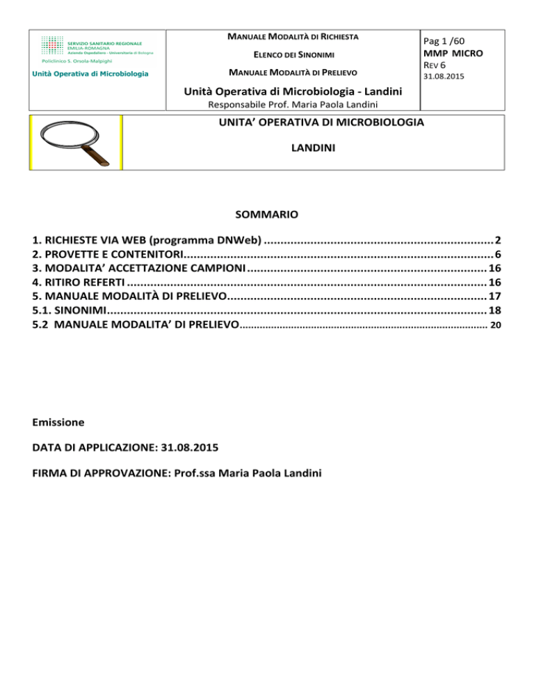 MANUALE MODALITÀ DI RICHIESTA ELENCO DEI SINONIMI MANUALE MODALITÀ DI PRELIEVO Unità Operativa di Microbiologia Pag 1 /60 MMP MICRO REV 6 31.08.2015 Unità Operativa di Microbiologia - Landini Responsabile Prof. Maria Paola Landini UNITA’ OPERATIVA DI MICROBIOLOGIA LANDINI SOMMARIO 1. RICHIESTE VIA WEB (programma DNWeb) .....................................................................2 2. PROVETTE E CONTENITORI.............................................................................................6 3. MODALITA’ ACCETTAZIONE CAMPIONI........................................................................ 16 4. RITIRO REFERTI ............................................................................................................ 16 5. MANUALE MODALITÀ DI PRELIEVO.............................................................................. 17 5.1. SINONIMI.................................................................................................................. 18 5.2 MANUALE MODALITA’ DI PRELIEVO ....................................................................................... 20 Emissione DATA DI APPLICAZIONE: 31.08.2015 FIRMA DI APPROVAZIONE: Prof.ssa Maria Paola Landini MANUALE MODALITÀ DI RICHIESTA ELENCO DEI SINONIMI Unità Operativa di Microbiologia MANUALE MODALITÀ DI PRELIEVO Pag 2 /60 MMP MICRO REV 6 31.08.2015 Unità Operativa di Microbiologia - Landini Responsabile Prof. Maria Paola Landini Il presente manuale riporta indicazioni utili per la corretta compilazione delle richieste e la gestione (modalità di prelievo, contenitori, orari di accettazione) dei campioni da inviare all’UO di Microbiologia. 1. RICHIESTE VIA WEB (programma DNWeb) Le figure successive sono rappresentative di videate utilizzabili per richieste microbiologiche col software DNWeb. Per le modalità di utilizzo del programma vedi istruzioni operative sul portale aziendale. Sono indispensabili: codice utente e password. Sezione A Policlinico S.Orsola-Malpighi Nella sezione A, sono raccolte le analisi eseguibili su sangue/liquor per la ricerca di anticorpi/antigeni batterici, fungini, virali, ecc. La scelta degli esami avviene mediante la spunta della casella relativa. MANUALE MODALITÀ DI RICHIESTA ELENCO DEI SINONIMI Unità Operativa di Microbiologia MANUALE MODALITÀ DI PRELIEVO Pag 3 /60 MMP MICRO REV 6 31.08.2015 Unità Operativa di Microbiologia - Landini Responsabile Prof. Maria Paola Landini Sezione B Routine su materiali vari - sono raccolte le analisi microbiologiche più frequenti. È, inoltre, possibile selezionare la combinazione di flaconi per emocoltura più rispondente al caso clinico. La scelta degli esami avviene mediante la spunta della casella relativa. Colture in flaconi – necessari per l’invio di materiali particolarmente sensibili (provenienti da cavità chiuse, raccolti e fatti pervenire al laboratorio in tempi più lunghi del normale, ecc.) Per la selezione dell’indagine: - cliccare sul nome dell’analisi voluta (essa appare su sfondo blu) - cliccare sul nome del materiale (se si vuol essere certi di scegliere un materiale idoneo, occorre cliccare sulla piccola icona a forma di libro e controllarne la presenza) - infine, se necessario, selezionare la provenienza del materiale. MANUALE MODALITÀ DI RICHIESTA ELENCO DEI SINONIMI Unità Operativa di Microbiologia MANUALE MODALITÀ DI PRELIEVO Pag 4 /60 MMP MICRO REV 6 31.08.2015 Unità Operativa di Microbiologia - Landini Responsabile Prof. Maria Paola Landini Sezione C Altre indagini batteriologiche - sono raccolte tutte le altre analisi microbiologiche possibili. Ricerca Parassiti – Si richiede il preventivo contatto telefonico col settore di laboratorio interessato vista l’ altissima inappropriatezza di questa richiesta. Ricerche Virologiche - sono raccolte tutte le altre analisi virologiche possibili. MANUALE MODALITÀ DI RICHIESTA ELENCO DEI SINONIMI Unità Operativa di Microbiologia MANUALE MODALITÀ DI PRELIEVO Pag 5 /60 MMP MICRO REV 6 31.08.2015 Unità Operativa di Microbiologia - Landini Responsabile Prof. Maria Paola Landini Sezione D Protocolli speciali - sono raccolte indagini non routinarie, ad alto costo e che necessitano di personale specializzato e tempi di esecuzione lunghi: sono riservate ad accordi particolari tra il richiedente e il laboratorio della Microbiologica che eseguirà il test. Valutazione sterilità cellule e tessuti – destinata solo ad alcuni reparti (Ematologia, Trasfusionale…) che hanno intrapreso un percorso di validazione interna con la Microbiologia. Per la selezione dell’indagine: cliccare sul nome dell’analisi voluta (essa appare su sfondo blu) cliccare sul nome del materiale (se si vuol essere certi di scegliere un materiale idoneo, occorre cliccare sulla piccola icona a forma di libro) infine, se ritenuto utile, selezionare la provenienza. MANUALE MODALITÀ DI RICHIESTA ELENCO DEI SINONIMI Unità Operativa di Microbiologia MANUALE MODALITÀ DI PRELIEVO Pag 6 /60 MMP MICRO REV 6 31.08.2015 Unità Operativa di Microbiologia - Landini Responsabile Prof. Maria Paola Landini Screening per Rischio Biologico – SOLO previo contatto telefonico seguendo le procedure/protocolli aziendali. Gli esami sierologici in urgenza sul paziente fonte e richiedibili h 24, 7gg/7 sono: HBsAg, HCV Ab, HIV Ag/Ab N.B. Ogni Zona (Nord, Centro, Sud, Imola, IOR, ecc.) utilizza pagine specifiche, dove gli esami microbiologici rappresentano solo una sezione, configurata in base alle esigenze degli utilizzatori. 2. PROVETTE E CONTENITORI Le provette vacutainer in uso in Microbiologia, sono differenziate in funzione degli esami richiedibili. La suddivisione per provetta è segnalata per ciascuna analisi nel Manuale Modalità di Prelievo. Il numero e la tipologia di contenitori/provette da inviare è correlato al numero di etichette stampate dal software utilizzato. LE PROVETTE SONO RICHIEDIBILI A CURA DEI VARI REPARTI/AMBULATORI DELL’AOSP ATTRAVERSO IL PORTALE SSO ALLA 
