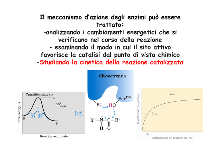 Il meccanismo d’azione degli enzimi può essere trattato: -analizzando i cambiamenti energetici che si verificano nel corso della reazione - esaminando il modo in cui il sito attivo favorisce la catalisi dal punto di vista chimico -Studiando la cinetica della reazione catalizzata CINETICA CHIMICA Lo studio del tempo che impiega un sistema di reazione a raggiungere lo stato di equilibrio permette di capire come avviene una reazione e in che modo la si può influenzare. Scopo della CINETICA CHIMICA è studiare la velocità di una trasformazione chimica (velocità di reazione) e i fattori che la influenzano, determinare il meccanismo della reazione, ossia l’insieme degli stadi elementari (eventi a livello molecolare) attraverso i quali si compie la reazione. Velocità di reazione Per studiare la velocità di una reazione chimica e i fattori che la governano occorre definire una grandezza determinabile sperimentalmente che possa essere assunta come misura della velocità stessa. Si consideri una reazione in fase omogenea, si supponga che sia spontanea (∆G < 0) e che il sistema di reazione si trovi ancora lontano dall’equilibrio. Se si analizzano le variazioni nelle quantità di reagente (R) e di prodotto (P) nel tempo, si ottiene La velocità di una reazione diminuisce progressivamente al procedere della reazione (la pendenza della tangente alla curva diminuisce). EQUAZIONE CINETICA Velocità di reazione L’ equazione cinetica o legge cinetica esprime la dipendenza della velocità di una reazione dalle concentrazioni dei reagenti • k è la costante di velocità • m ed n sono coefficienti che possono essere pari a zero, numeri interi o frazionari, il cui valore può essere determinato solo sperimentalmente. • Ogni coefficiente determina l’ ordine di reazione, rispetto al proprio componente • la somma m+n determina l'ordine globale della reazione. EQUAZIONE CINETICA aA + bB → prodotti k = costante di velocità o costante cinetica v = k (cA)m (cB)n m = ordine della reazione rispetto al reagente A n = ordine della reazione rispetto al reagente B m + n = ordine complessivo della reazione può succedere che m = a e n = b, anche se spesso m e n sono diversi dai coefficienti stechiometrici di A e B Le unità di misura della costante cinetica dipendono dall’ordine della reazione v = c t–1 = k cm+n Primo ordine k = c t–1/c = t–1 Secondo ordine k = c t–1/c2 = c–1 t–1 Terzo ordine k = c t–1/c3 = c–2 t–1 (s–1) (mol–1 L s–1) (mol–2 L2 s–1) Reazione reversibile di primo ordine k1 [A ]← → [B ] k -1 -v= d [A ] = - k 1 [A ] + k - 1 [B] dt k1 e k-1= costanti di velocità di I ordine all’equilibrio le velocità delle reazioni nei due sensi diventano eguali e la velocità complessiva pari a 0 0 = - k 1 [A ] eq + k - 1 [B] eq [B] [A] eq eq k1 = =K k -1 K = costante di equilibrio In una reazione reversibile di I ordine, K (costante di equilibrio) è pari al rapporto tra le costanti di velocità delle due reazioni Reazione reversibile di primo ordine K = costante di equilibrio pari al rapporto delle costanti di velocità delle due reazioni ORDINE DI REAZIONE A+B 1° ordine 1° ordine 2° ordine X X X P A B AB PSEUDOPRIMORDINE A + B lenta C veloce B + P Se le reazioni sono costituite da una successione di processi elementari, ciascuno è caratterizzato da una propria velocità. La velocità complessiva della reazione è determinata dalla velocità dello stadio più lento che determina quindi la velocità dell’intera reazione CINETICA CHIMICA: riepilogo m n ordine di reazione legge cinetica 0 0 0 1 0 1 s–1 0 1 1 s–1 2 0 2 mol–1 L s–1 1 1 2 mol–1 L s–1 k adimensionale Cinetica enzimatica 1913: Michaelis e Menten approccio cinetico basato su: assunzione del “quasi equilibrio” (“equilibrio rapido”) assunzione della velocità iniziale DIPENDENZA DELLA VELOCITÀ DI REAZIONE DALLA CONCENTRAZIONE DI SUBSTRATO k1 k2 k3 EQUAZIONE DI MICHAELIS-MENTEN: assunzioni 1) [S] >> [E] (importanza della velocità iniziale,Vo, ovvero la velocità misurata prima che il 10% del substrato si sia consumato) 2) Il complesso enzima-substrato è in equilibrio con l'enzima libero ed il substrato. Questa situazione di equilibrio non è disturbata dalla formazione del prodotto (k3 trascurabile). 3) La dissociazione di ES in E + P è la tappa limitante v0 = k3 [ES] REAZIONE CATALIZZATA DA ENZIMI k1 k3 k2 Equazione di Michaelis-Menten v0 = Vmax [S] KM +[S] Descrive la variazione della velocità di una reazione catalizzata da un enzima al variare della concentrazione di substrato ed è un’ iperbole rettangolare avente come asintoto Vmax. 1925: Briggs e Haldane Assunzione dello “stato stazionario” d[ES]/dt = 0 durante tutto il periodo di tempo in cui si possono misurare delle velocità iniziali il complesso ES rimane costante perchè la velocità con cui il complesso ES si forma a partire da E+S è uguale alla somma delle velocità con cui si scinde a dare E+P ed E+S. ( k3 non trascurabile rispetto a k2 ). Derivazione dell’equazione di assunzione dello stato stazionario Michaelis-Menten: Assunzioni: -[S] >> [E] in modo tale che la formazione del complesso ES non alteri significativamente la concentrazione iniziale di S -La velocità della reazione inversa (E + P→ES) è trascurabile -Stato stazionario: [ES] costante k1 k3 k2 Quando [S] >>[E], la velocità della reazione è proporzionale alla concentrazione di ES La dissociazione di ES in E + P è la tappa limitante v0 = k3 [ES] k1 k3 v0 = k3 [ES] (tappa limitante) k2 Stato stazionario: [ES] è costante nel tempo; le velocità di formazione e di dissociazione del complesso ES sono uguali. K1 [E] [S] = k2 [ES] + k3 [ES] K1 [E] [S] = (k2 + k3) [ES] [E] [S] = k2 + k3 [ES] k1 [E] = [Et] – [ES] KM [E] [S] = KM [ES] ([Et] –[ES]) [S] = KM [ES] Stato stazionario k1 k3 v0 = k3 [ES] k2 ([Et] –[ES]) [S] = KM [ES] ([Et] –[ES]) [S] = KM[ES] v0 = k3[Et][S] KM +[S] k3[Et] = Vmax ([Et] [S]) –[ES][S] = KM[ES] [ES] (KM + [S