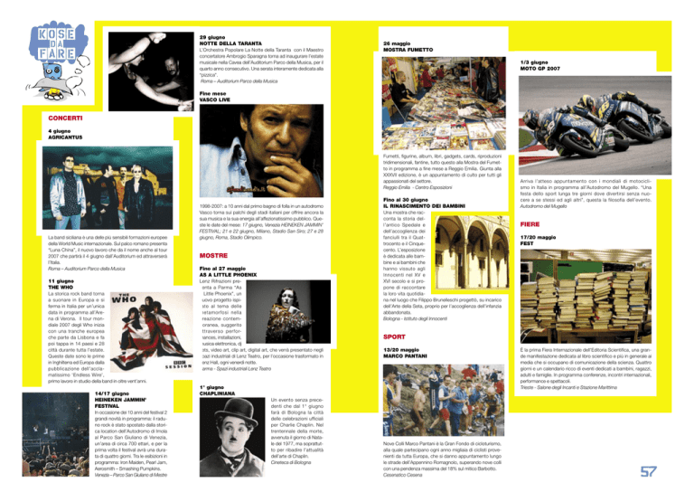 kose da fare 29 giugno NOTTE DELLA TARANTA L’Orchestra Popolare La Notte della Taranta con il Maestro concertatore Ambrogio Sparagna torna ad inaugurare l’estate musicale nella Cavea dell’Auditorium Parco della Musica, per il quarto anno consecutivo. Una serata interamente dedicata alla “pizzica”. Roma – Auditorium Parco della Musica 26 maggio MOSTRA FUMETTO 1/3 giugno MOTO GP 2007 Fine mese VASCO LIVE CONCERTI 4 giugno AGRICANTUS Fumetti, figurine, album, libri, gadgets, cards, riproduzioni tridimensionali, fantine, tutto questo alla Mostra del Fumetto in programma a fine mese a Reggio Emilia. Giunta alla XXXVII edizione, è un appuntamento di culto per tutti gli appassionati del settore. Reggio Emilia - Centro Esposizioni La band siciliana è una delle più sensibili formazioni europee della World Music internazionale. Sul palco romano presenta “Luna China”, il nuovo lavoro che da il nome anche al tour 2007 che partirà il 4 giugno dall’Auditorium ed attraverserà l’Italia. Roma – Auditorium Parco della Musica 11 giugno THE WHO La storica rock band torna a suonare in Europa e si ferma in Italia per un’unica data in programma all’Arena di Verona. Il tour mondiale 2007 degli Who inizia con una tranche europea che parte da Lisbona e fa poi tappa in 14 paesi e 28 città durante tutta l’estate. Queste date sono le prime in Inghilterra ed Europa dalla pubblicazione dell’acclamatissimo ‘Endless Wire’, primo lavoro in studio della band in oltre vent’anni. 14/17 giugno HEINEKEN JAMMIN’ FESTIVAL In occasione dei 10 anni del festival 2 grandi novità in programma: il raduno rock è stato spostato dalla storica location dell’Autodromo di Imola al Parco San Giuliano di Venezia, un’area di circa 700 ettari, e per la prima volta il festival avrà una durata di quattro giorni. Tra le esibizioni in programma: Iron Maiden, Pearl Jam, Aerosmith – Smashing Pumpkins. Venezia – Parco San Giuliano di Mestre 1998-2007: a 10 anni dal primo bagno di folla in un autodromo Vasco torna sui palchi degli stadi italiani per offrire ancora la sua musica e la sua energia all’affezionatissimo pubblico. Queste le date del mese: 17 giugno, Venezia HEINEKEN JAMMIN’ FESTIVAL; 21 e 22 giugno, Milano, Stadio San Siro; 27 e 28 giugno, Roma, Stadio Olimpico. MOSTRE Fino al 27 maggio AS A LITTLE PHOENIX Lenz Rifrazioni presenta a Parma “As a Little Phoenix”, un nuovo progetto ispirato al tema delle metamorfosi nella creazione contemporanea, suggerito attraverso performances, installazioni, musica elettronica, dj sets, video art, clip art, digital art, che verrà presentato negli spazi industriali di Lenz Teatro, per l’occasione trasformato in Lenz Hall, ogni venerdì notte. Parma - Spazi industriali Lenz Teatro Fino al 30 giugno IL RINASCIMENTO DEI BAMBINI Una mostra che racconta la storia dell’antico Spedale e dell’accoglienza dei fanciulli tra il Quattrocento e il Cinquecento. L’esposizione è dedicata alle bambine e ai bambini che hanno vissuto agli Innocenti nel XV e XVI secolo e si propone di raccontare la loro vita quotidiana nel luogo che Filippo Brunelleschi progettò, su incarico dell’Arte della Seta, proprio per l’accoglienza dell’infanzia abbandonata. Bologna - Istituto degli Innocenti FIERE 17/20 maggio FEST SPORT 13/20 maggio MARCO PANTANI 1° giugno CHAPLINIANA Un evento senza precedenti che dal 1° giugno farà di Bologna la città delle celebrazioni ufficiali per Charlie Chaplin. Nel trentennale della morte, avvenuta il giorno di Natale del 1977, ma soprattutto per ribadire l’attualità dell’arte di Chaplin. Cineteca di Bologna Arriva l’atteso appuntamento con i mondiali di motociclismo in Italia in programma all’Autodromo del Mugello. “Una festa dello sport lunga tre giorni dove divertirsi senza nuocere a se stessi ed agli altri”, questa la filosofia dell’evento. Autodromo del Mugello Nove Colli Marco Pantani è la Gran Fondo di cicloturismo, alla quale partecipano ogni anno migliaia di ciclisti provenienti da tutta Europa, che si danno appuntamento lungo le strade dell’Appennino Romagnolo, superando nove colli con una pendenza massima del 18% sul mitico Barbotto. Cesenatico Cesena È la prima Fiera Internazionale dell’Editoria Scientifica, una grande manifestazione dedicata al libro scientifico e più in generale ai media che si occupano di comunicazione della scienza. Quattro giorni e un calendario ricco di eventi dedicati a bambini, ragazzi, adulti e famiglie. In programma conferenze, incontri internazionali, performance e spettacoli. Trieste - Salone degli Incanti e Stazione Marittima 57 kose da fare dalle città kose da fare 58 59 ROMA 2/3 giugno RENATO ZERO dalle città ed artistiche. 7 gli artisti in mostra finalisti del premio Alcatel – Lucent che è primo partner del Mese Europeo della Fotografia. Museo Carlo Bilotti Fino al 3 giugno FESTIVAL INTERNAZIONALE DI ROMA momento che nasce come occasione per ricordare di fronte all´ opinione pubblica italiana “dignità e pari diritti, nel rispetto della Dichiarazione universale dei diritti umani, della Costituzione italiana, della Carta dei diritti fondamentali dell´Unione europea e nel rispetto del principio della laicità dello Stato italiano”. Roma di, Elisabetta Di Maggio, Giuseppe Gabellone, Giovanni Kronenberg e tanti altri. MAXXI, Museo nazionale delle arti del XXI secolo tato l’Iran delle guerre ma quello dei sentimenti, dell’amore, della religione. Museo di Roma in Trastevere MILANO Dall’8 giugno CAPOLAVORI DA SCOPRIRE Dal 29 maggio al 7 giugno CAOS da Belfast, in Irlanda, arriverà in Italia all’inizio di giugno. Ad accompagnarlo una band di 14 elementi con ballerini che si esibiranno su un palco in the round. DatchForum Fino al 3 giugno MUTATIONS I Quest’anno FotoGrafia ha scelto come tema centrale “Questione italiana”. Un’indagine sulla fotografia contemporanea in Italia, una riflessione approfondita per valorizzare una straordinaria “scu