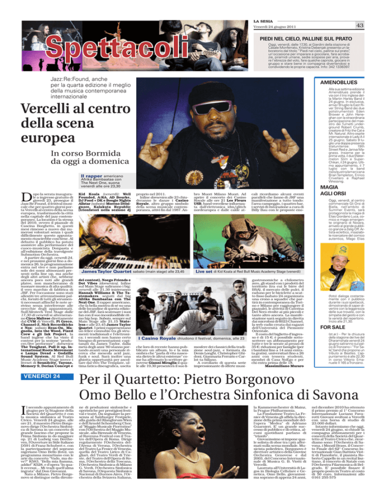 LA SESIA 43 Venerdì 24 giugno 2011 Spetta PIEDI NEL CIELO, PALLINE SUL PRATO Oggi, venerdì, dalle 17,30, ai Giardini della stazione di Casale Monferrato, Kristina Debenjak presenta un laboratorio dal titolo ”Piedi nel cielo, palline sul prato”, un’occasione per imparare a giocolare, fare acrobazie, piramidi umane, sedie sospese per aria, provare l’ebrezza del volo, fare qualche capriola, giocare in gruppo e stare bene in compagnia divertendosi e condividendo le proprie capacità. Info: 342 1338397. Jazz:Re:Found, anche per la quarta edizione il meglio della musica contemporanea internazionale AMENOBLUES Alla sua settima edizione Amenoblues prende il via con il trio inglese della Martin Harley Band il 24 giugno. In esclusiva, arriva l’8 luglio la East River String Band dei due polistrumentisti Eden Brower e John Heneghan con la straordinaria partecipazione del maestro dei fumetti underground Robert Crumb, creatore di Fritz the Cat e Mr. Natural. Altro ospite internazionale è Lady A il 25 giugno; Sabato 9 luglio una doppia presenza statunitense: 19th Street Red e Janiva Magness. Insieme per la prima volta, il duo Watermelon Slim e SuperChikan, il 24 giugno. Ultimo appuntamento, il 7 luglio con la band italo/austro/americana Brian Templeton, Enrico Crivellaro e Raphael Wressnig. Vercelli al centro della scena europea In corso Bormida da oggi a domenica Il rapper americano Afrika Bambaataa con The Next One, suona venerdì alle ore 23,30 D opo la serata inaugurale a ingresso gratuito di giovedì 23, prosegue il Jazz:Re:Found, il festival musicale che per quattro giorni porta Vercelli al centro della scena europea, trasformando la città nella capitale del jazz contemporaneo. La location è la stessa del 2010, ovvero il piazzale di Cascina Borghetto, in questi mesi rimesso a nuovo dai numerosi volontari senza i quali difficilmente questo appuntamento riuscirebbe così bene. Al debutto il pubblico ha potuto assistere alla performance del cuoco-musicista Donpasta e all’esibizione della travolgente Submotion Orchestra. A partire da oggi, venerdì 24, e nei prossimi giorni fino a domenica 26, la programmazione entra nel vivo e non parliamo solo dei nomi altisonanti presenti nella line up, ma anche degli altri artisti che, sebbene ancora poco noti alle grandi platee, non mancheranno di suonare musica di alta qualità: il vero marchio di fabbrica di JRF. Per l’occasione sono stati allestiti tre attrezzatissimi palchi, forniti di tutti gli strumenti necessari affinché le note arrivino senza interferenze alle orecchie degli appassionati. Sull’Afrotech Tent Stage dalle 17,30 di venerdì si alterneranno Circo Maltese direttamente dal CVM di Vercelli, Pi Greco, Channel-Z, Nick Recordkicks e Nox; sabato Reas-On, Magnolia, Into the Wood, Fixed Crew e gli Ink Project, la band inglese che ha vinto il contest per la sezione “producer/live performer”; domenica The Toughest, Pull it up, International Roots Movement e Lampa Dread + Godzilla Sound System. Al Red Bull Music Academy Stage invece i liveset di Soundcity, Tayone, Memory 9, Dorian Concept e VENERDÌ 24 I l secondo appuntamento di giugno per la Stagione della Società del Quartetto è con la musica sinfonica al Teatro Civico. Venerdì 24 giugno, alle ore 21, il maestro Pietro Borgonovo dirige l’Orchestra Sinfonica di Savona in un concerto di grande fascino che propone la Prima Sinfonia in do maggiore op. 21 di Ludwig van Beethoven, l’Ouverture in Stile Italiano D591 di Franz Schubert e, con la partecipazione del soprano nigeriano Omo Bello (foto), un programma mozartiano con le arie da concerto “Vado, ma dove?” K583, “Bella mia fiamma, addio!” K528, e d’opera “In quali eccessi... Mi tradì quell’alma ingrata” dal Don Giovanni. Nato a Milano, Pietro Borgonovo si distingue nella direzio- Kid Koala (venerdì); Well Founded, A:RA, AD Bourke, DJ Food + DK e Boogie Nights Allstar (sabato); Moreno Delsignore, Kalakuta Republic (trionfatori nella sezione dj proprio nel 2011. Infine domenica alle 23 chiuderanno le danze i Casino Royale, altro gruppo simbolo della scena musicale contemporanea, attivi fin dal 1987. An- James Taylor Quartet sabato (main stage) alle 23,45 del contest), Noego Friends e Dot Vibes (domenica). Infine sul Main Stage saliranno i big: venerdì alle 21,30 inizieranno Hannah Williams & The Tastemakers, seguiti dal big Afrika Bambaataa con The Next One. Il rapper americano, che fa bella mostra di sé su una delle locandine di questa edizione del JRF, farà scatenare i suoi fan con il suo inconfondibile ritmo hip hop. Sabato, sempre sul Main Stage alle 21,15 Stateless e alle 23,45 James Taylor Quartet. I primi rappresentano un felice connubio tra gli strumenti tradizionali e l’elettronica; i secondi non hanno certo bisogno di presentazioni: capitanati da James Taylor, dalla metà degli anni ’80 stanno portando avanti una personale ricerca che mescola acid jazz, funk e soul. Sarà inoltre una ghiotta opportunità per ascoltare dal vivo The Template, ultima fatica discografica, uscita bro Muori Milano Muori. Ad aprire il concerto dei Casino Royale alle ore 21 Les Fleurs USB, band vercellese influenzata dall’elettronica idm/glitch nordeuropea e dalle calde at- Oggi, venerdì, al centro commerciale Gli Orsi di Biella, nell’ambito di Summer Events, sarà protagonista la magia di Elias Giordano Luca, comico e mago emergente originario di Novara, arrivato al grande pubblico granzie a Zelig Off. Artista eclettico, insaziabile ricercatore del comico autentico, Mago Elias Live set di Kid Koala al Red Bull Music Academy Stage (venerdì) I Casino Royale chiudono il festival, domenica, alle 23 che loro di recente hanno pubblicato un album, Io e la mia ombra che “parla di vita nascosta dietro le altrui esistenze” come ha affermato lo scrittore genovese Gianni Miraglia il quale alle 19,30 presenterà il suo li- cali ricordiamo alcuni eventi paralleli che fanno di JRF una manifestazione a tutto tondo: l
