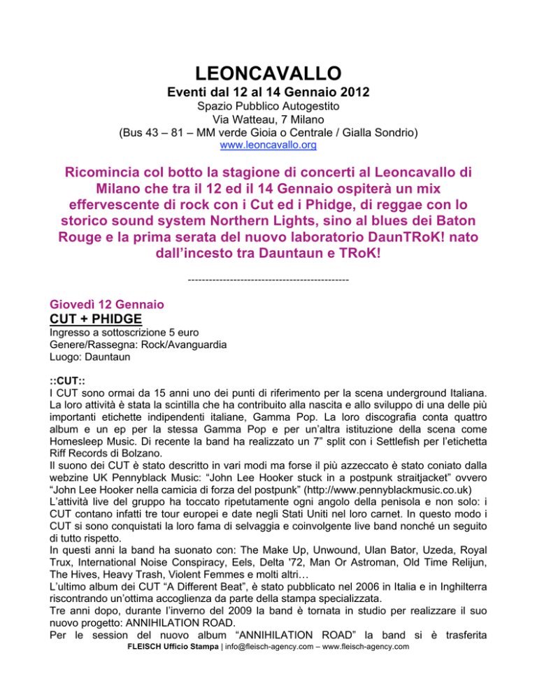 LEONCAVALLO Eventi dal 12 al 14 Gennaio 2012 Spazio Pubblico Autogestito Via Watteau, 7 Milano (Bus 43 – 81 – MM verde Gioia o Centrale / Gialla Sondrio) www.leoncavallo.org Ricomincia col botto la stagione di concerti al Leoncavallo di Milano che tra il 12 ed il 14 Gennaio ospiterà un mix effervescente di rock con i Cut ed i Phidge, di reggae con lo storico sound system Northern Lights, sino al blues dei Baton Rouge e la prima serata del nuovo laboratorio DaunTRoK! nato dall’incesto tra Dauntaun e TRoK! ---------------------------------------------- Giovedì 12 Gennaio CUT + PHIDGE Ingresso a sottoscrizione 5 euro Genere/Rassegna: Rock/Avanguardia Luogo: Dauntaun ::CUT:: I CUT sono ormai da 15 anni uno dei punti di riferimento per la scena underground Italiana. La loro attività è stata la scintilla che ha contribuito alla nascita e allo sviluppo di una delle più importanti etichette indipendenti italiane, Gamma Pop. La loro discografia conta quattro album e un ep per la stessa Gamma Pop e per un’altra istituzione della scena come Homesleep Music. Di recente la band ha realizzato un 7” split con i Settlefish per l’etichetta Riff Records di Bolzano. Il suono dei CUT è stato descritto in vari modi ma forse il più azzeccato è stato coniato dalla webzine UK Pennyblack Music: “John Lee Hooker stuck in a postpunk straitjacket” ovvero “John Lee Hooker nella camicia di forza del postpunk” (http://www.pennyblackmusic.co.uk) L’attività live del gruppo ha toccato ripetutamente ogni angolo della penisola e non solo: i CUT contano infatti tre tour europei e date negli Stati Uniti nel loro carnet. In questo modo i CUT si sono conquistati la loro fama di selvaggia e coinvolgente live band nonché un seguito di tutto rispetto. In questi anni la band ha suonato con: The Make Up, Unwound, Ulan Bator, Uzeda, Royal Trux, International Noise Conspiracy, Eels, Delta '72, Man Or Astroman, Old Time Relijun, The Hives, Heavy Trash, Violent Femmes e molti altri… L’ultimo album dei CUT “A Different Beat”, è stato pubblicato nel 2006 in Italia e in Inghilterra riscontrando un’ottima accoglienza da parte della stampa specializzata. Tre anni dopo, durante l’inverno del 2009 la band è tornata in studio per realizzare il suo nuovo progetto: ANNIHILATION ROAD. Per le session del nuovo album “ANNIHILATION ROAD” la band si è trasferita FLEISCH Ufficio Stampa | info@fleisch-agency.com – www.fleisch-agency.com temporaneamente a New York presso lo studio di MATT VERTA-RAY, chitarrista e socio di Jon Spencer negli Heavy Trash. L’idea di una collaborazione tra i CUT e MV-R è nata dopo aver condiviso il palco in occasione di un tour italiano degli Heavy Trash nel 2006. Del resto nel suo studio del Lower East Side Matt ha registrato artisti del calibro di Jon Spencer Blues Explosion, 20 Miles, Kid Congo Powers, Ronnie Spector, Andre Williams, Mick Collins, Mooney Suzuky, Robert Quine: nessuno sembrava più qualificato per catturare il suono dei CUT! Se Matt ha registrato e mixato il disco, il mastering è stato realizzato da Ivan Julian, ex chitarrista delle leggende del punk di New York “Richard Hell and the Voidoids”! Inutile dire che questo costituisce un’ulteriore punto d’orgoglio per la band… Questo album segna inoltre l’inizio della collaborazione tra i CUT e la Go Down Records, etichetta che da anni sta portando avanti la causa del rock and roll più sanguigno e potente, un contesto ideale per i CUT e per questo disco in particolare. Registrato come un live in studio nelle viscere di Manhattan, “Annihilation Road” conta infatti 14 tracce piene di energia e passione, brani che esplorano ogni sfumatura del suono dei CUT: dalle esplosioni garage alle angolarità del post punk, dalle tinte scure del blues alla disperazione del punk rock, questo è un album che esplode con un’urgenza e con un’intensità che spesso sembrano dimenticate nelle musica rock contemporanea. ::PHIDGE:: Esce per Riff Records il 06 gennaio 2012 We Never Really Came Back, il nuovo lavoro dei Phidge, autoritratto di un gruppo che riparte da zero, ma rinasce già maturo. Sono i Phidge 2.0, se vogliamo. Sempre i Phidge, ma poco o nulla che abbia a che fare con quello che di loro si conosceva fino a oggi. C'è un nuovo batterista, molto diverso dal precedente, il cui stile è caratterizzato da una fortissima personalità. E c'è una grandissima voglia da parte del resto del gruppo di dare un'impronta completamente nuova al proprio sound. E poi ci sono le esperienze, le cose capitate in questi anni e il modo in cui i Phidge ci hanno vissuto dentro. La ricerca del proprio posto nel mondo, la nostalgia, la perdita dei genitori, la ricerca dell'amore, lo sguardo su chi ci circonda, la voglia di andare avanti. Eccoli, contenitore e contenuto, significante e significato: storie sullo stare al mondo in una ciotola fatta di nuovi suoni. Questo è We Never Really Came Back. ---------------------------------------------- Venerdì 13 Gennaio NORTHERN LIGHTS + PUPPIES SOUND + BUSHKILLAH Ingresso a sottoscrizione libera Genere/Rassegna: Reggae Thursday Luogo: Foresta ::NORTHERN LIGHTS:: Il sound nasce nel 1999 a Udine. In 12 anni di attività, Northern Lights ha suonato in tutt’Italia e anche all’estero, partecipando ad eventi importanti come il Rototom Sunsplash e l’European FLEISCH Ufficio Stampa | info@fleisch-agency.com – www.fleisch-agency.com Dancehall Queen Contest. Nel 2003 Insieme ad altre realtà il sound entra a far parte della Far East Connection, associazione culturale per la diffusione di musica e cultura, fondamentalmente Reggae ed Hip-Hop. Dal 2006 inoltre organizzano il “Xmas War Clash”, al quale hanno partecipato i sound più talentuosi della penisola. Molti altri gli eventi che Nothern Lights ha organizzato e promosso come il concerto di Barrington Levy. Il sound friulano ha condiviso lo stage con artisti del calibro di Morgan Heritage, Capleton, Macka B, Frankie Paul