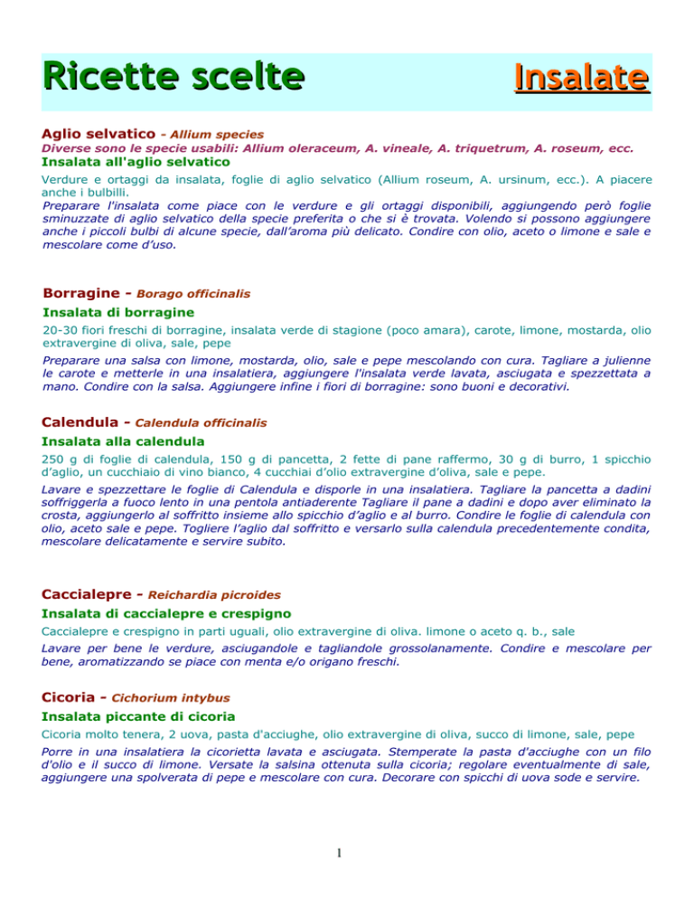 Ricette scelte Insalate Aglio selvatico - Allium species Diverse sono le specie usabili: Allium oleraceum, A. vineale, A. triquetrum, A. roseum, ecc. Insalata all'aglio selvatico Verdure e ortaggi da insalata, foglie di aglio selvatico (Allium roseum, A. ursinum, ecc.). A piacere anche i bulbilli. Preparare l'insalata come piace con le verdure e gli ortaggi disponibili, aggiungendo però foglie sminuzzate di aglio selvatico della specie preferita o che si è trovata. Volendo si possono aggiungere anche i piccoli bulbi di alcune specie, dall’aroma più delicato. Condire con olio, aceto o limone e sale e mescolare come d’uso. Borragine - Borago officinalis Insalata di borragine 20-30 fiori freschi di borragine, insalata verde di stagione (poco amara), carote, limone, mostarda, olio extravergine di oliva, sale, pepe Preparare una salsa con limone, mostarda, olio, sale e pepe mescolando con cura. Tagliare a julienne le carote e metterle in una insalatiera, aggiungere l'insalata verde lavata, asciugata e spezzettata a mano. Condire con la salsa. Aggiungere infine i fiori di borragine: sono buoni e decorativi. Calendula - Calendula officinalis Insalata alla calendula 250 g di foglie di calendula, 150 g di pancetta, 2 fette di pane raffermo, 30 g di burro, 1 spicchio d’aglio, un cucchiaio di vino bianco, 4 cucchiai d’olio extravergine d’oliva, sale e pepe. Lavare e spezzettare le foglie di Calendula e disporle in una insalatiera. Tagliare la pancetta a dadini soffriggerla a fuoco lento in una pentola antiaderente Tagliare il pane a dadini e dopo aver eliminato la crosta, aggiungerlo al soffritto insieme allo spicchio d’aglio e al burro. Condire le foglie di calendula con olio, aceto sale e pepe. Togliere l’aglio dal soffritto e versarlo sulla calendula precedentemente condita, mescolare delicatamente e servire subito. Caccialepre - Reichardia picroides Insalata di caccialepre e crespigno Caccialepre e crespigno in parti uguali, olio extravergine di oliva. limone o aceto q. b., sale Lavare per bene le verdure, asciugandole e tagliandole grossolanamente. Condire e mescolare per bene, aromatizzando se piace con menta e/o origano freschi. Cicoria - Cichorium intybus Insalata piccante di cicoria Cicoria molto tenera, 2 uova, pasta d'acciughe, olio extravergine di oliva, succo di limone, sale, pepe Porre in una insalatiera la cicorietta lavata e asciugata. Stemperate la pasta d'acciughe con un filo d'olio e il succo di limone. Versate la salsina ottenuta sulla cicoria; regolare eventualmente di sale, aggiungere una spolverata di pepe e mescolare con cura. Decorare con spicchi di uova sode e servire. 1 Ingrassabue - Chrysanhtemum segetum Diversi i nomi locali Insalata di ingrassabue Cime tenere e foglie di crisantemo campestre, uovo sodo, uno spicchio d’aglio, olio extra vergine di oliva, sale Pulire e lavare le cime tenere e le foglie di crisantemo campestre. Scolare molto bene, aggiungere all’insalata di crisantemo un uovo sodo a fettine ed uno spicchio di aglio sminuzzato il più possibile. Condire con olio extra vergine di oliva e sale Luppolo – Humulus lupulus Molti i nomi dialettali, come bruscandoli, luartìs, ecc. Insalata di erbe selvatiche Bruscandoli, tarassaco, ravanelli, valerianella, rucola, olio extra vergine di oliva, aceto di mele, sale In una ciotola aggiungere ai ravanelli tagliati a quarti le erbe ben lavare e asciugate. Condire immediatamente con una salsina preparata con sale olio extra vergine di oliva e poco aceto di mele. Misticanze di erbe Insalata di erbe di campo In ragione dei commensali: in parti più o meno uguali foglie tenere di malva, foglie tenere di piantaggine, foglie tenere di bietola selvatica, silene. Una piccola lattuga, un mazzetto di erbe aromatiche (finocchio, rosmarino, menta), una manciata di fiori di robinia, aceto di mele q. b, olio extra vergine di oliva, sale Tritare finemente le erbe aromatiche. Tagliare a listerelle sottili malva, piantaggine e bietole. Tagliare grossolanamente la lattuga. Mettere il tutto in una insalatiera e aggiungere silene. Condire olio, aceto e sale e mescolare per bene. Decorare con i fiori di robinia prima di portare in tavola. Insalata dei boschi Tarassaco, trifoglio, stridoli, erba cipollina, malva, crespino, fiori commestibili, olio, sale, aceto di calendula Pulire lavare ed asciugare accuratamente le erbe. Porle in una ciotola unitamente ai fiori e condire con olio, sale e aceto di calendula Insalata mista con fiori Una pianta di lattuga, tenere foglie di borragine, pratoline, malva, borsa del pastore, piantaggine, ecc.; fiori di robinia, pratoline, borragine, petali di rosa, una carota a julienne, pomodorini q. b., olio extravergine d'oliva, aceto di vino bianco, sale Alla base dell’insalata, costituita dalla lattuga, unire gli altri ortaggi e le foglie delle varie erbe selvatiche (più o meno quelle indicate). Condire con olio, aceto e sale secondo il gusto personale e decorare con i fiori. Piantaggine– Plantago lanceolata, P. major, P. coronopus Diversi sono i nomi comuni e diverse anche le specie di Plantago che si possono utilizzare. Insalata pratense Due parti di foglie tenere di tarassaco, una parte di foglie tenere di piantaggine, un ciuffo di erba cipollina, alcune foglie di menta, olio, aceto di mele, sale Pulire e lavare accuratamente le erbe, asciugandole con una centrifuga. Spezzettarle e porle in una insalatiera. Condire con olio, aceto di mele e sale. Profumare con menta fresca appena colta. 2 Porcellana - Portulaca oleracea Insalata con portulaca 1 Pomodori, cetrioli, cime di portulaca, olio aceto, sale E’ un'ottima insalata quella preparata con pomodori a tocchetti, fettine di cetriolo, foglie e cime tenere di porcellana, olio, aceto e sale. Valerianella– Valerianella locusta Insalatina gentile alla valerianella 300 g di valerianella, 100 g di formaggio tenero, uno o due scalogni, q. b. di olio extra vergine di oliva, succo di limone, sale e pepe Mettere la valerianella nei sin