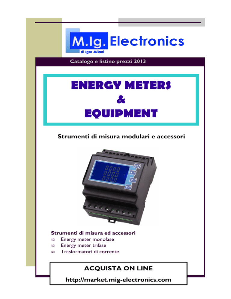 Catalogo e listino prezzi 2013 ENERGY METERS & EQUIPMENT Strumenti di misura modulari e accessori Strumenti di misura ed accessori • Energy meter monofase • Energy meter trifase • Trasformatori di corrente ACQUISTA ON LINE http://market.mig-electronics.com Pagina 2 SDM120D Il contatore digitale SDM120D è l’ideale per quadri monofase con poco spazio, infatti occupa un solo modulo DIN. Sul display LCD è possibile monitorare i consumi energetici (kWh). Non richiede l’utilizzo di trasformatori di corrente per la misura, ma un collegamento in linea. Specifiche tecniche Tensione operativa da 170V a 290V AC Massima tensione AC tollerata 2kV per 1 minuto Massimo tensione AC tollerata (picco) 6kV per 1µs Corrente di base (Ib) 5A Corrente nominale massima (Imax) 45A Range operativo di corrente Da (0.4% Ib) a Imax Massima corrente tollerata 30 volte Imax per 10ms Frequenza di lavoro 50Hz +/- 10% Consumo interno del dispositivo < 2W ( circa 10VA) Frequenza impulsi 1000 imp/kWh Display LCD Dimensioni 119 x 62 x 17.5 [mm] E-mail: store@mig-electronics.com Skype: mig-electronics Pagina 3 Caratteristiche e performance Umidità tollerata funzionamento operativo < 86% Umidità tollerata funzionalità memoria < 96% Temperatura tollerata funzionamento operativo da -20°C a +50°C Temperatura tollerata funzionalità memoria da –30°C a +70°C Standard IEC 62053-21 Classe di accuratezza 1.0 Classe di protezione IP51 Classe di isolamento II 1 2 3,4 6,7 Linea fase in ingresso Linea fase in uscita Linea del Neutro Uscita impulsi Pagina 4 SDM320C L’SDM320C è un contatore digitale da quadro elettrico per linee monofase; occupa 4 moduli DIN. Non necessita di trasformatori di corrente, quindi si inserisce direttamente sulla linea elettrica. Il valore del contatore dell’energia attiva (KWh) è disponibile sul display frontale. Il contatore può essere letto anche tramite la porta infrarossi integrata o la porta seriale su bus RS485. Questo permette di essere un valido strumento per il cliente che vuole tenere sotto controllo i suoi consumi, ma anche per chi vuole controllare da remoto il proprio contatore. Ottimo grado di isolamento e protezione, facile da installare. Specifiche tecniche Tensione operativa da 170V a 230V AC Massima tensione AC tollerata 2kV per 1 minuto Massimo tensione AC tollerata (picco) 6kV per 1µs Corrente di base (Ib) 1.5A / 5A / 10A Corrente nominale massima (Imax) 6A / 60A / 100A Range operativo di corrente Da (0.4% Ib) a Imax Massima corrente tollerata 30 volte Imax per 10ms Frequenza di lavoro 50Hz (60Hz) +/- 10% Consumo interno del dispositivo < 2W ( circa 10VA) Frequenza impulsi (morsetto 5 e 6) 12800 / 3200 / 1600 imp/kWh Porte di comunicazione per i dati RS485, infrarossi Dimensioni 130 x 76 x 65 [mm] E-mail: store@mig-electronics.com Skype: mig-electronics Pagina 5 Caratteristiche e performance Umidità tollerata funzionamento operativo < 86% Umidità tollerata funzionalità memoria < 96% Temperatura tollerata funzionamento operativo da -20°C a +50°C Temperatura tollerata funzionalità memoria da –30°C a +70°C Standard IEC 62053-21 Classe di accuratezza 1.0 Classe di protezione IP51 Classe di isolamento II Specifiche comunicazione Infrarosso Protocollo ModBusRTU con CRC a 16 bit Baudrate 1200 (default) Angolo di visibilità da –15° a +15° Lunghezza d’onda 900 - 1000 nm Distanza massima di comunicazione 5m Specifiche comunicazione RS485 Protocollo ModBusRTU con CRC a 16 bit Baudrate 1200(default), 2400, 4800, 9600 Range di indirizzi Da 0 a 247 Carico del bus Max 64 dispositivi per bus Lunghezza max bus 1000 m Parità EVEN (default), ODD, NONE Stop bit 1 Data bits 8 bit Pagina 6 SDM320MS L’SDM320MS è uno strumento completo di misura per linee monofase. Occupa 4 moduli DIN. Non necessita di trasformatori di corrente, quindi si inserisce direttamente sulla linea elettrica. Misura tutte le grandezze elettriche, disponibili sul display retroilluminato e su bus RS485, che lo rende integrabile a sistemi di monitoraggio e telecontrollo. Tra le grandezze misurata: tensione, corrente, fattore di potenza, potenza attiva, reattiva e apparente, contatore di energia attiva (kWh), di energia reattiva (kVArh). Questo strumento permette un telecontrollo completo di un impianto monofase Specifiche tecniche Tensione operativa da 170V a 300V AC Massima tensione AC tollerata 2kV per 1 minuto Massimo tensione AC tollerata (picco) 6kV per 1µs Corrente di base (Ib) 1.5A / 5A / 10A Corrente nominale massima (Imax) 6A / 60A / 100A Range operativo di corrente Da (0.4% Ib) a Imax Massima corrente tollerata 30 volte Imax per 10ms Frequenza di lavoro 50Hz (60Hz) +/- 10% Consumo interno del dispositivo < 2W ( circa 10VA) Frequenza impulsi (morsetto 5 e 6) 1600 imp/kWh (S0) Porte di comunicazione per i dati RS485 Dimensioni 130 x 100 x 76 [mm] E-mail: store@mig-electronics.com Skype: mig-electronics Pagina 7 Caratteristiche e performance Umidità tollerata funzionamento operativo < 86% Umidità tollerata funzionalità memoria < 96% Temperatura tollerata funzionamento operativo da -20°C a +50°C Temperatura tollerata funzionalità memoria da –30°C a +70°C Standard IEC 62053-21 Classe di accuratezza 1.0 Classe di protezione IP51 Classe di isolamento II Specifiche comunicazione RS485 Protocollo ModBusRTU con CRC a 16 bit Baudrate 2400, 4800, 9600 (default), 19200, 38400 Range di indirizzi Da 0 a 247 Carico del bus Max 64 dispositivi per bus Lunghezza max bus 1200 m Pagina 8 SDM630CT L’Energy Meter SDM630CT è l’ideale per impianti trifase (con e senza neutro) configurabile anche per quelli monofase. Richiede l’utilizzo di trasformatori di corrente, per impianti dove non possibile sezionare la linea. Tutte le grandezze elettriche sono disponibili sul display LCD e su porta seriale RS485, per l’interfacciamento con PC e sistemi per il tele contro ed il risparmio energetico. Tra le grandezze misurate (su singole fasi e totali): Tensioni - Correnti - Potenze attive - Potenze 
