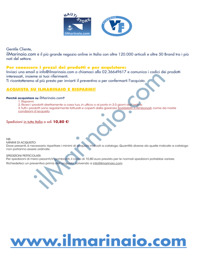 Gentile Cliente, ilMarinaio.com è il più grande negozio online in Italia con oltre 120.000 articoli e oltre 50 Brand tra i più noti del settore. om Per conoscere i prezzi dei prodotti e per acquistare: Inviaci una email a info@ilmarinaio.com o chiamaci allo 02.36649617 e comunica i codici dei prodotti interessati, insieme ai tuoi riferimenti. Ti ricontatteremo al più presto per inviarti il preventivo o per confermarti l'acquisto. ACQUISTA SU ILMARINAIO E RISPARMI! in a Spedizioni in tutta Italia a soli 10,80 €! io .c Perché acquistare su ilMarinaio.com? 1. Risparmi 2. Ricevi i prodotti direttamente a casa tua, in ufficio o al porto in 2-3 giorni dall’ordine. 3. Tutti i prodotti sono regolarmente fatturati e coperti dalla garanzia Soddisfatti o Rimborsati, come da nostre condizioni d’acquisto. ar NB: MINIMI DI ACQUISTO: Dove presenti, è necessario rispettare i minimi di acquisto indicati a catalogo. Quantità diverse da quelle indicate a catalogo non potranno essere ordinate. SPEDIZIONI PERTICOLARI: Per spedizioni di merci pesanti/ingombranti, il costo di 10,80 euro previsto per le normali spedizioni potrebbe variare. ilM Richiedeteci un preventivo prima dell’acquisto, scrivendo a info@ilmarinaio.com www.ilmarinaio.com Runner Ice-Maker Cooling Units > GB > Frigoriferi in corrente continua, congelatori, ice-maker, unità refrigeranti Refrigerators in Direct Current, Freezers, Ice Makers, Cooling Units in I ai o .c om Ocean Frigoríficos, congeladores, fabricadores de hielo y unidades refrigerantes de corriente continua ar > ilM E Vitrifrigo in ar ilM ai o om .c om ai o .c p. 4 Ocean > Frigoriferi e congelatori in corrente continua refrigerators and freezers Ocean Steel p. 20 > DC > Neveras y congeladores en corriente Ocean White p. 28 continua > Frigoriferi per autoveicoli > Refrigerators for vehicles > Nevera para vehículos motorizados p. 42 di ghiaccio > Fabbricatore maker > Ice > Fabricador de hielo ar in Runner p. 34 ilM Ice maker Cooling Units p. 46 > Unità refrigeranti, evaporatori e accessori > Cooling units, evaporators and accessories > Unidades refrigerantes, evaporadores y accesorios Vitrifrigo om Alceste Vitri I La Vitrifrigo Snc è stata fondata nel 1978 da Alceste Vitri, con l’obiettivo di produrre frigobar per l’arredamento ed appartiene alla “scuderia” del Gruppo Rivacold. Nel corso degli anni l’azienda ha poi sviluppato nuove linee di prodotto dedicate ad altri settori: nel 1985 viene introdotta la linea di frigoriferi e congelatori in corrente continua 12/24V. Da subito la linea venne equipaggiata con compressore Danfoss, componente sinonimo di garanzia ed efficienza, che ha contribuito a rendere la Vitrifrigo un marchio di alto prestigio. Nel 1988 viene sviluppata la produzione di frigobar ad assorbimento per hotel, i cui gruppi refrigeranti sono prodotti direttamente dall’azienda. Vengono successivamente introdotte le nuove linee di condizionatori e generatori di corrente ed una linea completa di frigoriferi trivalenti, con capacità da 40 a 150 litri, appositamente studiati per i veicoli ricreazionali. Alla luce di quanto sopra, oggi, la Vitrifrigo può essere considerata una delle aziende più complete su scala mondiale, nel settore della refrigerazione. Il continuo aggiornamento tecnologico, permette di fornire un prodotto sicuro, avanzato e conforme ai sempre più esigenti standard qualitativi mondiali: ogni frigorifero viene rigorosamente testato e collaudato, ed è infine conforme alla marcatura CE. Nell’ottica di un percorso da sempre orientato alla qualità, l’azienda ha ottenuto sin dal 1997, la certificazione UNI EN: ISO 9001. > GB Alceste Vitri founded Vitrifrigo Snc in 1978, with the aim of manufacturing minibars for the furniture industry. The company is part of the Rivacold Group “stable". Over the years, the company has developed new product lines that are dedicated to other areas: in 1985, it introduced a range of 12/24V DC refrigerators and freezers. From the very beginning, this range was equipped with the Danfoss compressor, a component that is synonymous with guaranteed efficiency and which has contributed to making Vitrifrigo a prestigious brand name. In 1988, Vitrifrigo began to produce absorption minibars for the hotel industry, for which it also manufactures the cooling units directly in house. These products have been followed by the introduction of ranges of air conditioners and power generators as well as a line of trivalent refrigerators with capacities ranging from 40 to 150 litres and specially devised for use in leisure vehicles. This is why we can say that today, Vitrifrigo can be considered one of the refrigerating industry’s most all-round companies on a world-wide scale. Continual technological upgrades allow the company to supply safe, cutting-edge products that always comply with the increasingly stringent world quality standards: each refrigerator is subjected to rigorous tests and inspections and always conforms to CE mark standards. As part of a company philosophy that is totally quality-orientated, Vitrifrigo has held UNI EN: ISO 9001 Quality System certification since 1997. > E ilM ar in ai o .c > 2 La Vitrifrigo Snc ha sido fundada en 1978 por Alceste Vitri, con el objetivo de producir frigobar para decoración de interiores, ésta pertenece a la "escudería" del Grupo Rivacold. Con el pasar de los años la empresa ha desarrollado nuevas líneas de productos destinados a otros sectores: en 1985 introducen la línea de neveras y congeladores en corriente contínua 12/24V. Desde un principio la línea aparece equipada con un compresor Danfoss, componente sinónimo de garantía y eficiencia, que ha contribuido en transformar la Vitrifrigo en una marca con un elevado prestigio. En 1988 se desarrolla la producción de frigobar por absorción para hoteles, con grupos de refrigeración producidos directamente por la misma empresa. Más adelante introducen también las nuevas líneas de climatizadore