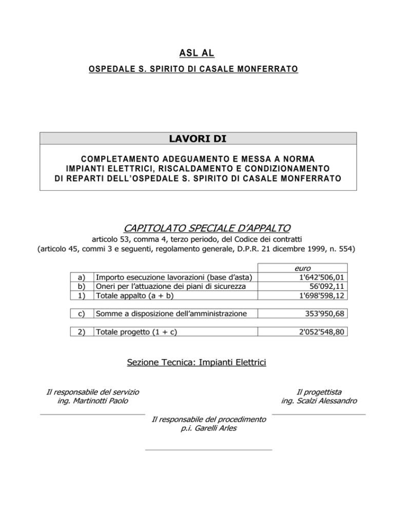 ASL AL OSPEDALE S. SPIRITO DI CASALE MONFERRATO LAVORI DI COMPLETAMENTO ADEGUAMENTO E MESSA A NORMA IMPIANTI ELETTRICI, RISCALDAMENTO E CONDIZIONAMENTO DI REPARTI DELL’OSPEDALE S. SPIRITO DI CASALE MONFERRATO CAPITOLATO SPECIALE D’APPALTO articolo 53, comma 4, terzo periodo, del Codice dei contratti (articolo 45, commi 3 e seguenti, regolamento generale, D.P.R. 21 dicembre 1999, n. 554) euro a) b) 1) Importo esecuzione lavorazioni (base d’asta) Oneri per l’attuazione dei piani di sicurezza Totale appalto (a + b) c) Somme a disposizione dell’amministrazione 2) Totale progetto (1 + c) 1'642'506,01 56'092,11 1'698'598,12 353'950,68 2'052'548,80 Sezione Tecnica: Impianti Elettrici Il responsabile del servizio ing. Martinotti Paolo Il progettista ing. Scalzi Alessandro Il responsabile del procedimento p.i. Garelli Arles Az i e n d a S a n i t a r i a L o c a l e AS L AL Capitolato Speciale di Appalto – Parte II Specificazione delle prescrizioni tecniche: Impianto elettrico P.O. “S. Spirito di casale Monferrato” I N D I C E PREMESSA ………………….…………………………………………………… pag. 3 1. GENERALITA’ ………..…………………………………………....… pag. 6 1.1. CATEGORIA DELLE OPERE ……………………………… ……...………………….………………… pag. 6 1.2. SOLUZIONI TECNICHE ………………………………….….………………………………………….… pag. 7 2. REQUISITI RISPONDENZA A NORME, LEGGI E REGOLAM. pag. 3. IMPIANTO ELETTRICO ………………...…………………………. pag. 11 3.1. CLASSIFICAZIONE DEGLI AMBIENTI ………………………………………………………….……. pag. 11 3.2. SISTEMA ELETTRICO E MISURE DI PROTEZIONE ……...…………………….………………. pag. 12 3.3. PROTEZIONE CONTRO I CONTATTI DIRETTI ED INDIRETTI .…………………….………. pag. 13 3.4. PROTEZIONE CONTRO LE SOVRACORRENTI …….….………………………………..……..…. pag. 14 3.5. CONNESSIONI ELETTRICHE E COLLEGAMENTO EQUIPOTENZIALE ..…………………… pag. 14 3.6. ALMENTAZIONE DI SICUREZZA ….….………………………………………………………..…… pag. 15 3.7. PROTEZIONE CONTRO I PERICOLI DI INCENDIO …………………………………………..…. pag. 15 3.8. CARATTERISTICHE DEI COMPONENTI DEGLI IMPIANTI ……………………………………. pag. 15 4. CRITERI DI VALUTAZIONE ………………………………………. pag. 58 5. VERIFICA DEGLI IMPIANTI ……………….……………………… pag. 59 5.1. RAPPORTO DI VERIFICA ………………..……………………………………………………….…….. pag. 60 5.2. ESAME A VISTA …………………………………………………………………………………….………. pag. 60 5.3. MISURE E PROVE STRUMENTALI ……………………………………………………….…………… pag. 60 6. IMPIANTI ELETTRICI A SERVIZIO DEGLI IMPIANTI 7. 9 TECNOLOGICI ……………….………………………………………. pag. 61 DICHIARAZ. DI CONFORMITA’ ED ELABORATI TECNICI .. pag. 64 2 Az i e n d a S a n i t a r i a L o c a l e AS L AL Capitolato Speciale di Appalto – Parte II Specificazione delle prescrizioni tecniche: Impianto elettrico P.O. “S. Spirito di casale Monferrato” PREMESSA Il presente Capitolato Speciale deve essere adottato per la fornitura e posa in opera di impianti elettrici all’interno dei locali adibiti a degenza del Reparto di Medicina Generale e le utenze per la regolazione e circolazione dei fluidi nei corridoi di Reparto al P.R. dell’Ospedale S. Spirito di Casale Monferrato oltre alle alimentazioni elettriche per gli impianti tecnologici di produzione acqua refrigerata (assorbitore a bromuro di litio, torre e evaporativa, sistemi di pompaggio e adduzione fluidi), sottocentrali fluidi caldi e freddi nell’interrato, alimentazione U.T.A. ed estrazione, complete di regolazione, posizionate nel sottotetto. Per il Reparto di Medicina Generale la distribuzione principale verrà realizzata in esterno, nel controsoffitto del corridoio di reparto, con canale metallico. L’alimentazione al quadro generale di reparto proviene da quadro di bassa tensione esistente denominato quadro di padiglione e ubicato nel piano interrato, al di sotto del reparto in ristrutturazione. Dal quadro generale si dipartono sia le linee dorsali principali per gli ambulatori e locali di servizio che le linee dorsali per l’alimentazione delle camere di degenza. Come richiesto dall’Ufficio Tecnico del distretto ospedaliero S. Spirito di Casale Monferrato, per ogni degenza è stata prevista l’utilizzazione di un quadretto con interruttore magnetotermico differenziale da 25 A, Idn = 0,03 A, tipo “A” ad intervento istantaneo a protezione del circuito prese e di un interruttore magnetotermico differenziale da 16 A, Idn = 0,03 A a protezione del circuito luce. Poiché l’interruttore generale di camera è da 25 A ciascuna bipresa all’interno della camera di degenza deve essere singolarmente protetta con magnetotermico da 16 A. Alcuni locali del Reparto e precisamente i locali di “servizio multipli” sono alimentati da quadretto di zona installato a parete e contenente n. 2 interruttori magnetotermici differenziali da 25 A 2P 6kA curva C, classe AC. Per i locali destinati a sala visita, attesa e studio medico è stata prevista l’installazione di un centralino da parete contenente n. 2 interruttori magnetotermici differenziali In=25 A, 2P, 6 kA curva C e classe A per la protezione delle linee f.m. e classe A-C per la protezione della linea luce. Le linee dorsali verranno realizzate in cavo FG7(O)M1 oppure in cordina unipolare N07G9-K rispondente alle Norme CEI 20-22 III, a bassissima emissione di fumi e gas tossici in quanto in ambiente a maggior rischio in caso di incendio; le derivaz