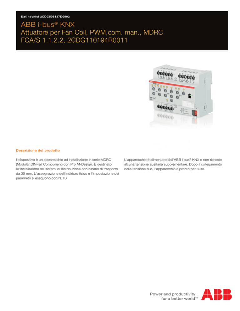 Dati tecnici 2CDC508137D0902 ABB i-bus® KNX Attuatore per Fan Coil, PWM,com. man., MDRC FCA/S 1.1.2.2, 2CDG110194R0011 Descrizione del prodotto Il dispositivo è un apparecchio ad installazione in serie MDRC (Modular DIN-rail Component) con Pro M-Design. È destinato all‘installazione nei sistemi di distribuzione con binario di trasporto da 35 mm. L‘assegnazione dell‘indirizzo fisico e l‘impostazione dei parametri si eseguono con l‘ETS. L‘apparecchio è alimentato dall‘ABB i bus® KNX e non richiede alcuna tensione ausiliaria supplementare. Dopo il collegamento della tensione bus, l‘apparecchio è pronto per l‘uso. ABB i-bus® KNX Attuatore per Fan Coil,PWM, com. man., MDRC FCA/S 1.1.2.2, 2CDG110194R0011 Technische Daten Tensione del bus 21…32 V CC Potenza assorbita, bus < 12 mA Potenza dissipata, bus Maximal 250 mW Potenza dissipata, apparecchio Maximal 3,05 W* * La massima potenza dissipata dell'apparecchio Collegamento KNX 0,25 W risulta dai seguenti dati: Relè 16 A 1,0 W Relè 6 A 0,6 W Uscite elettroniche 1,2 W KNX Tramite morsetto di collegamento bus Ingressi/uscite Con morsetti a vite Morsetto a vite Morsetto a vite con testa combinata (PZ 1) Alimentazione Collegamenti Morsetti di collegamento 0,2…4 mm² rigido, 2 x (0,2…2,5 mm²) 0,2…6 mm² rigido, 2 x (0,2…4 mm²) Manicotto terminale senza/con boccola in plastica Senza: 0,25…2,5 mm² Con: 0,25…4 mm² Manicotto terminale TWIN 0,5…2,5 mm² Lunghezza terminale di contatto almeno 10 mm Elementi keypad Anziehdrehmoment Max. 0,6 Nm Raster 6,35 Tasto/LED Per l'assegnazione dell'indirizzo fisico Tasto /, LED Per la commutazione tra comando manuale/ comando tramite ABB i-bus® KNX e visualizzazioni Tasto Uscita H / commutatore H Per commutare e visualizzare Tasto livello ventilatore E, F, G Per commutare i singoli livelli ventilatore LED E, F, G Per visualizzare il livello ventilatore 1, 2, 3 Tasto A, B, C, D Per aprire/chiudere la valvola LED A, B, C, D Per visualizzare la posizione della valvola Tasto / LED Per commutare e visualizzare Tasto / LED Per commutare e visualizzare Tasto / LED Per commutare e visualizzare Tipo di protezione IP 20 A norma DIN EN 60 529 Classe di protezione II A norma DIN EN 61 140 Categoria di isolamento Categoria di sovratensione III a norma DIN EN 60 664-1 Grado di sporcizia II a norma DIN EN 60 664-1 Bassissima tensione di sicurezza KNX SELV 24 V CC Campo di temperatura Esercizio -5 °C…+45 °C Trasporto -25 °C…+70 °C Magazzinaggio -25 °C…+55 °C Oltre +45 °C si riduce la durata di vita! Condizioni ambientali Max. umidità dell'aria 93 %, nessuna condensa consentita Design Apparecchio a installazione in serie (MDRC) Apparecchio a installazione modulare, ProM Dimensioni 108 x 90 x 64,5 mm (A x L x P) Larghezza d’installazione in TE 6 moduli da 18 mm Profondità d'installazione 64,5 mm Montaggio Su binario di trasporto 35 mm A norma DIN EN 60 715 Posizione d'installazione A piacere Peso 0,3 kg Alloggiamento/colore alloggiamento Plastica, grigio Omologazioni KNX a norma EN 50 090-1, -2 Marchio CE Secondo le direttive CEM e sulla bassa tensione 2 2CDC508137D0902 | FCA/S 1.1.2.2 Certificato ABB i-bus® KNX Attuatore per Fan Coil,PWM, com. man., MDRC FCA/S 1.1.2.2, 2CDG110194R0011 Tipo di apparecchio Applicazione FCA/S 1.1.2.2 Att. Fan Coil PWM M/...* Quantità massima Quantità massima Quantità massima oggetti di comunicazione indirizzi di gruppo assegnazioni 70 255 254 * … = numero di versione attuale dell‘applicazione. Consultare anche le informazioni software sulla nostra homepage. Nota Per la descrizione esauriente dell’applicazione, vedere il manuale di prodotto Attuatori per Fan Coil FCA/S. È disponibile gratuitamente su Internet all’indirizzo www.abb.com/knx. Per la programmazione sono necessari l’ETS e l’attuale programma applicativo dell‘apparecchio. L’attuale applicazione può essere scaricata dal sito www.abb.com/knx. Una volta importata nell‘ETS, l‘applicazione si trova nella finestra Cataloghi in Produttore/ABB/Riscaldamento, climatizzazione, ventilazione/Att. Fan Coil PWM M. L‘apparecchio non supporta la funzione di esclusione di un apparecchio KNX nell‘ETS. Se si blocca l‘accesso a tutti gli apparecchi del progetto mediante un Codice BCU, non si ottiene alcun effetto su questo apparecchio. È possibile continuare a rilevare i dati e programmare. FCA/S 1.1.2.2 | 2CDC508137D0902 3 ABB i-bus® KNX Attuatore per Fan Coil,PWM, com. man., MDRC FCA/S 1.1.2.2, 2CDG110194R0011 Uscite valvola (termoelettrico, PWM) Valori nominali Quantità 4, collegati a potenziale, protetti da cortocircuiti Un tensione nominale 24…230 V CA (50/60 Hz) In corrente nominale (per ciascuna coppia di uscita) 0,5 A Corrente continua 0,5 A carico resistivo con Tu fino a 20 °C 0,3 A carico resistivo con Tu fino a 60 °C Corrente di accensione Massimo 1,6 A, 10 s con Tu fino a 60 °C Tu = temperatura ambiente Carico minimo 0,5 VA per ogni uscita PWM Quantità 2, collegati a potenziale, protetti da cortocircuiti Uscite valvola (motorizzato, 3 punti) Valori nominali Un tensione nominale 24…230 V CA (50/60 Hz) In corrente nominale (per ciascuna coppia di uscita) 0,5 A Corrente continua 0,5 A carico resistivo con Tu fino a 20 °C 0,3 A carico resistivo con Tu fino a 60 °C Corrente di accensione Massimo 1,6 A, 10 s con Tu fino a 60 °C Tu = temperatura ambiente Carico minimo 0,5 VA per ogni uscita PWM Quantità 3 Ingressi Valori nominali A potenziale zero Richiesta contatto Corrente di scansione 1 mA Tensione di scansione 10 V 0…1.000 ohm, Resistenza PT100 Tecnica a 2 conduttori, PT1000 Tecnica a 2 conduttori, Una selezione di KT/KTY 1.000/2.000, Personalizzato Lunghezza della linea 4 2CDC508137D0902 | FCA/S 1.1.2.2 Risoluzione, precisione e tolleranze Vedere pagina successiva Tra sensore e ingresso dell’apparecchio Max. 30 m, semplice ABB i-bus® KNX Attuatore per Fan Coil,PWM, com. man., MDRC FCA/S 1.1.2.2, 2CDG110194R0011 Risoluzione, precisione e t