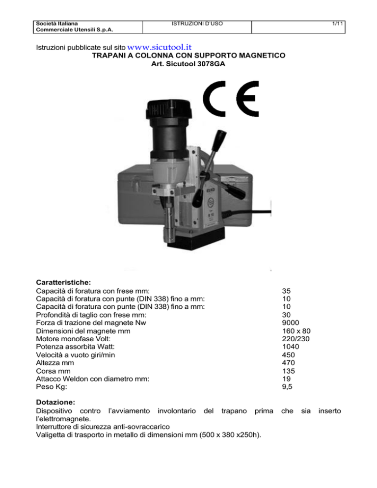 Società Italiana Commerciale Utensili S.p.A. ISTRUZIONI D’USO 1/11 Istruzioni pubblicate sul sito www.sicutool.it TRAPANI A COLONNA CON SUPPORTO MAGNETICO Art. Sicutool 3078GA Caratteristiche: Capacità di foratura con frese mm: Capacità di foratura con punte (DIN 338) fino a mm: Capacità di foratura con punte (DIN 338) fino a mm: Profondità di taglio con frese mm: Forza di trazione del magnete Nw Dimensioni del magnete mm Motore monofase Volt: Potenza assorbita Watt: Velocità a vuoto giri/min Altezza mm Corsa mm Attacco Weldon con diametro mm: Peso Kg: Dotazione: Dispositivo contro l’avviamento involontario del trapano prima l’elettromagnete. Interruttore di sicurezza anti-sovraccarico Valigetta di trasporto in metallo di dimensioni mm (500 x 380 x250h). 35 10 10 30 9000 160 x 80 220/230 1040 450 470 135 19 9,5 che sia inserto Società Italiana Commerciale Utensili S.p.A. ISTRUZIONI D’USO 2/11 Accessori: Adattatore per mandrini con attacco filettato UNF 1/2 x 20 Art. Sicutool O3078GA. Con questo adattatore si possono montare i seguenti mandrini da mm 13: Articoli Sicutool 1500G 13D, 1513G 13A, 1515 13C, 1517 13A. INDICAZIONI SULLA SICUREZZA ATTENZIONE: leggere assolutamente queste istruzioni prima di utilizzare la macchia. Le unità di foratura con magnete possono essere impiegate solo per l’utilizzo indicato. L’impiego con elettromagnete di sollevamento è pericoloso ed in ogni caso inammissibile. L’utilizzo per scopi diversi da quelli indicati può causare danni a persone ed oggetti. Osservate le seguenti indicazioni di sicurezza per utensili elettrici. ATTENZIONE: per l’utilizzo di utensili elettrici si devono sempre osservare i seguenti principi e provvedimenti di sicurezza, per proteggersi contro pericoli causati da errore, danneggiamento ed incendio elettrico. Leggete ed osservate queste indicazioni prima di utilizzare la macchina. 1. 2. 3. 4. 5. 6. 7. 8. 9. 10. 11. Tenete in ordine la Vostra zona di lavoro Il disordine nell’ambiente di lavoro comporta pericolo di infortunio. Prendete in considerazione l’influenza dell’ambiente Non esponete l’utensile elettrico alla pioggia. Non utilizzate utensili elettrici in presenza di bagnato o in ambienti umidi. Predisponete una buona illuminazione. Non utilizzate gli utensili elettrici in prossimità di liquidi combustibili o gas. Proteggetevi dalla scossa elettrica Evitate il contatto del corpo con masse a terra, ad esempio tubi, corpi riscaldanti, focolari, frigoriferi. Tenete lontano i bambini Non lasciate che altre persone entrino in contatto con l’utensile od il cavo, teneteli lontani dal Vostro ambiente di lavoro. Tenete il Vostro utensile elettrico in un luogo sicuro Gli utensili inutilizzati devono essere tenuti in luoghi asciutti, chiusi e lontano dalla portata dei bambini. Non sovraccaricate il Vostro utensile elettrico Lavorate meglio ed in modo più sicuro rispettando il campo di applicazione indicato. Utilizzate il giusto utensile elettrico Non usate utensili a potenza ridotta o adattatori per carichi pesanti. Non utilizzate l’utensile per scopi o lavori per i quali non è adatto. Indossate abbigliamento da lavoro adatto Non indossate abiti larghi od ornamenti. Potreste essere afferrati dalle parti mobili. Per lavorare all’esterno si raccomandano guanti di gomma e scarpe antinfortunistiche. Se avete i capelli lunghi legateli. Utilizzate occhiali di protezione Usate anche mascherine antipolvere per lavorare su materiali polverosi. Niente usi impropri dei cavi Non trascinate l’utensile per il cavo e non tirate il cavo per estrarre la spina dalla presa di corrente. Proteggete il cavo da calore, oli e bordi affilati. Assicurate che l’oggetto da lavorare sia fissato Società Italiana Commerciale Utensili S.p.A. 12. 13. ISTRUZIONI D’USO 3/11 Utilizzate tenditori o morse a vite per bloccare l’oggetto. In questo modo la tenuta è più sicura rispetto a quella delle vostre mani, inoltre avete la possibilità di impiegare entrambe le mani. Non piegatevi troppo sull’utensile Evitate posizioni anormali del corpo. Preoccupatevi di assumere una posizione sicura e mantenete sempre l’equilibrio. Eseguite la manutenzione del vostro utensile con accuratezza Tenete il vostro utensile pulito per poter lavorare meglio ed in modo più sicuro. Seguite le istruzioni di manutenzione e del cambio dell’utensile. Controllate regolarmente il cavo e fatelo cambiare da uno specialista in caso di guasto. Controllate regolarmente gli attacchi e sostituiteli in caso di guasto. 14. Estraete la spina Se non utilizzato, prima della manutenzione e al cambio dell’utensile. 15. Non lasciate inserita la chiave dell’utensile Controllate prima dell’avviamento che la chiave e l’utensile inserito siano stati rimossi. 16. Evitate l’avviamento involontario Non trasportate utensili collegati alla rete elettrica con il dito sull’interruttore. Assicuratevi che la spina sia disinserita dalla connessione alla rete elettrica. 17. Cavi elettrici di prolunghe all’aperto Usate solo prolunghe omologate ed espressamente contrassegnate per lavorare all’aperto. 18. Siate costantemente attenti Osservate il vostro lavoro. Procedete attentamente, non usate l’utensile quando non siete concentrati. 19. Tenete controllato il vostro utensile contro i danneggiamenti Prima di continuare ad utilizzare l’utensile dovete controllare accuratamente il perfetto e preciso funzionamento dell’impianto di elettrico e delle parti meccaniche. Controllate se il funzionamento delle parti mobili è regolare, se non siano bloccate, se nessuna parte è rotta, se tutte le altre parti sono perfette, montate correttamente e se tutte le altre condizioni che possono influenzare il funzionamento dell’utensile corrispondono. Parti e dispositivi elettrici danneggiati devono essere riparati e sostituiti in modo appropriato se non è indicato diversamente nelle istruzioni. Gli interruttori danneggiati devono essere sostituiti. 20. Attenzione Per la v