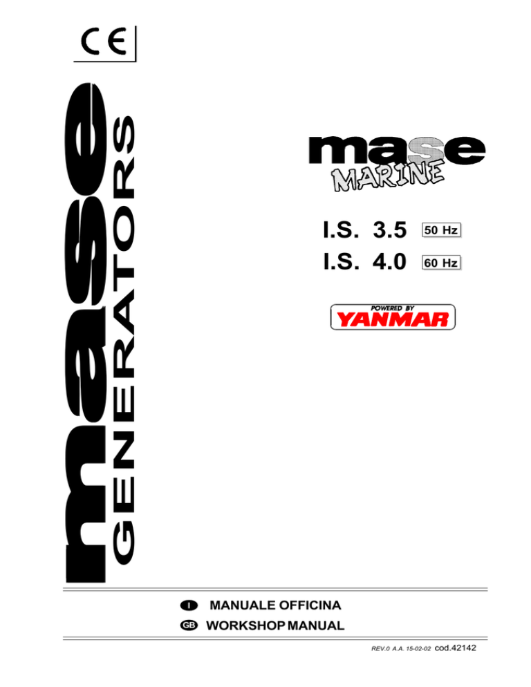 mase GENERATORS I.S. 3.5 I.S. 4.0 I MANUALE OFFICINA GB WORKSHOP MANUAL 50 Hz 60 Hz REV.0 A.A. 15-02-02 cod.42142 IS 3.5 - 4.0 INDICE I GB Index Indice 1 1.1 Identificazione della macchina .............. 5 Composizione dei gruppi elettrogeni ........... 5 1 1.1 Machine identification........................5 Generators composition .......................... 5 2 TABELLA ATTREZZI .................................. 9 2 TOOL TABLE .......................................... 9 3 3.1 3.1.1 3.1.2 3.1.3 3.1.4 3.2 3.2.1 3.2.2 3.2.3 3.3 ALTERNATORE ........................................ Statore ...................................................... Avvolgimenti di potenza ............................. Avvolgimenti di eccitazione ....................... Termostato alternatore .............................. Avvolgimenti di carica batteria ................... Rotore ....................................................... Avvolgimento di rotore (n°2) ...................... Diodi rotore (n°2) ....................................... Varistori rotore (n°2) .................................. Condensatori ............................................ 13 15 15 17 17 19 21 21 23 23 25 3 3.1 3.1.1 3.1.2 3.1.3 3.1.4 3.2 3.2.1 3.2.2 3.2.3 3.3 ALTERNATOR ..................................... Stator .................................................... Power windings ..................................... Excitation windings ............................... Alternator thermostat ............................ 13 15 15 17 17 Battery charger windings ................ 19 Rotor ..................................................... 21 Rotor winding (n°2) ............................... 21 Rotor diodes (n°2) ................................. 23 Rotor varistors (n°2) ............................ 23 Capacitors ............................................ 25 4 4.1 4.2 4.3 4.4 4.5 4.6 MOTORE .................................................. Caratteristiche tecniche ............................ Manutenzione ........................................... Tavola guasti ............................................. Combustibile ............................................. Pompa gasolio elettrica ............................ Lubrificazione ............................................ 27 25 28 30 35 37 39 4 4.1 4.2 4.3 4.4 4.5 4.6 ENGINE ................................................ Technical features ................................. Maintenance ......................................... Trouble-shooting ................................... Fuel ...................................................... Electric diesel fuel pump ...................... Lubrication ............................................ 27 25 28 30 35 37 39 5 5.1 5.2 5.3 SENSORI ................................................. 41 Termostato testata motore aperto ............. 41 Termostato motore a circuito chiuso (mare)43 Pressostato olio ........................................ 45 5 5.1 5.2 5.3 SENSORS ............................................ Closed-circuit engine thermal switch .... Open-circuit engine thermostat (sea) .... Oil pressure switch ............................... 41 41 43 45 6 6.1 6.2 6.3 6.4 RAFFREDDAMENTO ................................ Impianto “acqua mare/circuito chiuso" ...... Pompa acqua ........................................... Cinghia pompa acqua ............................... Scambiatore di calore acqua/aria .............. 47 47 49 51 53 6 6.1 6.2 6.3 6.4 SEA WATER COOLING ....................... Seawater/closed-circuit system ............ Water pump .......................................... Water pump belt ................................... Water/air heat exchanger ...................... 47 47 49 51 53 7 7.1 7.2 7.3 7.4 7.5 REGOLAZIONI ......................................... Regolazione dei giri .................................. Regolazione serrature e maniglie .............. Pulizia filtro aria motore ............................ Controllo livello olio ................................... Pulizia filtro olio motore ............................ 55 55 57 59 61 61 7 7.1 7.2 7.3 7.4 7.5 ADJUSTMENTS ................................... 55 Rpm adjustment ................................... 55 Lock and handle adjustment ................. 57 Engine air filter cleaning .................. 59 Level oil check ...................................... 61 Engine oil filter cleaning ........................ 61 8 8.1 8.1.1 8.2 8.3 8.4 8.5 8.6 8.7 8.8 IMPIANTO ELETTRICO ........................... Circuito di comando .................................. Cavo multipolare ....................................... Elettrovalvola ............................................. Interruttore termico (AC circuit breaker) .... Cablaggio motore ...................................... Caricabatteria ........................................... Fusibile ..................................................... Motorino avviamento ................................. Batteria ..................................................... 63 63 69 71 73 75 77 79 81 83 8 8.1 8.1.1 8.2 8.3 8.4 8.5 8.6 8.7 8.8 ELECTRICAL SYSTEM ........................ Command circuit .................................. Multicore cable ..................................... Stop solenoid ........................................ Thermal switch (AC circuit breaker) ........... Engine wiring ........................................ Battery charger ..................................... Fuse ..................................................... Starter motor ........................................ Battery .................................................. 9 9.1 9.2 9.3 SMONTAGGIO ......................................... 85 Rimozione della cassa .............................. 85 Rimozione alternatore ............................... 95 Rimozione del coperchio alternatore lato ...... cuscinetto ................................................. 97 Rimozione dello statore ............................ 99 R