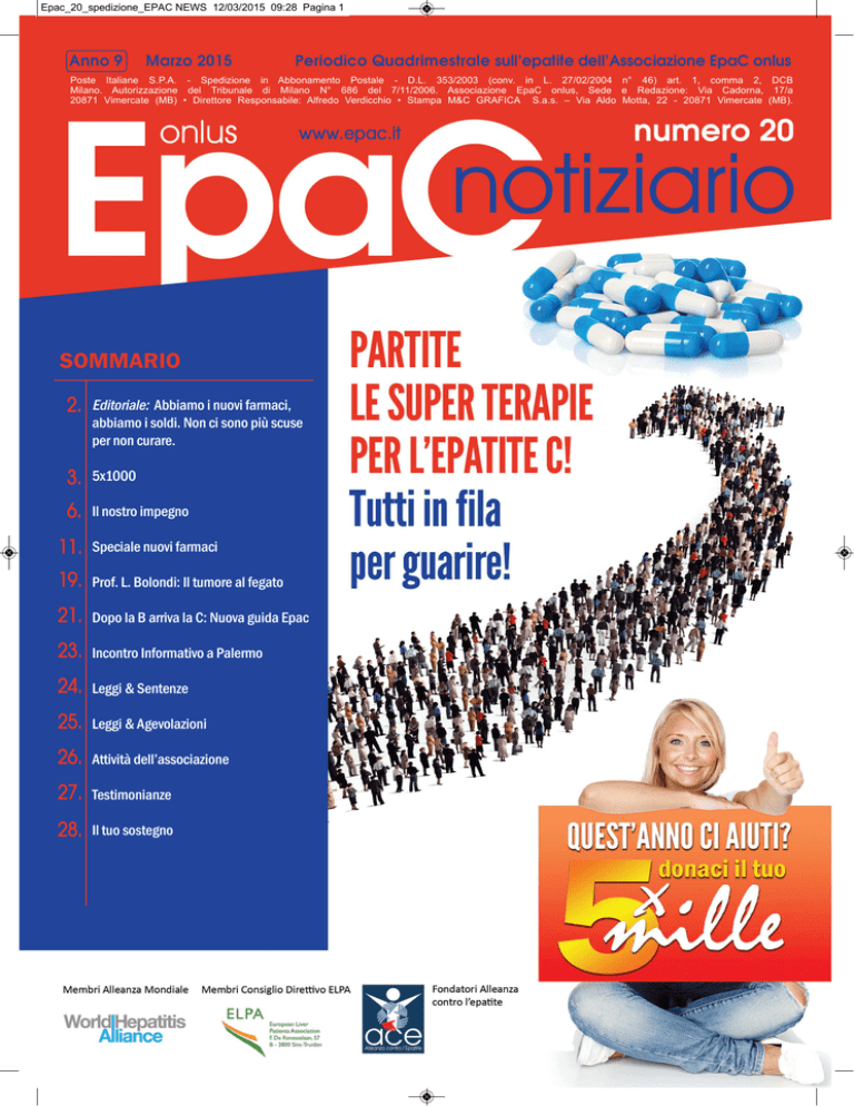 Epac_20_spedizione_EPaC NEWs 12/03/2015 09:28 Pagina 1 Poste Italiane s.P.a. - spedizione in abbonamento Postale - D.L. 353/2003 (conv. in L. 27/02/2004 n° 46) art. 1, comma 2, DCB Milano. autorizzazione del Tribunale di Milano N° 686 del 7/11/2006. associazione EpaC onlus, sede e Redazione: Via Cadorna, 17/a 20871 Vimercate (MB) • Direttore Responsabile: alfredo Verdicchio • stampa M&C GRaFICa s.a.s. – Via aldo Motta, 22 - 20871 Vimercate (MB). SOMMARIO 2. Editoriale: Abbiamo i nuovi farmaci, abbiamo i soldi. Non ci sono più scuse per non curare. 3. 5x1000 6. Il nostro impegno 11. Speciale nuovi farmaci 19. Prof. L. Bolondi: Il tumore al fegato 21. Dopo la B arriva la C: Nuova guida Epac 23. Incontro Informativo a Palermo 24. Leggi & Sentenze 25. Leggi & Agevolazioni 26. Attività dell’associazione 27. Testimonianze 28. Il tuo sostegno Epac_20_spedizione_EPaC NEWs 12/03/2015 09:28 Pagina 2 EDITORIALE Abbiamo i nuovi farmaci, abbiamo i soldi. Non ci sono più scuse per non curare. di Ivan Gardini Finalmente le cure con i nuovi farmaci sono partite in tutte le regioni, e si è concretizzato un grande traguardo che abbiamo inseguito giorno dopo giorno, battaglia dopo battaglia! Purtroppo, come era prevedibile, i problemi di accesso sono ancora tanti. al momento possono accedere alle nuove terapie soltanto alcune categorie di pazienti, quelli con malattia più avanzata. Questo può avere un senso logico per un tempo limitato di alcuni mesi, giusto il tempo di curare i pazienti molto urgenti. Dopodichè, il provvedimento assume una natura discriminatoria e come tale lo tratteEsiste innanzitutto un problema logistico: impossibile curemo con le autorità competenti. In altre parole, il nostro rare decine di migliaia di persone contemporaneamente, obiettivo sarà di consentire l’accesso illimitato a a meno che la prescrizione dei nuovi tutti nel 2016 e dovranno essere farmaci non sia allargata ai mei centri a gestire eventuali liste di dici di famiglia. attesa. “C’è un vero progresso solo E’ quindi evidente che i reparti quando i vantaggi Abbiamo calcolato che ci sono autorizzati alla somministradi una nuova tecnologia attualmente circa 200.000 pazione dei nuovi farmaci antivirali zienti da curare e pertanto ci diventano per tutti” devono “modulare” l’accesso pare importante prendere atto alle nuove terapie, cercando di Henry Ford della grande complessità nel cucurare per primi i pazienti più urrare tutti e velocemente. genti, in pericolo di vita. Ma, come sempre, la nostra associazione sarà inflessiQuesto non deve significare rifiutare le terapie, ma sembile verso coloro che abusano della pazienza e ragioneplicemente programmare e concordare il trattamento tevolezza dei pazienti e denuncerà alle autorità tutti quei rapeutico insieme al paziente con la certezza che in casi in cui sarà messa in pericolo la vita dei malati o che nessun modo, posticipare la cura, porti a un’aggravaostacolano la loro pronta guarigione. Ci è stato affidato mento della malattia poiché ciò sarebbe inaccettabile. questo compito dal Ministero della Salute e potete stare Poi esiste un problema economico: I soldi sono stati certi che lo porteremo avanti senza esitazione. stanziati, ricordiamo 1 miliardo di Euro per curare 50.000 pazienti, ma manca il decreto di ripartizione dei fondi. Senza quel decreto le regioni sono costrette ad “anticipare” cifre importanti, non facili da reperire tutte Ricordatevi di sostenerci con il vostro e subito. Proprio su questo punto abbiamo insistito che 5 x 1000: ci consente di continuare le ci sia la massima celerità da parte dei Ministeri coinvolti nostre battaglie quotidiane a favore di (Ministero della Salute e delle Finanze) affinchè i soldi arrivino fisicamente alla regioni per consentire ad esse tutti coloro che stanno aspettando le loro cure. Dimostrateci concretamente di acquistare i farmaci che servono e non con il il contache il nostro lavoro è apprezzato! gocce come sta avvenendo ora. Infine un problema di natura discriminatoria: è noto che 2. Epac_20_spedizione_EPaC NEWs 12/03/2015 09:29 Pagina 3 DONACI IL TUO 5xMILLE! AIUTACI! PERIODICO QUADRIMESTRALE SULL’EPATITE DELL’ASSOCIAZIONE EPAC ONLUS 3. Epac_20_spedizione_EPaC NEWs 12/03/2015 09:29 Pagina 4 DONACI IL TUO 5xMILLE! AIUTACI! 4. Epac_20_spedizione_EPaC NEWs 12/03/2015 09:29 Pagina 5 DONACI IL TUO 5xMILLE! AIUTACI! PERIODICO QUADRIMESTRALE SULL’EPATITE DELL’ASSOCIAZIONE EPAC ONLUS 5. Epac_20_spedizione_EPaC NEWs 12/03/2015 09:29 Pagina 6 DONACI IL TUO 5xMILLE! AIUTACI! 6. Epac_20_spedizione_EPaC NEWs 12/03/2015 09:29 Pagina 7 IL NOSTRO IMPEGNO Nuovi farmaci epatite C: Il nostro impegno In questi mesi l’Associazione EpaC si è prodigata per fare in modo che nuovi farmaci anti epatite C fossero disponibili per i pazienti, e che ci fosse l’adeguata copertura economica. E’ stato – e lo è tuttora – uno sforzo enorme in termini di personale e risorse, anche per rispondere alle decine di richieste che giungono quotidianamente. Siamo comunque orgogliosi dei risultati ottenuti sinora, tra mille difficoltà, muri da abbattere, indifferenza, inefficienza e burocrazia-killer. Qui di seguito vi raccontiamo le attività più importanti che abbiamo svolto nell’interesse di tutti i pazienti. Pensiamo di avere lavorato bene, perché anche le Istituzioni Sanitarie più autorevoli si sono accorte delle nostre capacità e professionalità e sono ora ampiamente disponibili al dialogo e alla collaborazione. Epatite C: anche su segnalazione di EpaC onlus il Ministro Lorenzin invia I NAS nelle regioni per accertamenti Mercoledì 11 febbraio: EpaC onlus scrive una nota al Comandante Generale dei NAS (Comando Carabinieri per la tutela della salute) segnalando che 4 regioni non hanno ancora provveduto a nominare i centri autorizzati a dispensare il sofosbuvir e che tale inadempienza viola Il Decreto Legge 158/2012, art. 10 comma 2 il quale specifica che le regioni e le province auto