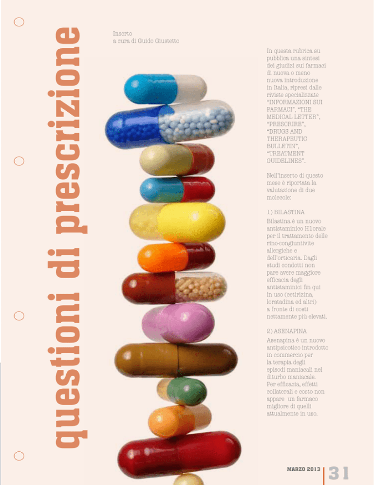 questioni di prescrizione Inserto a cura di Guido Giustetto In questa rubrica su pubblica una sintesi dei giudizi sui farmaci di nuova o meno nuova introduzione in Italia, ripresi dalle riviste specializzate “INFORMAZIONI SUI FARMACI”, “THE MEDICAL LETTER”, “PRESCRIRE”, “DRUGS AND THERAPEUTIC BULLETIN”, “TREATMENT GUIDELINES”. Nell’inserto di questo mese è riportata la valutazione di due molecole: 1) BILASTINA Bilastina è un nuovo antistaminico H1orale per il trattamento delle rino-congiuntivite allergiche e dell’orticaria. Dagli studi condotti non pare avere maggiore efficacia degli antistaminici fin qui in uso (cetirizina, loratadina ed altri) a fronte di costi nettamente più elevati. 2) ASENAPINA Asenapina è un nuovo antipsicotico introdotto in commercio per la terapia degli episodi maniacali nel diturbo maniacale. Per efficacia, effetti collaterali e costo non appare un farmaco migliore di quelli attualmente in uso. marzo 2013 31 questione di prescrizione Da Prescrire 2011, 31 n° 338 Indicazioni: trattamento sintomatico della rino-congiuntivite allergica (stagionale e perenne) e dell’orticaria. Antistaminici per uso sistemico - R06AX29 Posologia: Adulti ed adolescenti sopra i 12 anni: una compressa al dì un’ora prima o 2 ore dopo i pasti o l’assunzione di succhi di frutta. Ayrinal® Menarini Per i pazienti affetti dai sintomi di una rinite allergica o di un’orticaria, gli antistaminici H1 orali detti non sedativi e non atropinici come la loratadina o la cetirizina hanno un’efficacia modesta. In Francia la bilastina s’aggiunge ad un’offerta già pletorica. Nella rinite allergica l’efficacia della bilastina è simile a quella di altri di altri antistaminici H1 detti non sedativi e non atropinici, secondo tre studi comprendenti 2052 pazienti in totale. è disponibile uno studio nella sola orticaria comprendente 525 pazienti. Il suo profilo circa gli effetti indesiderati è simile agli altri antiH1, con la prevalenza di effetti neuropsichici. Non si è visto allungamento importante dell’intervallo ST ma la distanza prospettica non è ancora sufficiente per escludere questo rischio. La bilastina è un substrato della glicoproteina P e di altri trasportatori molecolari, circostanza che comporta delle possibili interazioni farmacologiche. Il cibo ed il succo di pompelmo diminuiscono la biodisponibilità di circa il 30%. Il farmaco non va assunto in gravidanza perché ancora troppo poco studiato. In pratica meglio proseguire nell’utilizzo di antistaminici più collaudati. Robilas® Menarini Da Dialogo sui farmaci 6/2012 Bilastina è il nono antistaminico sistemico entrato in commercio per il trattamento della rinocongiuntivite allergica e dell’orticaria. La sua efficacia è stata confrontata rispetto a 3 farmaci delle stessa classe: cetirizina, levocetirizina e desloratadina. • In tre studi su un totale di 2.055 pazienti con rinocongiuntivite allergica, bilastina ha mostrato, dopo 2 o 4 settimane di trattamento, un’efficacia sovrapponibile ai suoi comparator in termini di riduzione della severità dei sintomi nasali e oculari, ed è risultata superiore a placebo. • Nell’unico studio su 525 pazienti affetti da orticaria, bilastina ha mostrato, rispetto a desloratadina, un effetto simile dopo 4 settimane di trattamento nel miglioramento della gravità dei 3 sintomi tipici della patologia: prurito, numero e grandezza dei ponfi, ed è risultata superiore a placebo. • Bilastina è risultata ben tollerata, con un profilo di sicurezza sovrapponibile a desloratadina e levocetirizina. Rispetto a cetirizina, con bilastina si è registrata una minore incidenza di sonnolenza e di astenia, mentre è risultata maggiore l’incidenza di cefalea. • Nell’uso a lungo termine (1 anno) sono state osservate con bilastina anomalie cardiache (aritmie sinusali, 1,4%) e prolungamenti del tratto QT (2,9%), eventi che non si erano rilevati negli studi a breve termine. Il costo di 30 giorni di trattamento con bilastina 20 mg/die è pari a € 15,75, a totale carico del paziente, circa il doppio rispetto a desloratadina 5 mg/die (€ 6,20), e il triplo di cetirizina 10 mg/die e di levocetirizina 5 mg/die (€ 5,40), tutti farmaci in classe A, Nota 89. ¢ 32 bilastina marzo 2013 20 cpr 20 mg euro 10,50 Classe C Tipo di ricetta: RR Registrazione: mutuo riconoscimento Da Informazione sui farmaci 4/12 Proprietà farmacologiche L’asenapina è un antipsicotico registrato tramite procedura centralizzata europea nel trattamento degli episodi maniacali associati al disturbo bipolare. In Europa, contrariamente a quanto avvenuto negli Stati Uniti (dopo votazione a maggioranza), l’asenapina non ha ottenuto la registrazione nel trattamento della schizofrenia. Come la maggior parte degli antipsicotici di seconda generazione, l’asenapina è un antagonista dei recettori dopaminergici D2 e dei recettori serotoninergici 5-HT2A2. Ai suoi effetti clinici possono contribuire anche le azioni su altri recettori della dopamina e della serotonina, così come sui recettori alfa2-adrenergici. Somministrata per via orale, l’asenapina ha una biodisponibilità molto bassa (inferiore al 2%) per un marcato effetto di primo metabolismo epatico. Quando il farmaco viene posto sotto la lingua, la sua biodisponibilità è del 35%, con concentrazioni ematiche massime entro 0,5-1,5 ore. La scheda tecnica (RCP) raccomanda di evitare di mangiare o bere nei 10 minuti che seguono l’assunzione del farmaco. L’eliminazione è prevalentemente urinaria (50% circa) e fecale (40%). L’emivita terminale è di circa 24 ore. Nei pazienti con disfunzione epatica di grado lieve-moderato (Classe A e B di Child-Pugh), i parametri farmacocinetici della asenapina non differiscono da quelli dei pazienti con funzionalità epatica normale. Nei soggetti con grave compromissione epatica (Classe C di ChildPugh), è stato invece osservato un incremento 7 volte superiore della esposizione al farmaco. Dopo un