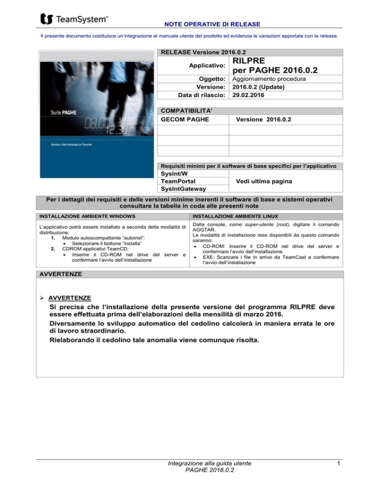 NOTE OPERATIVE DI RELEASE Il presente documento costituisce un’integrazione al manuale utente del prodotto ed evidenzia le variazioni apportate con la release. RELEASE Versione 2016.0.2 Applicativo: Oggetto: Versione: Data di rilascio: COMPATIBILITA’ GECOM PAGHE RILPRE per PAGHE 2016.0.2 Aggiornamento procedura 2016.0.2 (Update) 29.02.2016 Versione 2016.0.2 Requisiti minimi per il software di base specifici per l’applicativo SysInt/W TeamPortal SysIntGateway Vedi ultima pagina Per i dettagli dei requisiti e delle versioni minime inerenti il software di base e sistemi operativi consultare la tabella in coda alle presenti note INSTALLAZIONE AMBIENTE WINDOWS INSTALLAZIONE AMBIENTE LINUX L’applicativo potrà essere installato a seconda della modalità di distribuzione. 1. Modulo autoscompattante “autoinst”: Selezionare il bottone “installa” 2. CDROM applicativi TeamCD: Inserire il CD-ROM nel drive del server e confermare l’avvio dell’installazione Dalla console, come super-utente (root), digitare il comando AGGTAR. Le modalità di installazione rese disponibili da questo comando saranno: CD-ROM: Inserire il CD-ROM nel drive del server e confermare l’avvio dell’installazione EXE: Scaricare i file in arrivo da TeamCast e confermare l’avvio dell’installazione AVVERTENZE AVVERTENZE Si precisa che l’installazione della presente versione del programma RILPRE deve essere effettuata prima dell’elaborazioni della mensilità di marzo 2016. Diversamente lo sviluppo automatico del cedolino calcolerà in maniera errata le ore di lavoro straordinario. Rielaborando il cedolino tale anomalia viene comunque risolta. Integrazione alla guida utente PAGHE 2016.0.2 1 NOTE OPERATIVE DI RELEASE Il presente documento costituisce un’integrazione al manuale utente del prodotto ed evidenzia le variazioni apportate con la release. INDICE Utility e funzioni varie ...................................................................................................................................... 3 RILPRE ............................................................................................................................................................ 3 Importazione presenze da rilevatore ....................................................................................................... 3 Integrazione alla guida utente PAGHE 2016.0.2 2 PAGHE – IMPLEMENTAZIONI Utility e funzioni varie RILPRE Importazione presenze da rilevatore Il comando RILPRE è stato implementato come di seguito descritto. È stato modificato il funzionamento di elaborazione delle presenze, per effettuare la liquidazione delle malattie generate dall’esecuzione automatica del programma CREMAL, direttamente nella mensilità in elaborazione. La sequenza delle operazioni eseguite dal programma è la seguente: 1. caricamento presenze; 2. esecuzione programma CREMAL; 3. sviluppo automatico del cedolino. È stata inserita la possibilità di non eseguire automaticamente, al termine dell’importazione delle presenze, il programma CREMAL e l’elaborazione del cedolino. A tal fine all’interno delle scelte “Elaborazione presenze” ed “Elaborazione presenze (formato OREPAGG)” sono stati inseriti i nuovi campi “Esegui CREMAL” ed “Crea cedolini”: Nel caso in cui l’utente non voglia eseguire le suddette elaborazioni in modo automatico è possibile rimuovere la valorizzazione dei nuovi campi. Integrazione alla guida utente PAGHE 2016.0.2 3 NOTE OPERATIVE DI RELEASE Il presente documento costituisce un’integrazione al manuale utente del prodotto ed evidenzia le variazioni apportate con la release. Tabella riepilogativa Sistemi Operativi supportati Aggiornata al 07/10/2015 Sistema Operativo Versione Windows XP Professional SP3 (1) 2003 Server SP2 (2) SBS 2003 Server SP2 (2) 2008 Server SP2 (3) 2008 R2 SP1 (3) SBS 2008 Server SP2 Windows 7 Professional SBS 2011 Server Server 2012, 2012 R2 8.1 Pro 64bit 10 Pro 64bit e 32bit TeamLinux 2.10 (4), 3.2, 4.2 Suse Linux Enterprise 11-SP1, 11-SP3 Server Ubuntu 12.4 LTS (6), 14.4 64bit LTS, 14.10 64bit, 15.04 64bit Fedora 20 64bit, 22 64bit CentOS 6.2(4), 6.4, 6.5, 6.6 64bit, 7 64bit Linux PowerPC OpenSuse 10.3 SLES 11.3 Release minime Software di Release minime Software di base base richieste da linea Lynfa richieste da linea Gecom e Gamma Plus Studio e Lynfa Azienda TeamPortal 20150400 Sysint/W 20140100 (5) e SysIntGateway 20150400 (5) e Runtime 812-20140200 (5) o Runtime 722-20090100 (5)(7) POLYEDRO 20150400 TeamPortal 20150400 Sysint/U 4.4 (5) e SysIntGateway 20150400 (5)(8) Runtime 812-20140200 (5) o Runtime 722-20090100 (5)(7) POLYEDRO 20150400 (1) Supporto al Sistema Operativo in fase di dismissione (termine improrogabile: Giugno 2016) ATTENZIONE: Sistema già dismesso da Microsoft (2) Supporto al Sistema Operativo in fase di dismissione (termine previsto: Giugno 2016) ATTENZIONE: Sistema già dismesso da Microsoft (3) ATTENZIONE: Le esperienze d’uso presso nostri Clienti e Partner ci danno indicazioni che in Terminal Server si possono presentare casuali rallentamenti nella visualizzazione/interazione di alcuni componenti grafici nelle maschere. A parità di hardware, impianto e operatività utente, il problema non si riscontra con S.O. Windows 2012R2 (Windows 2012R2, Remote Desktop Services Overview: https://technet.microsoft.com/en-us/library/hh831447.aspx) (4) Supporto al Sistema Operativo in fase di dismissione (termine previsto: Ottobre 2016) (5) Moduli di software di base non più necessari per ambienti Nativi Procedure Gestionali (6) Supporto al Sistema Operativo fino ad Aprile 2017 (7) Supporto al Runtime 722-20090100 in fase di dismissione (termine previsto: Giugno 2016) ATTENZIONE: Questa Runtime non è certificata per sistemi operativi successivi a Windows Server 2003 (8) Supporto SysintGateway Daemon dismesso Note : - Sono escluse tutte le versioni dei sistemi operativi destinate ad un’utenza ‘Home’ - La release dei moduli Acucobol 8