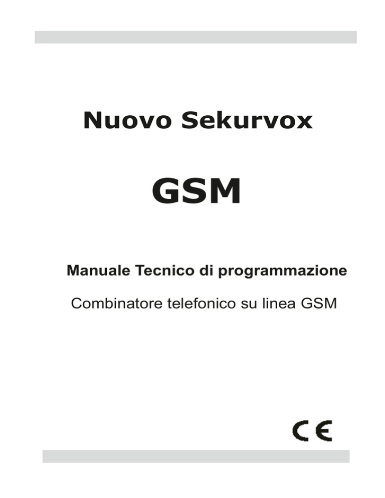 Nuovo Sekurvox GSM Manuale Tecnico di programmazione Combinatore telefonico su linea GSM 2 SOMMARIO 1.0 Introduzione........................................ ................4 2.0 Procedura di programmazione................................4 2.1 GESTIONE USCITE................................................4 2.2 PROGRAMMA........................................................5 2.2.1 - NUMERI DI TELEFONO.....................................5 2.2.2 CICLI DI CHIAMATA..........................................6 2.2.3 RIPETIZIONE MESSAGGIO.................................6 2.2.4 ASCOLTO MESSAGGIO......................................6 2.2.5 REGISTRAZIONE MESSAGGIO............................6 3.0 Nuovo PIN............................................. ................7 4.0 Livello Segnale....................................... ................7 5.0 Personalizzazione SMS.............................................7 6.0 Blocco combinatore.................................................7 7.0 Gestione tramite SMS............................... . . . . . . . . . . . . . . . . 8 7.1 STATO di Soppravivenza............................................8 7.2 GUASTI..........................................................8 7.3 GESTIONE USCITE..................................................9 7.4 SMS Verifica...........................................................9 8.0 Indicatori LED.............................................10 9.0 DESCRIZIONE MORSETTI......................................11 3 1.0 Introduzione Il SEKURVOX è un combinatore telefonico su linea GSM con le seguenti caratteristiche: Programmazione tramite menu vocale con telefono BCA in locale o in modalità remota effettuando una chiamata al numero della SIM 4 ingressi di allarme con messaggio vocale personalizzabile da 10'' su ciascun ingresso Rubrica di 9 numeri di telefono associabili ai 4 ingressi 4 messaggi SMS di allarme SMS di credito residuo SMS per mancanza alimentazione principale 4 uscite logiche attivabili da remoto Controllo automatico dello stato del modulo Uscita guasto Blocco delle chiamate da remoto o in locale tramite ingresso dedicato Squilli di chiamata per confermare attivazioni o comandi da SMS Alimentazione principale 12Vdc Batteria di backup 12V 1,3Ah (non inclusa) Contenitore in policarbonato ! ATTENZIONE ! PRIMA DI COMINCIARE - IL CODICE PIN DELLE SIM DEVE ESSERE DISABILITATO. Procedere quindi da un telefono cellulare alla disattivazione della richiesta PIN. - Alimentare il SEKURVOX dopo aver inserito la SIM nell'apposito slot. - Tutti gli inserimenti e i disinserimenti della SIM devono avvenire a combinatore spento. - DURANTE LE PROGRAMMAZIONI DEL COMBINATORE SEKURVOX VERRA' RICHIESTO L'INSERIMENTO DI UN PIN. IL PIN DI DEFAULT E' 12345 E FA RIFERIMENTO AL CODICE DI PROGRAMMAZIONE DEL COMBINATORE! NON INSERIRE O UTILIZZARE IL PIN DELLA SIM. Subito dopo aver dato alimentazione, il combinatore esegue una fase di start up durante tale fase controlla il modulo la sim, il codice pin e il credito residuo, se trova un errore al termine dello start up si accende il led guasto. la fase di start è caratterizzata dalla seguente accensione dei led: Inizio accensione GSM Presenza SIM Registrazione al network Spegnimento GSM Test Pin Sim Fine inizializzazione Riaccende il GSM Fine test PIN Inizio richiesta credito Verifica Accensione Cancellazione SMS Fine richiesta credito Inizializzazione Controlla i gestori disponibili Fine Start Up 2.0 Procedura di programmazione (IN LOCALE O DA REMOTO) Inserire la SIM (priva di codice PIN) nell'apposito slot, alimentare il combinatore e collegare lo stesso ad un telefono BCA mediante il cavetto RJ11 o telefonare al numero di telefono della SIM inseritA. Alzare la cornetta, aspettare qualche secondo e seguire le istruzioni vocali che iniziano con la seguente frase: “INSERIRE PIN” Digitare sulla tastiera il PIN del combinatore (di default Il SEKURVOX elencherà i parametri di programmazione: 12345) per accedere al menu. “DIGITA 1 PER GESTIONE USCITE, 2 PROGRAMMA, 3 NUOVO PIN, 4 LIVELLO SEGNALE” 2.1 - GESTIONE USCITE Premere il tasto 1 per accedere al menu di gestione delle uscite, e aspettare il comando. premere il numero dell’uscita che si vuole comandare. Il combinatore elenca lo stato dell’uscita. Premere l’uscita per cambiare lo stato. E’ possibile eseguire tale operazione per tutte le uscite. Asterisco per tornare al menù principale. 4 2.2 - PROGRAMMA Premere il tasto 2 per accedere al menu di programmazione della rubrica . Il SEKURVOX elencherà le seguenti opzioni: “DIGITA 1 PER NUMERI DI TELEFONO, 2 CICLI DI CHIAMATA, 3 RIPETIZIONE MESSAGGIO, 4 ASCOLTO MESSAGGIO, 5 REGISTRAZIONE MESSAGGIO, * per tornare al menù precedente. 2.2.1 - NUMERI DI TELEFONO Premere il tasto 1 per inserire o modificare i numeri di telefono nella rubrica. Il SEKURVOX risponderà con il messaggio: “DIGITA NUMERO DI RUBRICA DA VERIFICARE O # PER PROGRAMMAZIONE RUBRICA” La rubrica può contenere 9 numeri di telefono, numerati da 1 a 9 . Digitando il numero di rubrica desiderato, il combinatore farà ascoltare la programmazione del numero di telefono associato. Premendo # è possibile programmare il numero di rubrica. Il SEKURVOX risponde con il messaggio:“INSERISCI NUMERO DI RUBRICA SEGUITO DA #” Digitare il numero di rubrica da modificare e confermare con il tasto #. Il SEKURVOX risponde con il messaggio: “INSERIRE NUMERO TELEFONICO SEGUITO DA #” Digitare il numero di telefono da chiamare e confermare con il tasto #. Il SEKURVOX risponde con il messaggio: “INSERE CANALI PER LE CHIAMATE VOCALI SEGUITE DA #” Inserire gli ingressi (da 1 a 4) che si desidera associare al numero di telefono e confermare con il tasto #. In caso di attivazione di uno di questi ingressi, il combinatore invierà una chiamata vocale di allarme. Se non si desidera attivare la chiamata vocale di allarme su questo numero di telefono, non associare alcun ingresso e premere semplicemente il tasto #. E'