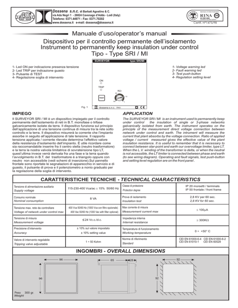 Dossena s.n.c. di Barbati Agostino & C. via Ada Negri 1 - 26824 Cavenago d’Adda - Lodi (Italy) Telefono: 0371.44971 - Fax: 0371.70202 www.dossena.it e-mail: dossena@dossena.it Manuale d’uso/operator’s manual Dispositivo per il controllo permanente dell’isolamento Instrument to permanently keep insulation under control Tipo - Type SRI / MI SURVEYOR 1- Led ON per indicazione presenza tensione 2- Led TRIP per indicazione guasto 3- Pulsante di TEST 4- Regolazione soglia di intervento type SRI/MI 1- Voltage warning led 2- Fault warning led 3- Test push-button 4- Regulation setting level ON TRIP 30 KW 10 TEST 50 Fig. 1 dossena s.n.c. 1 (Italy) IMPIEGO APPLICATION Il SURVEYOR SRI / MI è un dispositivo impiegato per il controllo permanente dell’isolamento di reti in B.T. monofase o trifase galvanicamente isolate da terra. Il dispositivo funziona sul principio dell’applicazione di una tensione continua di misura tra la rete sotto controllo e la terra. Il dispositivo misurerà la corrente che l’impianto assorbe in seguito all’applicazione di tale tensione. Il rapporto tensione applicata / corrente rilevata determina l’effettivo valore della resistenza d’isolamento dell’impianto. È utile ricordare come sia raccomandabile inserire fra il centro stella (neutro trasformatore) e la terra la nostra valvola limitatrice di sovratensione tipo LT, quest’ultima invece verrà derivata fra una fase e la terra quando l’avvolgimento in B.T. del trasformatore è a triangolo oppure con neutro non accessibile (vedi schemi di inserzione).Sul pannello frontale sono riportate le segnalazioni di apparecchio in servizio e di guasto, il pulsante di prova e il potenziometro a nonio graduato per la regolazione della soglia di intervento. The SURVEYOR SRI / MI is an instrument used to permanently keep under control the insulation of single or 3-phase networks galvanically isolated from earth. The instrument operates on the principle of the measurement direct voltage connection between network under control and earth. The intrument will measure the current that plant absorbs by the voltage connection. Ratio of applied voltage / current measured gives the effective value of the plant insulation resistance. It is useful to remember that it is necessary to connect between star-point and earth our overvoltage limiter, type LT. When the L.V. winding of the transformer is delta, or when the neutral is not accessible, the LT limiter is connected between phase and earth (to see wiring diagram). Operating and fault signals, test push-button and setting level regulation are on the front panel . CARATTERISTICHE TECNICHE - TECHNICAL CHARACTERISTICS Tensione di alimentazione ausiliaria Supply voltage 115-230-400 Vca/ac ± 15% 50/60 Hz Consumo nominale Nominal consumption Tensione di misura Measurement voltage 400 Vca 50/60 Hz (1000 Vca con filtro opzionale) 400 Vac 50/60 Hz (1000 Vac with filter optional) 24 Vc.c./d.c. ± 10% sul valore impostato Precisione d’intervento Accuracy Max corrente di misura Measurement current max £ 100mA Impedenza interna Internal resistance ³ 300KW 0 ÷ +50° C CEI EN 61000-6-4 CEI EN 61000-6-2 CEI EN 61010-1 CEI EN 60529 Norme di riferimento 1 ÷ 50 Kohm Tripping valve adjustable 2,8 KV per 60 sec. 2,8 KV for 60 sec. Temperatura di funzionamento Working temperature ± 10% setting value Valore di intervento regolabile IP 20 morsetti / terminals IP 50 frontale / front frame Protection degree Prova di isolamento Insulation test 8 VA Tensione max. rete da controllare Voltage of network under control max Classe di protezione Standard INGOMBRI - OVERALL DIMENSIONS 96 96 Peso 300 gr. Weight 65 92 28 92 SCHEMI D’INSERZIONE - WIRING DIAGRAMS Con neutro With neutral Senza neutro Without neutral Schema di collegamento con filtro per reti a 1000V (opzionale) Connection diagram with filter for 1000V network (optional) Filter 9 8 10 Rete da controllare Network to be controlled SRI/MI 7 6 5 4 3 2 1 Fig. 2 9 8 10 400 Vac/ca 230 Vac/ca 115 Vac/ca 0 } L E 7 6 5 4 Alimentazione Supply Segnalazione Segnallings T 9 26 Rete da controllare Network to be controlled SRI/MI LT Vaux 27 Fig. 3 3 2 1 400 Vac/ca 230 Vac/ca 115 Vac/ca 0 } L E LT Vaux Alimentazione Supply Segnalazione Segnallings T Fig. 2 = Schema di collegamento per sistema trifase 400 V con neutro. Fig. 3 = Schema di collegamento per sistema prifase 230 V L = Lampada: segnalazione a distanza di guasto, (eventuale a cura del cliente). T = Tromba: segnalazione acustica di guasto (eventuale a cura del cliente). E = Commutatore asclusione tromba durante la ricerca guasto (eventuale a cura del cliente). Fig. 2 = Connecting diagram for 400 V 3-plase system with neutral. Fig. 3 = 230V 3-plase system connecting diagram L = Lamp: Fault remote signal (to be eventually provided by the client). T = Horn: Fault audible signal (to be eventually provided by the client) E = Horn: Shut-out commutator, during fault hunting (to be eventually provided by the client) MESSA IN SERVIZIO OPERATING INSTRUCTIONS Il SURVEYOR SRI/MI è provvisto di morsetti ai quali vanno collegati i conduttori secondo le indicazioni degli schemi (fig. 2-3). Fare attenzione che non si verifichino spostamenti di fili e che le tensioni di alimentazione abbiano il loro giusto valore. Dopo aver controllato che i collegamenti sono corretti, alimentare il dispositivo; led “ON” si accenderà indicando la presenza di tensione. Premendo il pulsante “Test” avverrà l’accensione del led “TRIP”, rilasciando il pulsante il led “TRIP” si spegnerà automaticamente, dopodichè impostare la soglia di intervento tramite la regolazione posta sul frontale. Da questo momento il controllo dell’isolamento può essere affidato al SURVEYOR SRI/MI. Se la resistenza d’isolamento scende sotto il valore impostato si illumina il led “TRIP” e contemporaneamente si mette in funzione l’allarme acustico esterno. L’operatore dopo aver tacitato l’allarme acustico (commutatore E), potr