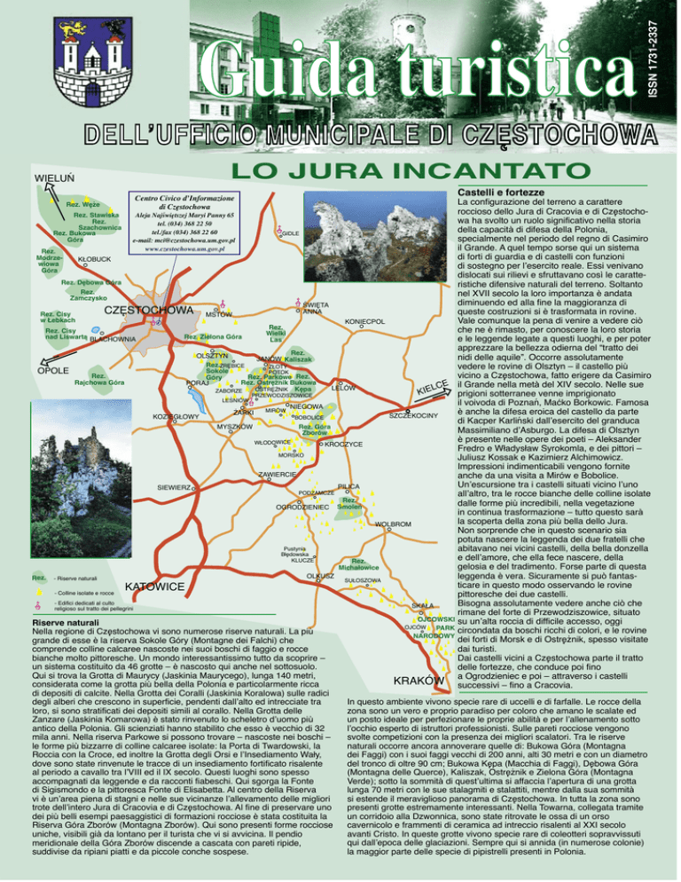 ISSN 1731-2337 Guida turistica DELL’UFFICIO MUNICIPALE DI CZĘSTOCHOWA WIELUŃ LO JURA INCANTATO Centro Civico d’Informazione di Częstochowa Castelli e fortezze La configurazione del terreno a carattere roccioso dello Jura di Cracovia e di Częstochowa ha svolto un ruolo significativo nella storia della capacit� di difesa della Polonia, GIDLE specialmente nel periodo del regno di Casimiro il Grande. A quel tempo sorse qui un sistema Rez. di forti di guardia e di castelli con funzioni ModrzeKŁOBUCK wiowa di sostegno per l’esercito reale. Essi venivano Góra dislocati sui rilievi e sfruttavano cos� le caratteRez. Dębowa Góra ristiche difensive naturali del terreno. Soltanto Rez. nel XVII secolo la loro importanza � andata Zamczysko diminuendo ed alla fine la maggioranza di ŚWIĘTA ANNA CZĘSTOCHOWA MSTÓW queste costruzioni si � trasformata in rovine. Rez. Cisy w Łebkach Vale comunque la pena di venire a vedere ci� KONIECPOL i Rez. che ne � rimasto, per conoscere la loro storia Rez. Cisy Wielki Rez. Zielona Góra nad Liswartą BLACHOWNIA e le leggende legate a questi luoghi, e per poter Las apprezzare la bellezza odierna del “tratto dei Rez. OLSZTYN nidi delle aquile”. Occorre assolutamente JANÓW Kaliszak Rez.ZRĘBICE ZŁOTY vedere le rovine di Olsztyn – il castello pi� Sokole OPOLE POTOK vicino a Częstochowa, fatto erigere da Casimiro Rez. Rez. Parkowe Rez. Góry Rajchowa Góra Rez. Ostrężnik Bukowa PORAJ LELÓW LCE il Grande nella met� del XIV secolo. Nelle sue OSTRĘŻNIK Kępa E ZABORZE I K prigioni sotterranee venne imprigionato PRZEWODZISZOWICE LEŚNIÓW il voivoda di Poznań, Maćko Borkowic. Famosa NIEGOWA MIRÓW � anche la difesa eroica del castello da parte ŻARKI SZCZEKOCINY KOZIEGŁOWY BOBOLICE di Kacper Karliński dall’esercito del granduca Rez. Góra MYSZKÓW Massimiliano d’Asburgo. La difesa di Olsztyn Zborów � presente nelle opere dei poeti – Aleksander WŁODOWICE KROCZYCE Fredro e Władysław Syrokomla, e dei pittori – MORSKO Juliusz Kossak e Kazimierz Alchimowicz. Impressioni indimenticabili vengono fornite ZAWIERCIE anche da una visita a Mirów e Bobolice. Un’escursione tra i castelli situati vicino l’uno PILICA SIEWIERZ PODZAMCZE all’altro, tra le rocce bianche delle colline isolate Rez. dalle forme pi� incredibili, nella vegetazione OGRODZIENIEC Smoleń in continua trasformazione – tutto questo sar� la scoperta della zona pi� bella dello Jura. WOLBROM Non sorprende che in questo scenario sia potuta nascere la leggenda dei due fratelli che Pustynia abitavano nei vicini castelli, della bella donzella Błędowska e dell’amore, che ella fece nascere, della KLUCZE Rez. gelosia e del tradimento. Forse parte di questa Michałowice OLKUSZ leggenda � vera. Sicuramente si pu� fantasRez. - Riserve naturali SUŁOSZOWA ticare in questo modo osservando le rovine KATOWICE - Colline isolate e rocce pittoresche dei due castelli. - Edifici dedicati al culto Bisogna assolutamente vedere anche ci� che SKAŁA religioso sul tratto dei pellegrini rimane del forte di Przewodziszowice, situato OJCOWSKI su un’alta roccia di difficile accesso, oggi Riserve naturali OJCÓW PARK circondata da boschi ricchi di colori, e le rovine Nella regione di Częstochowa vi sono numerose riserve naturali. La pi� NARODOWY dei forti di Morsk e di Ostrężnik, spesso visitate grande di esse � la riserva Sokole Góry (Montagne dei Falchi) che dai turisti. comprende colline calcaree nascoste nei suoi boschi di faggio e rocce Dai castelli vicini a Częstochowa parte il tratto bianche molto pittoresche. Un mondo interessantissimo tutto da scoprire – un sistema costituito da 46 grotte – � nascosto qui anche nel sottosuolo. delle fortezze, che conduce poi fino Qui si trova la Grotta di Maurycy (Jaskinia Maurycego), lunga 140 metri, a Ogrodzieniec e poi – attraverso i castelli KRAKÓW successivi – fino a Cracovia. considerata come la grotta pi� bella della Polonia e particolarmente ricca di depositi di calcite. Nella Grotta dei Coralli (Jaskinia Koralowa) sulle radici degli alberi che crescono in superficie, pendenti dall’alto ed intrecciate tra In questo ambiente vivono specie rare di uccelli e di farfalle. Le rocce della loro, si sono stratificati dei depositi simili al corallo. Nella Grotta delle zona sono un vero e proprio paradiso per coloro che amano le scalate ed Zanzare (Jaskinia Komarowa) � stato rinvenuto lo scheletro d’uomo pi� un posto ideale per perfezionare le proprie abilit� e per l’allenamento sotto antico della Polonia. Gli scienziati hanno stabilito che esso � vecchio di 32 l’occhio esperto di istruttori professionisti. Sulle pareti rocciose vengono mila anni. Nella riserva Parkowe si possono trovare – nascoste nei boschi – svolte competizioni con la presenza dei migliori scalatori. Tra le riserve le forme pi� bizzarre di colline calcaree isolate: la Porta di Twardowski, la naturali occorre ancora annoverare quelle di: Bukowa Góra (Montagna Roccia con la Croce, ed inoltre la Grotta degli Orsi e l’Insediamento Wały, dei Faggi) con i suoi faggi vecchi di 200 anni, alti 30 metri e con un diametro dove sono state rinvenute le tracce di un insediamento fortificato risalente del tronco di oltre 90 cm; Bukowa Kępa (Macchia di Faggi), Dębowa Góra al periodo a cavallo tra l’VIII ed il IX secolo. Questi luoghi sono spesso (Montagna delle Querce), Kaliszak, Ostrężnik e Zielona Góra (Montagna accompagnati da leggende e da racconti fiabeschi. Qui sgorga la Fonte Verde); sotto la sommit� di quest’ultima si affaccia l’apertura di una grotta di Sigismondo e la pittoresca Fonte di Elisabetta. Al centro della Riserva lunga 70 metri con le sue stalagmiti e stalattiti, mentre dalla sua sommit� vi � un’area piena di stagni e nelle sue vicinanze l’allevamento delle migliori si estende il meraviglioso panorama di Częstochowa. In tutta la zona sono trote dell’intero Jura di Cracovia e d