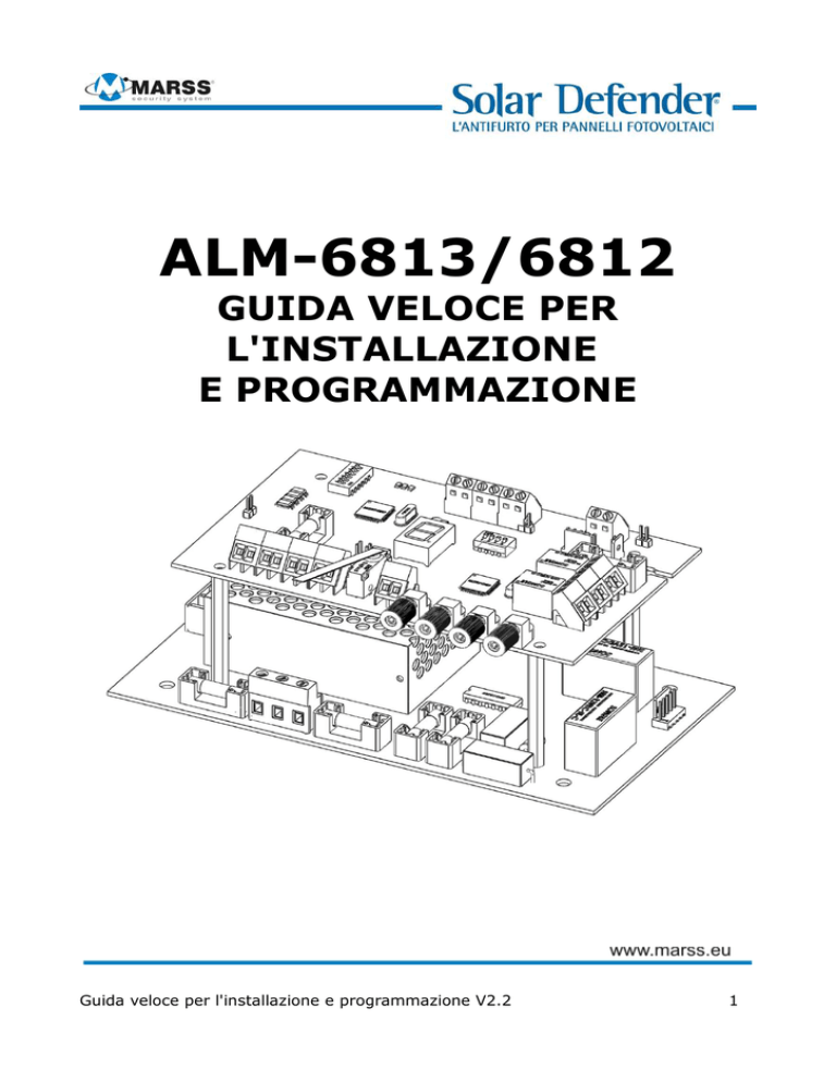 ALM-6813/6812 GUIDA VELOCE PER L'INSTALLAZIONE E PROGRAMMAZIONE Guida veloce per l'installazione e programmazione V2.2 1 SISTEMA MARSS Solar Defender ® In questa guida sono contenute le specifiche essenziali di installazione e configurazione dei concentratori ALM-6813/6812 in modalità stand alone. Per il funzionamento su BUS RS-485, si rimanda al manuale di installazione e configurazione della centrale ALM-6800. Importante: La Marss Srl si riserva di modificare senza preavviso alcuno il manuale, o parte di esso, al fine di migliorare la qualità e le prestazioni del prodotto e dell'installazione del sistema stesso. Visitare periodicamente il sito www.marss.eu per eventuali aggiornamenti dei prodotti MARSS Guida veloce per l'installazione e programmazione V2.2 2 Indice generale Sistema antifurto per pannelli a F.O. Solar Defender.....................................4 Modulo concentratore per fibra ottica Solar Defender....................................5 Precauzioni per l'installazione.................................................................5 Descrizione del concentratore....................................................................6 Morsetto “Bus Input” A B C D.................................................................6 Fusibile “F4”.........................................................................................7 Morsetto “Bus Output” A B C D...............................................................7 Morsetto “Tamper”................................................................................8 TX ed RX Fibra Ottica............................................................................9 Relè Loop Fibra 1 e Loop Fibra 2...........................................................10 Pulsante “Reset” e morsetto “External Reset”.........................................10 Uscite Open Collector “OC1 e OC2”........................................................11 Utilizzo dell'uscita Open Collector OC1................................................11 Prima modalità di utilizzo...............................................................12 Seconda modalità di utilizzo...........................................................12 Terza modalità di utilizzo...............................................................13 Morsetto di alimentazione Ausiliario “X7”................................................14 Dip-switch SW2 “Function”...................................................................15 Dip-switch SW1 “Address”....................................................................16 Operazione di indirizzamento................................................................17 Jumper JP3.........................................................................................18 Display 7 Segmenti..............................................................................18 Spelatura della fibra............................................................................18 Passacavo sul contenitore.....................................................................19 Collegamento e passaggio della fibra ottica............................................20 Curvatura minima della fibra.............................................................22 Caratteristiche dell'alimentatore...............................................................23 Descrizione dei morsetti a bordo del alimentatore...................................23 Autonomia del funzionamento con batteria tampone...................................24 CARATTERISTICHE TECNICHE..................................................................25 Note:....................................................................................................26 Guida veloce per l'installazione e programmazione V2.2 3 Sistema antifurto per pannelli a F.O. Solar Defender Il sistema MARSS Solar Defender funziona con fibra ottica plastica POF ( Plastic Optical Fiber ). Le caratteristiche principale che rendono la fibra ottica il miglior supporto per la trasmissione dati, sono l'immunità ai disturbi elettrici e alle condizioni atmosferiche più estreme e la bassa sensibilità alle variazioni di temperatura. Il principio di funzionamento del sistema MARSS a fibra ottica è molto semplice. La fibra viene passata attraverso i fori di fissaggio dei pannelli fotovoltaici utilizzando il sistema di bloccaggio ALM-6006 brevettato dalla MARSS Srl. Schema di collegamento del concentratore ALM-6813 Guida veloce per l'installazione e programmazione V2.2 4 Modulo concentratore per fibra ottica Solar Defender (modello ALM-6813) Il modulo concentratore ALM-6813/6812 gestisce 2 linee a fibra ottica plastica ( POF - Plastic Optical Fiber) da 200 metri lineari , mediante 2 Loop. Può funzionare in modalità stand-alone o in modalità centralizzata su BUS RS-485. ALM-6813: Concentratore a fibra ottica con modulo di alimentazione supervisionato. ALM-6812: Concentratore a fibra ottica senza modulo di alimentazione supervisionato. Questo manuale si riferisce al solo funzionamento stand-alone. Per il funzionamento su BUS fare riferimento al manuale di installazione e configurazione della centrale ALM-6800. Precauzioni per l'installazione Per la propria sicurezza e quella degli altri, si consiglia vivamente di rispettare queste regole: • • • • Per il collegamento della rete 230V utilizzare cavi con guaina supplementare per garantire una protezione maggiore; Per evitare rischi di incendio sostituire i fusibili guasti a bordo della scheda della centrale con fusibili dello stesso valore e modello; Per evitare rischi di esplosione, sostituire le batterie tampone con batterie dello stesso modello; Per la protezione dell'utente e delle apparecchiature da sovratensioni o scariche atmosferiche è necessario collegare la messa a terra ad ogni dispositivo. Guida veloce per l'installazione e programmazione V2.2 5 Descrizione del concentratore Morsetto “Bus Input” A B C D Mo