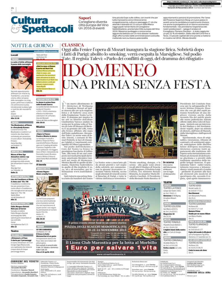 &RGLFHFOLHQWH 18 Venerdì 20 Novembre 2015 Corriere del Veneto TV Cultura & Spettacoli NOTTE & GIORNO =)8%=)8%+33%3=)8+0%8 )+88 #% ''2((% ' -4 '' (3=% '% -+- //=+;*+;))5**' -+ #%' A 67%%'$ =+ 76; ;* #)' +) /7 )) *6>'")'$ -+ 6" 3=+ /6-6*67 ))6'+' % +'*6++- ) /'7; '+;6;;++- ) /); "; ' ;+;' + ) #?-+6=) 7;$2 + " % '' ::09A # ';834 ''2+( %) !=3?+? )+>4" + ;-6'+7 % )=;67 7' 7''6 '+ =+ -+6;- 7( )= ; 6-(7;A /6 /67+;6 ') +=->- )=* #>6A-A +-?7$2 " + " $) '' :, ./ ) ' > 8(+43 '883+$3) 6//6 + 76 ') /6-;"-+'7; )) 76; /6 /67+;6 ') +=->- #@' -=6$2 , * + ("(( '' :, (" + ( '' :,09A ./ !8% %) 4" ' ;4) ' -38+ )' +3$48 '=)'+ =77- /67+; #;' '+ 7$ =+7/;;-)- % 6-+; ') /6;- ;;6>67- ) 7;-6' )) )>;6'' '+ =+ -6&7; ';)'+- +-6 6=6) /6 66'>6 ' "'-6+' +-7;6'2 (" *# + + # '' :, ./ %+ +3 3 ;%)88 +8 &@@ ' +3)3 =) /)- 7' 7''6 '- -6"6 ='+;; -*/"+;- ))7/') "=7; 77 >'7 ) 7@ -+;6);-2 "" + "# * '' :: ./ !%=%(+%" ' ) 48+3% -3 -34+) % + 7+ #'>'*-'$ ' -+ '-6"' '"' BB=;- =+- 7/;;-)- % '+;6' '+3= 7;-6' ' '+3= /67-+""' '>67'2 Conegliano diventa città europa del Vino Un 2016 di eventi Una piccola Expo sulle colline, con eventi che per tutto il prossimo anno intrecceranno enogastronomia, cultura e paesaggio. E’ ciò che attende il distretto di 15 comuni della Marca raggruppati nel territorio di ConeglianoValdobbiadene, proclamata Città europea del Vino 2016. Massimo punteggio e concorrenza agguerrita battuta con un ricco dossier realizzato dagli uffici turistici delle amministrazioni coinvolte, mettendo nero su bianco potenzialità, appuntamenti e percorsi di promozione. Per l’area del Prosecco Superiore Docg un nuovo passo in avanti verso la candidatura a patrimonio Unesco, ma anche la prospettiva di un ritorno economico fondamentale. «Se prendiamo l’esperienza dei nostri predecessori – spiega il sindaco di Conegliano, Floriano Zambon - è stato raggiunto un più 22 % di indotto». Dalla città del Cima fino a Tarzo, 15 piccole capitali del vino pronte a mettersi in mostra nel 2016. (Nicola Zanetti) CLASSICA Oggi alla Fenice l’opera di Mozart inaugura la stagione lirica. Sobrietà dopo i fatti di Parigi: abolito lo smoking, verrà eseguita la Marsigliese. Sul podio Tate. Il regista Talevi: «Parlo dei conflitti di oggi, del dramma dei rifugiati» IDOMENEO UNA PRIMA SENZA FESTA ./ +)) %) -3%( '%) )'' 3) ;33 7-6)) +') +6* -+=66 )5'+-+;6#.,. &.,. =%77 5-7; ) '+6*'6 >-)-+;6' 222 ) 6-+;$2 # --" + "#" '' :A0 !+-3 ' )" +4% ;4% %) -%@@ 677"+ *=7') /-;' #-/6 ) + 7-/6;;=;;--7' =7'$ /6 -+ ') 6'+" ) /-; 6+7- 6"%;; )) ., )- 7/;;-)- #+ )""6;-- ' -'6$ '+;6/6;;- 6-+;;- 0>-1 6=+'6 0>-1 -;;-7 0%';6612 !-- ( " ((*( '' ,* ./ !3+( )" )< !3;'8? 3" ./ %= % 4') ' == 3%8(+ ))% 15A 1*A 7)+ 7' 7''6++)'> /6 /67+;6 ') )-6+=->- )=* #7)+$ % 6-")' 6+' ) 7-=+ ")' ++' 48C 4,C2 !- ++ + # ) '' :, Sapori È un nuovo allestimento di Idomeneo di Wolfgang Amadeus Mozart ad aprire stasera alle ore 19 la stagione lirica e di balletto 2015-2016 della Fondazione Teatro La Fenice. Il dramma per musica in tre atti su libretto dell’abate Gianbattista Varesco andato in scena per la prima volta al Teatro di corte di Monaco di Baviera il 29 gennaio del 1781, torna alla Fenice affidato alla regia dell’italo-sudafricano Alessandro Talevi. Le scene sono di Justin Arienti, i costumi di Manuel Pedretti, le luci di Giuseppe Calabrò e i movimenti coreografici di Nikos Lagousakos. Sul podio dell’Orchestra e Coro del Teatro La Fenice la prestigiosa bacchetta di Jeffrey Tate, alla testa di un cast composto nei ruoli principali dal tenore americano Brenden Gunnell nel ruolo di Idomeneo, Monica Bacelli in quello di Idamante, Ekaterina Sadovnikova in quello di Ilia (repliche il 22, 24, 26 e 28 novembre, per informazioni www.teatrolafenice.it). Sarà tuttavia una prima listata a lutto (le bandiere del Teatro La Fenice sono a mezz’asta già da alcuni giorni) e nel segno della sobrietà, per commemorare la giovane ricercatrice veneziana Valeria Solesin, uccisa negli attentati di venerdì scorso al Bataclan di Parigi, e tutte le vittime dell’attacco terroristico. Niente smoking, dunque, e la serata - alla quale sono attesi tra gli altri il Sindaco di Venezia Luigi Brugnaro, il Prefetto Luigi Cuttaia, l’ex ministro Renato Brunetta, la senatrice Maria Elisabetta Casellati, il Presidente della Biennale Paolo Baratta e il In scena Una scena dell’Idomeneo di Mozart, con la regia di Alessandro Talevi Presidente del Comitato francese per la salvaguardia di Venezia Jérôme-François Zieseniss che con gli altri ospiti potranno beneficiare di una migliore visione anche dalla seconda fila dei palchi grazie alle nuove poltroncine rialzate offerte dalla ditta Caloi di Susegana - inizierà con un intervento del Sindaco e del Sovrintendente seguiti, dopo un minuto di silenzio, dall’inno di Mameli, dalla Marsigliese e dall’opera di Mozart. Sperimentale, ricco di originalità e invenzione, vibrante di contrasti e di sentimenti opposti, anticipatore delle direttive future dell’opera mozartiana, Idomeneo contiene tratti appartenenti alla tradizione dell’opera seria metastasiana combinati ad elementi di derivazione gluckiana e a prestiti dalla tradizione operistica della tragédie lyrique francese. Il quarantenne Talevi - radici venete, infanzia trascorsa a Johannesburg e studi musicali a Londra - promette di portare alla luce gli elementi più moderni di quest’opera che, secondo il regista, «può aprire innumerevo- $ ! $ ) ! $! % # - % -BB- /6/66 =+ 6' 76' ' /';+B /6'> ' /6-;'+ +'*)' % +-+ *+%6++- ' 7;=/'6 +% ' +-+ >"+'2 = /6+-;B'-+ ) +=*6C!<<98,.. 2 " + '' :A09A !)" $ )&)&) ** &)%) (($$ $$$ $ )%!&%) $ %'$ )' & 2 + #(" )) & ) ' 3+ %) 8'% 8(+3+4% % ;) )%+ +57/-7'B'-+ 7;-6' % 77 ' '' ++' ';)'+' ) /';;-6 "6-22 %)+ ' ,A -3%' :A,6 Treviso e Bellun0 Direttore responsabile: Alessandro Russello Vicedirettore: Massimo Mamoli Caporedattore: Alessandro Baschieri Vicecaporedattori: Claudia Fornasier, Alessandro Zangrando, Alessandro Zuin Editoriale Veneto s.r.l Presidente: Pilade Riello Amm
