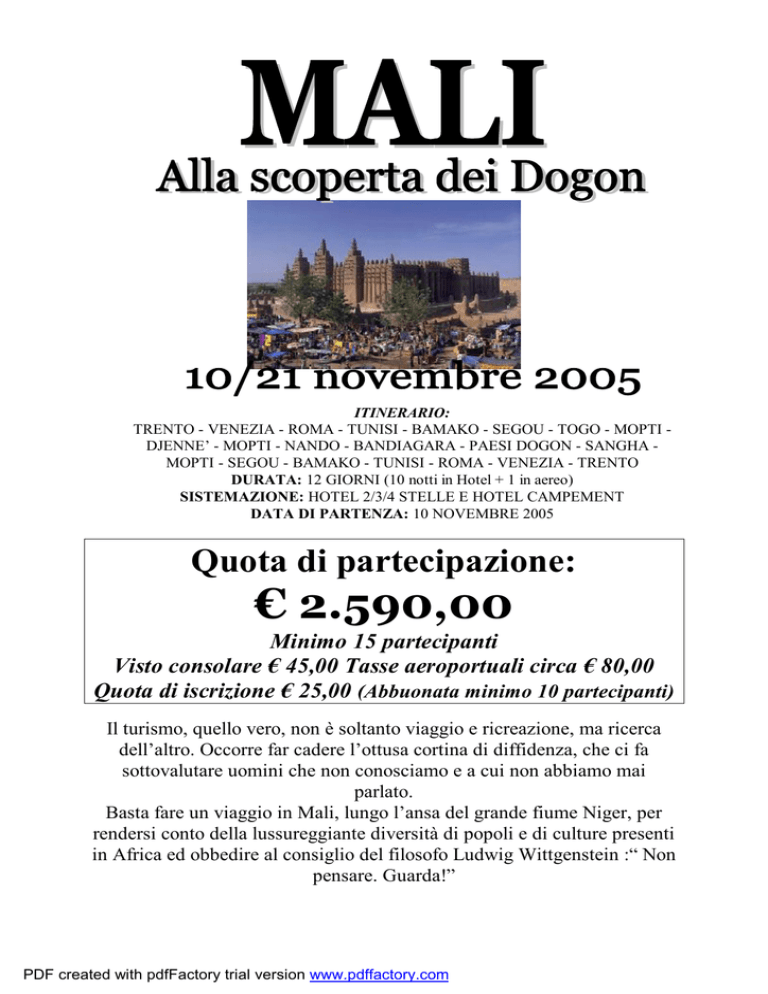 ITINERARIO: TRENTO - VENEZIA - ROMA - TUNISI - BAMAKO - SEGOU - TOGO - MOPTI DJENNE’ - MOPTI - NANDO - BANDIAGARA - PAESI DOGON - SANGHA MOPTI - SEGOU - BAMAKO - TUNISI - ROMA - VENEZIA - TRENTO DURATA: 12 GIORNI (10 notti in Hotel + 1 in aereo) SISTEMAZIONE: HOTEL 2/3/4 STELLE E HOTEL CAMPEMENT DATA DI PARTENZA: 10 NOVEMBRE 2005 Quota di partecipazione: € 2.590,00 Minimo 15 partecipanti Visto consolare € 45,00 Tasse aeroportuali circa € 80,00 Quota di iscrizione € 25,00 (Abbuonata minimo 10 partecipanti) Il turismo, quello vero, non è soltanto viaggio e ricreazione, ma ricerca dell’altro. Occorre far cadere l’ottusa cortina di diffidenza, che ci fa sottovalutare uomini che non conosciamo e a cui non abbiamo mai parlato. Basta fare un viaggio in Mali, lungo l’ansa del grande fiume Niger, per rendersi conto della lussureggiante diversità di popoli e di culture presenti in Africa ed obbedire al consiglio del filosofo Ludwig Wittgenstein :“ Non pensare. Guarda!” PDF created with pdfFactory trial version www.pdffactory.com L’itinerario proposto offre la possibilità di conoscere gli aspetti principali di questo straordinario paese, che vanta grande varietà di paesaggi surreali, splendide opere d’arte, suggestive moschee turrite costruite interamente di fango, villaggi di arenaria rosa scolpiti nelle pareti rocciose ed il misterioso ed affascinante popolo Dogon. PROGRAMMA 1° GIORNO: TRENTO - VENEZIA - ROMA - TUNISI - BAMAKO L'orario della partenza in autopullman da Trento e Pergine, verrà comunicato 8 giorni prima insieme agli operativi di volo. Partenza dall’ aeroporto Marco Polo di Venezia con volo di linea per Tunisi, via Roma. All'arrivo cambio aeromobile e partenza in coincidenza per Bamako. Arrivo e trasferimento in Hotel, sistemazione e pernottamento. 2° GIORNO: BAMAKO - SEGOU ( Km 235) Pensione completa. Prima colazione in Hotel e visita della città di Bamako con l’interessante insieme di edifici coloniali ed il mondo animato e variopinto dei suoi mercati, fra i più tipici di tutta l’Africa Occidentale. Partenza per Segou, con pranzo lungo il tragitto e visita al villaggio di Segoukoro, che sorge sulle rive del Niger ed ha conservato il suo fascino attraverso i secoli. Fu per molto tempo, residenza degli imperatori dell’etnia Bambara. Arrivo a Segou, sistemazione in Hotel, cena e pernottamento. 3° GIORNO: SEGOU - TOGO - MOPTI (Km 405) Pensione completa. Al mattino, visita della città di Segou che ricorda il passato coloniale, con interessanti case dalla elaborata architettura. Questa città era considerata il granaio del Paese, in quanto i francesi avevano deviato parte del fiume Niger e avevano reso fertile tutta la zona. Imponente è il Palazzo de “l’Office du Niger”, il consorzio che gestisce il sistema idraulico che porta l’acqua nel cuore del deserto. La vita è scandita dal continuo movimento e commercio che si svolge sul fiume Niger attraverso le “pinasse”, grandi barconi che trasportano cereali, bestiame e persone ai villaggi posti lungo il fiume. Dopo pranzo partenza per Mopti e sosta lungo il percorso al villaggio di Togo. Arrivo a Mopti e sistemazione in Hotel. Al tramonto escursione in pinasse fino al villaggio Bozo di Kakalodoga. L’etnie Bambara e Bozo, sono stati i primi abitanti del paese e anche coloro che hanno creato la bellissima architettura che ritroviamo nelle moschee sudanesi. Rientro in Hotel per la cena ed il pernottamento. 4° GIORNO: MOPTI - DJENNE’ (Km 130) Pensione completa. In mattinata visita di Mopti, conosciuta come la “Venezia del Mali” per la sua posizione ed il suo porto fluviale sul quale si affacciano molti edifici dalla tipica architettura sudanese. La città, fu per secoli punto di scambio di molti mercanti che commerciavano tra Timbuctu e Djennè. Lungo la darsena si svolge un colorito mercato. Partenza per Djennè, la Regina del Delta, città fra le più affascinanti e pittoresche dell’Africa Occidentale che conserva l’architettura originaria in terra cruda con al centro la PDF created with pdfFactory trial version www.pdffactory.com moschea. Djennè, situtata su un’isola, si raggiunge attraversando il Bani, affluente del Niger. All’arrivo, visita della città che fu sede di un’antica università di studi medici e scientifici, con i suoi vicoli che si aprono tra case in terra alte fino a tre piani e le costruzioni in paglia e fango con il gioco di volumi, i decori ed i chiaroscuri della cosiddetta architettura sudanese. I suoi palazzi, costruiti in terra, riflettono l’antico splendore che si ritrova nella Grande Moschea, 45 metri di altezza, la più grande costruizione in argilla del mondo il cui ingresso è riservato solo ai musulmani. Sistemazione in Hotel, cena e pernottamento. 5° GIORNO: DJENNE’ - MOPTI - NANDO - BANDIAGARA( Km 180) Pensione completa. Al mattino visita del mercato settimanale che si estende, immenso, all’ombra della grande Moschea. La visita del mercato rappresenta un’esperienza indimenticabile poiché ci riporta indietro nel tempo ed è momento ideale di incontro con numerosi gruppi etnici che popolano la valle del Niger. Pranzo, quindi partenza da Djennè e sosta lungo il percorso a Nando, per visitare la Moschea. Proseguimento in direzione della Falesia di Bandiagara, punto di partenza ideale per le successive visite ai villaggi Dogon. Sistemazione, cena e pernottamento in Hotel. 6° GIORNO: BANDIAGARA - SONGHO - SANGHA - PAESE DOGON Pensione completa. Giornata di trekking con l’accompagnamento di una Guida Dogon, per scoprire i paesaggi spettacolari dell’altopiano dove si insediarono i Dogon e vari villaggi perfettamente mimetizzati nello scenario circostante. Partenza verso i Paesi Dogon, inziando da Songho, grazioso villaggio situato in posizione spettacolare sull’altopiano, dove gli abitanti mantengono le loro tradizioni animiste, come testimoniato dalla freschezza dei dipinti nelle grotte presso il luogo collettivo dove avvengono