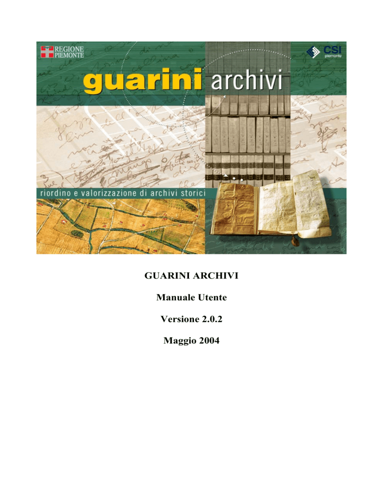 GUARINI ARCHIVI Manuale Utente Versione 2.0.2 Maggio 2004 SOMMARIO 1. INTRODUZIONE......................................................................................................................................................... 5 1.1. INTRODUZIONE ISTITUZIONALE E METODOLOGICA............................................................................ 5 2. REQUISITI TECNICI GENERALI ........................................................................................................................... 9 2.1. CONFIGURAZIONE HARDWARE....................................................................................................................... 9 2.1.1. Configurazione consigliata (minima) ............................................................................................................... 9 2.2. CONFIGURAZIONE SOFTWARE ........................................................................................................................ 9 2.3. INSTALLAZIONE GUARINI ARCHIVI ............................................................................................................... 9 2.4. DESCRIZIONE DELLA CARTELLA DI INSTALLAZIONE............................................................................. 10 2.5. ACCESSO ALLA PROCEDURA ......................................................................................................................... 10 2.6. SALVATAGGIO E RECUPERO DEI DATI ........................................................................................................ 11 2.7. GESTIONE IN RETE LOCALE............................................................................................................................ 12 2.7.1 Configurazione ................................................................................................................................................ 12 2.7.2 Operazioni preliminari .................................................................................................................................... 12 2.7.3 Avvertenze........................................................................................................................................................ 12 2.8. GESTIONE SU PIÙ PC NON IN RETE LOCALE (STAND ALONE)................................................................. 12 2.8.1. Export della base dati ..................................................................................................................................... 12 2.8.2. Import della base dati ..................................................................................................................................... 14 2.8.3. Controllo dell'Authority File Nomi ................................................................................................................. 16 3. INQUADRAMENTO GENERALE .......................................................................................................................... 18 3.1. GLI ELEMENTI DELL'APPLICATIVO .............................................................................................................. 18 3.1.1. La Scheda anagrafica degli archivi di concentrazione................................................................................... 18 3.1.2. La Struttura ad albero rovesciato e la Scheda aggregazione ......................................................................... 19 3.1.3. La Scheda dettaglio ........................................................................................................................................ 19 3.1.4. Gli Authority File collegati............................................................................................................................. 22 3.1.4.1. La scheda Nomi...........................................................................................................................................................22 3.1.4.2. La scheda Bibliografia.................................................................................................................................................23 3.2. CARATTERISTICHE GENERALI DELLE SCHEDE ......................................................................................... 24 3.2.1. Icone e abbreviazioni...................................................................................................................................... 24 3.2.1.1. Icone............................................................................................................................................................................24 3.2.1.2. Abbreviazioni ..............................................................................................................................................................25 3.2.2. Aree e paragrafi.............................................................................................................................................. 25 3.2.3. I campi delle schede........................................................................................................................................ 25 3.2.3.1. Campi controllati.........................................................................................................................................................25 3.2.3.2. Campi liberi.................................................................................................................................................................25 3.2.3.3. Campi ripetibili............................................................................................................................................................25 3.3. FUNZIONALITÀ DI INSERIMENTO E DI GESTIONE ..................................................................................... 26 3.3.1. La Barra delle icone ....................................................................................................................................... 26 3.3.1.1. Archivio.
