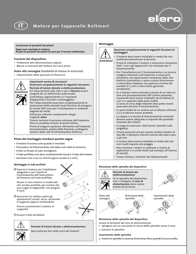 IT Motore per tapparelle RolSmart Montaggio Conservare le presenti istruzioni! Dopo aver montato il motore, fissare le presenti istruzioni al cavo per il tecnico elettricista. Osservare scrupolosamente le seguenti istruzioni di montaggio! Funzioni del dispositivo: Avvertenza! • Protezione telo (disinserzione coppia) • Messa in esercizio del motore con cavo prova Stato alla consegna (modalità di messa in esercizio) – Il motore deve essere installato in modo che non costituisca pericolo per le persone. – Prima di installare il motore è necessario rimuovere tutti i cavi e gli apparecchi non necessari per il funzionamento. – Per l’installazione ed il funzionamento e se occorre svolgere interventi sull’impianto, è necessario prevedere una separazione onnipolare dalla rete elettrica (connettore a spina e presa Hirschmann o interruttore bipolare con apertura minima dei contatti di 3 mm o interruttore generale onnipolare). • Impostazione delle posizioni di finecorsa Importanti norme di sicurezza! Osservare scrupolosamente le seguenti istruzioni. Pericolo di lesioni dovute a elettroconduzione. Avvertenza! Gli allacciamenti alla rete a 230 V devono essere eseguiti da un elettricista autorizzato. Controllare regolarmente se l’impianto (tapparella) è usurato o danneggiato. Per l’allacciamento osservare scrupolosamente le prescrizioni delle aziende locali fornitrici di energia e le norme VDE 0100 per l’installazione in ambienti bagnati ed umidi. Utilizzare soltanto componenti integri originali elero. Tenere lontano le persone estranee dall’impianto fino al completo arresto di quest’ultimo. Prima di eseguire qualsiasi intervento sull’impianto (manutenzione, pulizia delle finestre), scollegarlo sempre dalla rete di alimentazione elettrica. – Se il motore viene azionato a mezzo di un interruttore con preimpostazione OFF (uomo presente), il pulsante deve essere installato ad un’altezza di 1,50 m e separato dalle parti mobili. La zona di corsa degli impianti deve poter essere osservata durante il funzionamento. – Le parti mobili di un motore ad un’altezza inferiore a 2,5 m devono essere protette. – La coppia e la durata di funzionamento nominali devono essere adeguate ai requisiti del prodotto azionato dal motore. – Si prega di osservare i dati tecnici riportati sulla targhetta. – Tenere presente che per questo motore (motori di tipo M), il diametro interno minimo del tubo è pari a 46 mm. Prima del montaggio ricordarsi quanto segue: – Il motore deve essere installato in modo tale che non risulti esposto alla pioggia. • Il motore funziona solo quando è montato. • Provvedere all’allacciamento solo dopo aver tolto la tensione. • Il tubo profilato non deve assolutamente toccare il tubo del motore. – Non montare i motori in ambienti a rischio di esplosione o in unità mobili (ad esempio all’interno di veicoli). • Accertarsi che ci sia un minimo gioco assiale (1-2 mm). – Tenere lontano i bambini dai (tele)comandi. • Il telo va fissato al tubo avvolgitore. Montaggio in tubi profilati Rimozione dello spinotto del dispositivo XA Inserire il motore con l’adattatore Pericolo di lesioni per elettroconduzione. A Avvertenza! Posare il cavo motore in modo tale che sia ben protetto, per evitare che esso segni le tapparelle; non piegare il cavo. B Se lo spinotto del dispositivo non è collegato, il cavo di alimentazione deve essere esente da tensione. Stato alla consegna XB Assicurare la calotta contro gli spostamenti assiali, ad es. avvitando il supporto oppure rivettandolo. Rimozione dello spinotto C Fissare il telo all’albero! X S Fissare assialmente il motore al supporto! 2S 1 C Inserimento dello spinotto S adeguato e con l’anello di trascinamento dell’interruttore di finecorsa nel tubo profilato. 3 Rimozione dello spinotto del dispositivo Pericolo di lesioni dovute a elettroconduzione. Avvertenza! Non praticare fori nella zona del motore! Levare la tensione dal cavo di alimentazione. 1. Spingere con un cacciavite la sicura dello spinotto verso il cavo. 2. Estrarre lo spinotto. Inserimento dello spinotto 3. Inserire lo spinotto in assenza di tensione, fino a quando la sicura scatta. Collegamento/Installazione/Messa in esercizio Tipi d’installazione Messa in esercizio Sono possibili diversi tipi d’installazione: Osservare quanto segue: il RevoLine RolSmart necessita di una battuta definita (battuta superiore o inferiore). Per programmare liberamente le due posizioni, selezionare un RevoLine RolTop. Tipo d’installazione Possibile con 1. Battuta superiore fissa posizione di finecorsa inferiore libera regolabili Molla di sospensione, nastri, cintura, tappo battuta, barra angolare 2. Dispositivo antieffrazione e battuta inferiore Fisso superiore tappo battuta, barra angolare 3. Posizione finale superiore libera regolabile battuta inferiore fissa Dispositivo antieffrazione Avvertenza: al momento della consegna, il motore è impostato sulla modalità di messa in esercizio. Collegamento per cavo di montaggio 1. Rete Esempio di collegamento per un motore tubolare RolSmart 230 V/50 Hz Avvertenza: Termostato ad avvolgimento Condensatore nero blu verde/ giallo Scatola di derivazione Deve essere garantito un ritardo di commutazione di almeno 0,5 secondi. 3 2 1 2. Dare tensione. Ora è possibile regolare le posizioni finali con il cavo di montaggio. Spinotto (esterna al cassonetto) 10 2 Interruttore o tasto Scatola interruttore Rete 230V/50 Hz L1 N PE Avvertenza: è possibile collegare in parallelo più motori RolSmart. In tal caso, tenere conto della massima portata d’interruzione della posizione di comando. 2 3 2 1 Elettronica marrone i sistemi di comando del motore per le direzioni di SALITA/DISCESA devono esser interbloccati. Blu (Neutro) (1) Nero (2) Marrone (3) Verde Osservare quanto segue: ogni movimento interrotto da un breve arresto segnala che il motore è in modalità regolazione. Avvertenza: la protezione telo si adatta perfettamente sol