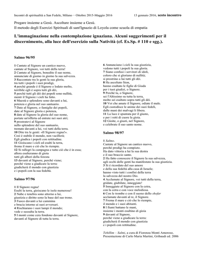 Incontri di spiritualità a San Fedele, Milano − Ottobre 2015-Maggio 2016 13 gennaio 2016, sesto incontro Pregare insieme a Gesù. Ascoltare insieme a Gesù. Il metodo degli Esercizi Spirituali di sant'Ignazio di Loyola come scuola di empatia L'immaginazione nella contemplazione ignaziana. Alcuni suggerimenti per il discernimento, alla luce dell'esercizio sulla Natività (cf. Es.Sp. # 110 e sgg.). Salmo 96/95 1 Cantate al Signore un cantico nuovo, cantate al Signore, voi tutti della terra! 2 Cantate al Signore, benedite il suo nome, annunciate di giorno in giorno la sua salvezza. 3 Raccontate tra le genti la sua gloria, tra tutti i popoli i suoi prodigi, 4 perché grande è il Signore e lodato molto, terribile egli è sopra tutti gli dèi, 5 perché tutti gli dèi dei popoli sono nullità, mentr il Signore i cieli ha fatto. 6 Maestà e splendore sono davanti a lui, potenza e gloria nel suo santuario. 7 Date al Signore, o famiglie dei popoli, date al Signore gloria e potenza, 8 date al Signore la gloria del suo nome, portate un'offerta ed entrate nei suoi atri; 9 prostratevi al Signore nello splendore del suo santuario, tremate davanti a lui, voi tutti della terra. 10 Dite tra le genti: «Il Signore regna!». Così è stabile il mondo, non vacillerà; Egli giudica i popoli con rettitudine. 11 Gioiscano i cieli ed esulti la terra, frema il mare e ciò che lo riempie. 12 Si rallegri la campagna e tutto ciò che è in essa; allora esulteranno di gioia tutti gli alberi della foresta 13 davanti al Signore, perché viene; perché viene a giudicare la terra: giudicherà il mondo con giustizia e i popoli con la sua fedeltà. Salmo 97/96 1 Il Signore regna! Esulti la terra, gioiscano le isole numerose! 2 Nube e tenebra sono attorno a lui, giustizia e diritto sono la base del suo trono. 3 Fuoco davanti a lui cammina e brucia intorno ai suoi avversari. 4 Rischiarano i suoi lampi il mondo; vede e sussulta la terra. 5 I monti come cera fondono davanti al Signore, davanti al Signore di tutta la terra. 6 Annunciano i cieli la sua giustizia, vedono tutti i popoli la sua gloria. 7 Siano confusi i servitori di idoli, coloro che si gloriano di nullità; si prostrino a lui tutti gli dèi. 8 Ha ascoltato Sion, hanno esultato le figlie di Giuda per i tuoi giudizi, o Signore. 9 Perché tu, o Signore, sei l'Altissimo su tutta la terra, molto sei esaltato sopra tutti gli dèi. 10 Voi che amate il Signore, odiate il male. Egli custodisce le anime dei suoi fedeli, dalle mani dei malvagi li libera. 11 La luce è spuntata per il giusto, e per i retti di cuore la gioia. 12 Gioite, o giusti, nel Signore, e celebrate il suo santo nome. Salmo 98/97 1 Salmo. Cantate al Signore un cantico nuovo, perché prodigi ha compiuto. Ha dato vittoria a lui la sua destra e il suo braccio santo. 2 Ha fatto conoscere il Signore la sua salvezza, agli occhi delle genti ha manifestato la sua giustizia. 3 Si è ricordato del suo amore e della sua fedeltà alla casa di Israele; hanno visto tutti i confini della terra la salvezza del nostro Dio. 4 Acclamate al Signore, voi tutti della terra, gridate, giubilate, inneggiate! 5 Inneggiate al Signore con la cetra, con la cetra e con voce melodiosa. 6 Con le trombe e con il suono dello shofar acclamate davanti al re, il Signore. 7 Frema il mare e ciò che lo riempie, il mondo e i suoi abitanti. 8 I fiumi battano le mani, insieme i monti esultino di gioia 9 davanti al Signore, perché viene a giudicare la terra: giudicherà il mondo con giustizia e i popoli con rettitudine. Tehillim – Salmi, a cura di Fiorenza Monti Amoroso, Presentazione di Carlo Maria Martini, Gribaudi ed. 2006 Luca 2,1-38 1 In quei giorni un decreto di Cesare Augusto ordinò che si facesse il censimento di tutta la terra. 2 Questo primo censimento fu fatto quando Quirinio era governatore della Siria. 3 Tutti andavano tutti a farsi censireregistrare, ciascuno nella propria città. 4 Anche Giuseppe, dalla Galilea, dalla città di Nazaret, salì in Giudea alla città di Davide chiamata Betlemme: egli aapparteneva infatti alla casa e alla famiglia di Davide. 5 Doveve farsi censire insieme a Maria, sua sposa, che era incinta. 6 Mentre si trovavano in quel luogo, si compirono per lei i giorni del parto. 7 Diede alla luce il suo figlio primogenito, lo avvolse in fasce e lo pose in una mangiatoia, perché per loro non c'era posto nell'alloggio. 8 C'erano in quella regione alcuni pastori che, pernottando all'aperto, facevano la guardia al loro gregge. 9 Un angelo del Signore si presentò a loro e la gloria del Signore li avvolse di luce. Essi furono presi da grande timore, 10 ma l'angelo disse loro: «Non temete: ecco vi annuncio una grande gioia, che sarà di tutto il popolo: 11 oggi, nella città di Davide, è nato per voi un Salvatore, che è Cristo Signore. 12 Questo per voi il segno: troverete un bambino avvolto in fasce, adagiato in una mangiatoia». 13 E subito apparve con l'angelo una moltitudine dell'esercito celeste che lodava Dio e diceva: 14 «Gloria a Dio nel più alto dei cieli e pace in terra agli uomini, che egli ama». 15 Appena gli angeli si furono allontanati da loro, verso il cielo, i pastori dicevano l'un l'altro: «Andiamo dunque fino a Betlemme, vediamo questo avvenimento che il Signore ci ha fatto conoscere». 16 Andarono, senza indugio, e trovarono Maria e Giuseppe e il bambino, adagiato nella mangiatoia. 17 E dopo averlo visto, riferirono ciò che del bambino era stato detto loro. 18 Tutti quelli che udivano si stupirono delle cose dette loro dai pastori. 19 Maria, da parte sua, custodiva tutte queste cose, meditandole nel suo cuore. 20 I pastori se ne tornarono, glorificando e lodando Dio per tutto ciò che avevano udito e visto, com'era stato detto loro. 21 Quando furono compiuti i giorni prescritti per la circoncisione, gli fu messo nome Gesù, come era stato chiamato dall'angelo prima che fosse concepito nel grembo. 22 Quando furono compiuti i giorni della loro purificazione rituale, secondo la Legge di