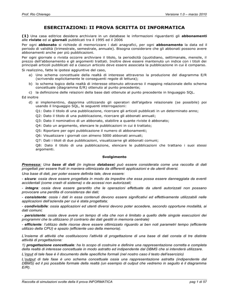 (1) Una casa editrice desidera archiviare in un database le informazioni riguardanti gli abbonamenti