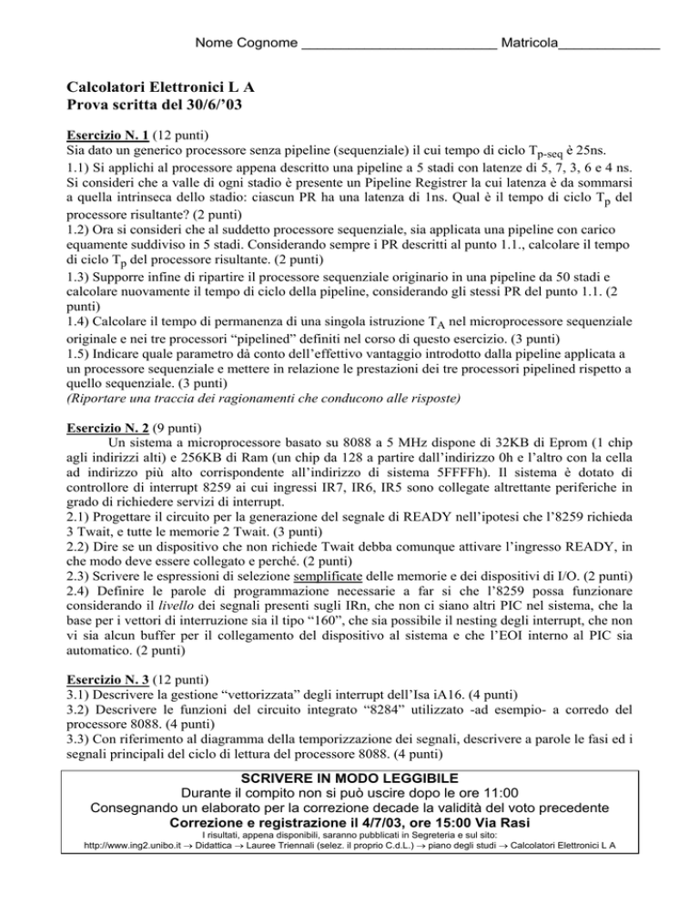 Nome Cognome _________________________ Matricola_____________ Calcolatori Elettronici L A Prova scritta del 30/6/’03 Esercizio N. 1 (12 punti) Sia dato un generico processore senza pipeline (sequenziale) il cui tempo di ciclo Tp-seq è 25ns. 1.1) Si applichi al processore appena descritto una pipeline a 5 stadi con latenze di 5, 7, 3, 6 e 4 ns. Si consideri che a valle di ogni stadio è presente un Pipeline Registrer la cui latenza è da sommarsi a quella intrinseca dello stadio: ciascun PR ha una latenza di 1ns. Qual è il tempo di ciclo Tp del processore risultante? (2 punti) 1.2) Ora si consideri che al suddetto processore sequenziale, sia applicata una pipeline con carico equamente suddiviso in 5 stadi. Considerando sempre i PR descritti al punto 1.1., calcolare il tempo di ciclo Tp del processore risultante. (2 punti) 1.3) Supporre infine di ripartire il processore sequenziale originario in una pipeline da 50 stadi e calcolare nuovamente il tempo di ciclo della pipeline, considerando gli stessi PR del punto 1.1. (2 punti) 1.4) Calcolare il tempo di permanenza di una singola istruzione TA nel microprocessore sequenziale originale e nei tre processori “pipelined” definiti nel corso di questo esercizio. (3 punti) 1.5) Indicare quale parametro dà conto dell’effettivo vantaggio introdotto dalla pipeline applicata a un processore sequenziale e mettere in relazione le prestazioni dei tre processori pipelined rispetto a quello sequenziale. (3 punti) (Riportare una traccia dei ragionamenti che conducono alle risposte) Esercizio N. 2 (9 punti) Un sistema a microprocessore basato su 8088 a 5 MHz dispone di 32KB di Eprom (1 chip agli indirizzi alti) e 256KB di Ram (un chip da 128 a partire dall’indirizzo 0h e l’altro con la cella ad indirizzo più alto corrispondente all’indirizzo di sistema 5FFFFh). Il sistema è dotato di controllore di interrupt 8259 ai cui ingressi IR7, IR6, IR5 sono collegate altrettante periferiche in grado di richiedere servizi di interrupt. 2.1) Progettare il circuito per la generazione del segnale di READY nell’ipotesi che l’8259 richieda 3 Twait, e tutte le memorie 2 Twait. (3 punti) 2.2) Dire se un dispositivo che non richiede Twait debba comunque attivare l’ingresso READY, in che modo deve essere collegato e perché. (2 punti) 2.3) Scrivere le espressioni di selezione semplificate delle memorie e dei dispositivi di I/O. (2 punti) 2.4) Definire le parole di programmazione necessarie a far si che l’8259 possa funzionare considerando il livello dei segnali presenti sugli IRn, che non ci siano altri PIC nel sistema, che la base per i vettori di interruzione sia il tipo “160”, che sia possibile il nesting degli interrupt, che non vi sia alcun buffer per il collegamento del dispositivo al sistema e che l’EOI interno al PIC sia automatico. (2 punti) Esercizio N. 3 (12 punti) 3.1) Descrivere la gestione “vettorizzata” degli interrupt dell’Isa iA16. (4 punti) 3.2) Descrivere le funzioni del circuito integrato “8284” utilizzato -ad esempio- a corredo del processore 8088. (4 punti) 3.3) Con riferimento al diagramma della temporizzazione dei segnali, descrivere a parole le fasi ed i segnali principali del ciclo di lettura del processore 8088. (4 punti) SCRIVERE IN MODO LEGGIBILE Durante il compito non si può uscire dopo le ore 11:00 Consegnando un elaborato per la correzione decade la validità del voto precedente Correzione e registrazione il 4/7/03, ore 15:00 Via Rasi I risultati, appena disponibili, saranno pubblicati in Segreteria e sul sito: http://www.ing2.unibo.it → Didattica → Lauree Triennali (selez. il proprio C.d.L.) → piano degli studi → Calcolatori Elettronici L A SOLUZIONE del compito di Calcolatori Elettronici L A del 30/6/’03 1.1) Per calcolare il tempo di ciclo di una pipeline Tp si impone l’unicità del clock per tutti i suoi stadi, Tp=Tpi da cui risulta che tutti gli stadi hanno la stessa latenza. Dato che non è possibile ridurre quella degli stadi più lenti, si considera proprio la latenza più alta, che è 7ns, per definire il periodo del clock comune a tutti gli stadi. Sommando a questo valore la latenza del PR si ottiene un tempo di ciclo Tp di 8ns. (2 punti) 1.2) Anche in questo caso va imposta l’unicità del clock, ma tutti gli stadi hanno lo stesso Tpi=5ns da cui risulta che il tempo di ciclo Tp, ottenuto sommando la latenza dei PR, risulta essere 6ns. (2 punti) 1.3) Questa risposta segue lo stesso ragionamento delle precedenti. In questo caso i 25ns del tempo di ciclo del processore sequenziale sono ripartiti tra 50 stadi. Assumendo che ciò possa avvenire in modo equilibrato, si ha che ogni Tpi=0.5ns. Sommando a questo la latenza del PR si ha che Tp=1.5ns. (2 punti) 1.4) Un processore senza pipeline esegue una istruzione per ogni Tp ed, essendo il tempo di ciclo Tp-seq=25ns, in questo caso esso corrisponde alla latenza totale TA del processore sequenziale. Per i processori dotati di pipeline la permanenza di una istruzione nel processore o latenza totale TA si ottiene moltiplicando il tempo di ciclo Tp per il numero degli stadi. Perciò: il processore al punto 1.1 ha TA=85=40ns, il processore al punto 1.2 ha TA=65=30ns ed il processore al punto 1.3 ha TA=1.550=75ns. (3 punti) 1.5) Tale parametro è il Throughput ovvero il “numero di istruzioni completate al secondo” [ips] ed è definito come Throughput=1/Tp (allo stesso modo, per quelli pipelined vale anche Throughput=Nstadi/TA). Mentre nel caso del processore sequenziale il Throughput è 1/2510-9=40106 ips, per i tre processori pipelined esso sale nel primo caso a 1/810-9=125106 ips, nel secondo caso a 1/610-9=166106 ips mentre nel terzo a 1/1.510-9=666106 ips. Da quanto appena detto discende che gli speedup dei tre processori pipelined dei punti 1.1, 1.2, e 1.3 confrontati al caso sequenziale sono rispettivamente 125/40=3.125, 166/40=4.15 e 666/40=16.65. (3 punti) ----------------------------------------------------------------------------
