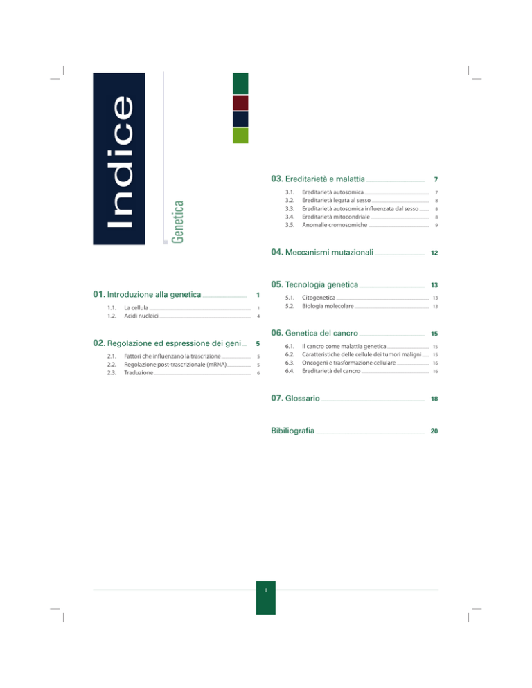 3.1. 3.2. 3.3. 3.4. 3.5. Genetica Indice 03. Ereditarietà e malattia .................................................................... Ereditarietà autosomica .................................................................................................... Ereditarietà legata al sesso ......................................................................................... Ereditarietà autosomica influenzata dal sesso ............... Ereditarietà mitocondriale ........................................................................................... Anomalie cromosomiche ............................................................................................. 04. Meccanismi mutazionali 01. Introduzione alla genetica 1.1. 1.2. 05. Tecnologia genetica ................................................... La cellula .............................................................................................................................................................. Acidi nucleici .............................................................................................................................................. 02. Regolazione ed espressione dei geni 2.1. 2.2. 2.3. 1 5.1. 5.2. 1 Fattori che influenzano la trascrizione .............................................. Regolazione post-trascrizionale (mRNA) ..................................... Traduzione ....................................................................................................................................................... 7 8 8 8 9 .......................................................... 12 ............................................................................ 13 Citogenetica ................................................................................................................................................ Biologia molecolare .................................................................................................................... 13 13 4 06. Genetica del cancro ..... 7 5 6.1. 6.2. 6.3. 6.4. 5 5 6 Il cancro come malattia genetica ................................................................. Caratteristiche delle cellule dei tumori maligni ........... Oncogeni e trasformazione cellulare .................................................. Ereditarietà del cancro ......................................................................................................... 07. Glossario Bibiliografia II ............................................................................ 15 15 15 16 16 ........................................................................................................................ 18 .............................................................................................................................. 20