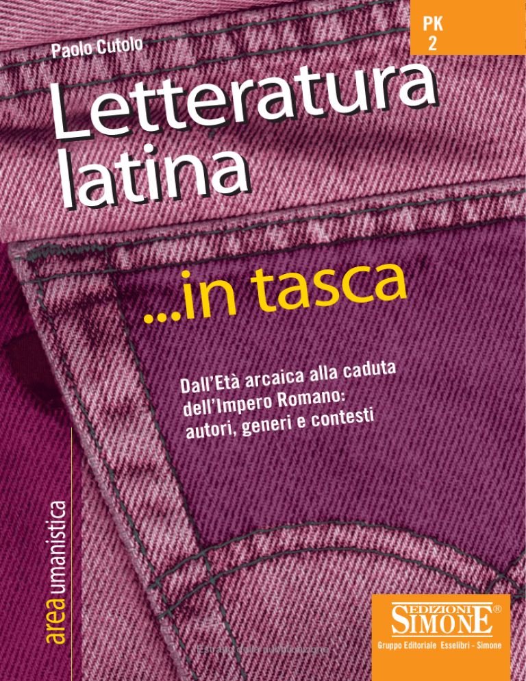 PK 2 a r u t a r Lette latina Paolo Cutolo a c s a t n i . .. area umanistica a alla caduta Dall’Età arcaic no: oma dell’Impero R ontesti ec autori, generi SIMONE EDIZIONI Estratto della pubblicazione Gruppo Editoriale Esselibri - Simone a r u t a r Lette latina Paolo Cutolo .. .in tasca area umanistica a alla caduta Dall’Età arcaic no: oma dell’Impero R ontesti ec autori, generi SIMONE EDIZIONI ® Gruppo Editoriale Esselibri - Simone Estratto della pubblicazione Copyright © 2004 Esselibri S.p.A. Via F. Russo, 33/D 80123 Napoli Tutti i diritti riservati È vietata la riproduzione anche parziale e con qualsiasi mezzo senza l’autorizzazione scritta dell’editore. Per citazioni e illustrazioni di competenza altrui, riprodotte in questo libro, l’editore è a disposizione degli aventi diritto. L’editore provvederà, altresì, alle opportune correzioni nel caso di errori e/o omissioni a seguito della segnalazione degli interessati. Prima edizione: Febbraio 2004 PK2 ISBN 88-244-8743-2 Ristampe 8 7 6 5 4 3 2 1 2004 2005 2006 2007 Questo volume è stato stampato presso Officina Grafica Iride Via Prov.le Arzano-Casandrino, VII Traversa, 24 Arzano (NA) Per informazioni, suggerimenti, proposte: info@simone.it Redazione: Umanistica Grafica e copertina: Gianfranco De Angelis 2 Presentazione ................................ Il volume, Letteratura latina... in tasca, è uno strumento pensato per favorire il rapido apprendimento degli argomenti fondamentali della disciplina e la comprensione dei problemi principali connessi agli argomenti letterari, attraverso un percorso chiaro ed essenziale, che riceve il suo spessore dalla sintesi delle diverse posizioni critiche storiche e recenti. Il testo è articolato in capitoli, arricchiti con schemi cronologici e rubriche di approfondimento, come Focalizziamo su..., che propone la lettura di brani di autori antichi e alcuni spunti per l’analisi, o Spunti di interdisciplinarietà, che permette di allargare la prospettiva su altre discipline, al fine di una migliore comprensione tramite la contestualizzazione. Conclude ogni capitolo un test di verifica, con soluzioni e brevi commenti, che consente di valutare il livello di comprensione sintetica degli argomenti acquisito. 3 Estratto della pubblicazione 1. L’età arcaica ................................ TAVOLA CRONOLOGICA DEGLI EVENTI • • • • • • • • • • • • • • • • • • • • • • • 753 a.C. Fondazione di Roma (secondo Varrone). 509 Fine della monarchia etrusca a Roma. 451-450 I decemviri e le Leggi delle 12 Tavole. 390 ca. Battaglia sull’Allia e presa di Roma da parte dei Galli. 343-341 Prima guerra Sannitica. 326-304 Seconda Guerra Sannitica. 312 Censura di Appio Claudio. 298-290 Terza Guerra Sannitica. 295 Vittoria dei Romani a Sentino. 280-275 Guerra contro Pirro. 272 Sottomissione di Taranto. 264-241 Prima Guerra Punica. 260 Vittoria della flotta romana agli ordini di C. Duilio a Milazzo. 256 Vittoria della flotta romana al promontorio di Ecnomo. 241 II console Lutazio Catulo ottiene una decisiva vittoria alle isole Egadi. 240 Rappresentazione della prima opera teatrale romana di Livio Andronico. 218-201 Seconda Guerra Punica. 218 Battaglie del Ticino e della Trebbia. 217 Battaglia presso il Trasimeno. 216 Battaglia di Canne. 212-205 Prima Guerra Macedonica. 204 II poeta Ennio è condotto a Roma da Catone. 202 Sconfitta dei Cartaginesi a Naraggara in Africa. Nel II millennio a.C. si verifica una prima migrazione di popoli indoeuropei in Italia, che si stabilisce in un’area estesa dall’Italia centrale alla Sicilia. A questo gruppo, detto latino-siculo, appartiene una popolazione dedita alla coltivazione di cereali e all’allevamento, che 5 1. L’età arcaica 1) Inquadramento storico 1. L’età arcaica vive nel Lazio organizzata in piccole comunità sparse sui colli Palatino, Esquilino, Quirinale. La data tradizionale della fondazione della città di Roma, 753 a.C., si riferisce al momento in cui i tre colli sono circondati da una cinta di mura difensive grazie all’iniziativa degli Etruschi, interessati al controllo del guado del Tevere. Sotto la guida dei sovrani etruschi la piccola comunità di villaggi diventa rapidamente la città egemone del Lazio. Il 509 a.C. segna l’epilogo di una crisi interna ed esterna di Roma: gli Etruschi, sconfitti dai Greci ad Aricia nel 524 a.C., non riescono a opporsi alla cacciata dei re etruschi da Roma e alla fondazione della repubblica a opera dei patrizi romani, ostili allo Stato centralista dei Tarquini. L’indebolimento degli Etruschi in Italia, nella cui orbita la città continua a ruotare, e le lotte fra patrizi e plebei riducono notevolmente la potenza e il prestigio di Roma, che viene ulteriormente isolata dalla calata dei Volsci nel Lazio dall’Appennino. Durante il V secolo a.C. la città del Lazio attraversa una profonda crisi dalla quale uscirà, faticosamente, solo nel corso del IV secolo a.C. Lo scioglimento della lega latina, avvenuto nel 338 a.C., segna la riscossa di Roma e la ripresa dell’espansione. Il III secolo a.C. si apre con la terza guerra sannitica. A Sentino, nel 295, Sanniti, Galli, Etruschi vengono sconfitti e Roma diventa la massima potenza della penisola. Taranto, la più potente città greca dell’Italia meridionale, chiede aiuto a Pirro, re dell’Epiro, uno dei regni nati dalla dissoluzione dell’impero di Alessandro Magno. Sconfitti a Eraclea (280) i Romani riprendono la lotta e nel 275 sconfiggono a Maleventum (oggi Benevento) Pirro, che ritorna in Epiro. La vittoria contro Pirro, erede del grande Alessandro, ha attirato sulla città del Lazio l’attenzione delle grandi monarchie ellenistiche e fornito così alla stessa Roma lo spunto per un ampliamento dei propri orizzonti politici fino a poco prima impensabile. Nei decenni successivi si verifica l’inarrestabile espansione della potenza romana. Dal 264 al 241 Roma combatte la prima vittoriosa guerra cont