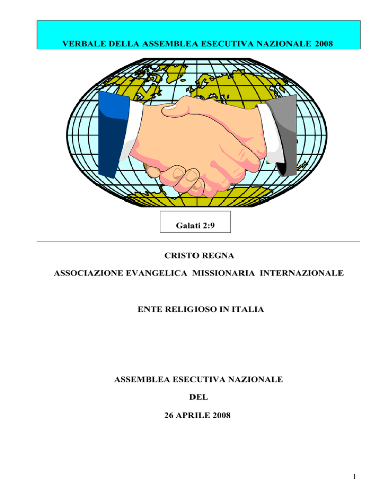 VERBALE DELLA ASSEMBLEA ESECUTIVA NAZIONALE 2008 Galati 2:9 CRISTO REGNA ASSOCIAZIONE EVANGELICA MISSIONARIA INTERNAZIONALE ENTE RELIGIOSO IN ITALIA ASSEMBLEA ESECUTIVA NAZIONALE DEL 26 APRILE 2008 1 ELEMENTI D’IDENTIFICAZIONE E GESTIONALI Data della prima registrazione dello statuto presso lo studio notarile del notaio dottore Grasso Francesco,sito in Siracusa ,via Piave,5. Ufficio registro di Siracusa,11 agosto1995 al numero repertorio 71280 numero raccolta 24628. Data della seconda registrazione dello statuto presso Agenzia delle Entrate;, a richiesta di Scaringella Giuseppe. Ufficio registro Siracusa, 3 febbraio 2003, al N° 560, Mod. 69 serie 3. Sede legale ed amministrativa, via Dalmazia, 8 96100 Siracusa. Sede operativa via F. Crispi,52 96100 Siracusa Italia. TEL /FAX: +39 (0) 931-411330 Cell. +39 347-3545895 Sito Web: www.cristoregna.org E-MAIL: presidente@cristoregna.org Numero del C. F. 93024610896; numero del C. C. P. 12182960. VERBALE DELL’ASSEMBLEA ESECUTIVA NAZIONALE L’anno 2008 addì 26 del mese di aprile alle ore 16.00, in questa assemblea, il Consiglio Esecutivo Nazionale, esaminato e preso atto di alcune modifiche da apportare allo statuto si è riunito per deliberare anche sul resto degli argomenti indicati nell’ordine del giorno. La presenza dei membri del Consiglio Esecutivo Nazionale presenti rende legittima la riunione e quindi idonea a deliberare i punti che saranno trattati nel seguente Ordine del Giorno. L’assemblea nomina segretario dell’Assemblea Esecutiva Nazionale il socio esecutivo diacono Filippo Barbagallo. ORDINE DEL GIORNO 1. relazione del presidente. 2. variazioni allo statuto ed approvazione delle modifiche statutarie. 3. varie ed eventuali. 1° PUNTO I componenti del Consiglio Esecutivo Nazionale, preso atto del primo punto dell’ordine del giorno seguono con attenzione la relazione 2007 del presidente e deliberano in favore della stessa. 2° PUNTO Nel corso dell’assemblea vengono discussi gli articoli da modificare. Al termine del dibattito viene approvato il nuovo statuto. Il nuovo statuto si allega in copia al presente verbale e ne è parte integrante. 3° PUNTO Nulla da discusse,l’assemblea si conclude alle ore 17.30, si riserva di stabilire la prossima riunione . Al termine della lettura del verbale i componenti del C.E. N. in base all’art. 23 dello statuto, confermano ogni deliberazione presa per ogni punto trattato e danno l’approvazione alla firma del Segretario e del Presidente. IL SEGRETARIO DELL’ASSEMBLEA Diac. Filippo Barbagallo IL PRESIDENTE NAZIONALE Ev. Giuseppe Scaringella 2 TITOLO I PREMESSA – COSTITUZIONE – SEDE RAPPRESENTANZA - FINALITÀ – SCOPI PREMESSA CRISTO REGNA, è una Associazione Evangelica Missionaria Internazionale di volontariato. CRISTO REGNA, è stata fondata, da ministri evangelici nella città di Siracusa il 25 luglio 1995. CRISTO REGNA, si propone di diffondere l’evangelo di Gesù Cristo. CRISTO REGNA, offre assistenza e consulenza spirituale, morale e sociale. CRISTO REGNA, promuovere la comunione, la collaborazione e l’edificazione delle chiese evangeliche in Italia e all’estero. ARTICOLO 1 Costituzione E' costituita, in forza di quanto disposto dagli articoli 1, 2 e 3 dalla Dichiarazione Universale dei Diritti Umani del 10/12/1948 e dagli articoli 8, 18, 19, 20 e 29 della Costituzione della Repubblica Italiana, in relazione agli art. 36 e seguenti del Codice Civile, una associazione di volontariato denominata: ASSOCIAZIONE EVANGELICA MISSIONARIA INTERNAZIONALE CRISTO REGNA, si seguito denominata semplicemente “Missione”. ARTICOLO 2 Sede La Missione ha sede nazionale a Siracusa in via Dalmazia n°8. Il cambiamento della sede sociale non costituisce modificazione statutaria. ARTICOLO 3 Rappresentanza La Missione rappresenta l'Assemblea Generale dei soci. L’assemblea Generale si riunisce nella sede indicata nell'articolo 2 e/o in altre sedi periferiche indicate dal presidente nazionale. Le altre assemblee saranno costituite sul territorio nazionale e saranno dipendenti organicamente dalla sede nazionale sopra indicata. Il presente statuto regola e vincola alla sua osservanza tutti coloro che aderiscono alla missione. ARTICOLO 4 Finalità La Missione, rappresenta di fronte ad ogni autorità pubblica e privata, tutti i soci affiliati. La Missione si propone di usare i mezzi previsti dallo statuto. ARTICOLO 5 Scopi La Missione non ha scopo di lucro, la sua durata è illimitata. Essa intende realizzare il progresso spirituale, morale, sociale, economico, e umano delle famiglie e di ogni suo singolo componente, in coordinamento e collaborazione con tutte le forze sane presenti sul territorio italiano ed europeo. La Missione è uno strumento al servizio del regno di Dio, si ispira ai principi della bibbia come Parola di Dio. Si propone di: diffondere il vangelo, esercitare attività missionaria, formazione cristiana, di aprire sedi periferiche, centri, chiese filiali come da regolamento interno, inoltre si propone di consolidare e collaborare con le altre chiese locali, opere periferiche, associazioni, missioni e comunità dei soci, e con quanti aderiranno in seguito. 3 TITOLO II ATTIVITÀ IN GENERALE ATTIVITÀ SPECIALI - SOCI ARTICOLO 6 Attività in generale La missione nella propria autonoma responsabilità si propone di realizzare gli scopi statutari in Italia e all'estero, attraverso la rappresentanza, la promozione, la formazione, l'azione sociale, l’organizzazione e la gestione dei servizi. La missione si propone di provvedere alla formazione cristiana, missionaria, morale, culturale, civile, religiosa e tecnica (educazione permanente) di coloro (giovani e adulti) che intendono dedicarsi alle attività missionarie. ARTICOLO 7 Attività speciali La Missione si avvale prevalentemente delle prestazioni personali volontarie e gratuite dei propri aderenti, sia della sede nazionale che delle sedi periferiche, al fine di estendere la propria attività in ambito nazionale ed intern