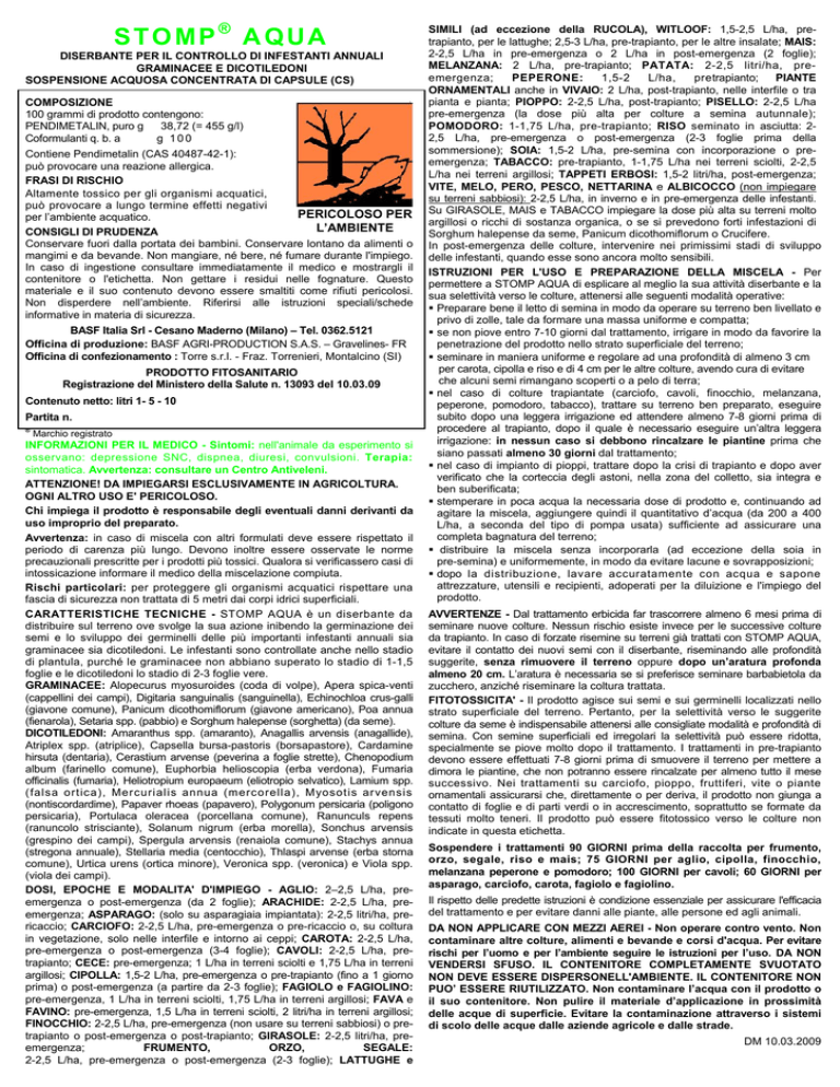 STOMP® AQUA DISERBANTE PER IL CONTROLLO DI INFESTANTI ANNUALI GRAMINACEE E DICOTILEDONI SOSPENSIONE ACQUOSA CONCENTRATA DI CAPSULE (CS) COMPOSIZIONE 100 grammi di prodotto contengono: PENDIMETALIN, puro g 38,72 (= 455 g/l) Coformulanti q. b. a g 100 Contiene Pendimetalin (CAS 40487-42-1): può provocare una reazione allergica. FRASI DI RISCHIO Altamente tossico per gli organismi acquatici, può provocare a lungo termine effetti negativi PERICOLOSO PER per l’ambiente acquatico. L’AMBIENTE CONSIGLI DI PRUDENZA Conservare fuori dalla portata dei bambini. Conservare lontano da alimenti o mangimi e da bevande. Non mangiare, né bere, né fumare durante l'impiego. In caso di ingestione consultare immediatamente il medico e mostrargli il contenitore o l'etichetta. Non gettare i residui nelle fognature. Questo materiale e il suo contenuto devono essere smaltiti come rifiuti pericolosi. Non disperdere nell’ambiente. Riferirsi alle istruzioni speciali/schede informative in materia di sicurezza. BASF Italia Srl - Cesano Maderno (Milano) – Tel. 0362.5121 Officina di produzione: BASF AGRI-PRODUCTION S.A.S. – Gravelines- FR Officina di confezionamento : Torre s.r.l. - Fraz. Torrenieri, Montalcino (SI) PRODOTTO FITOSANITARIO Registrazione del Ministero della Salute n. 13093 del 10.03.09 Contenuto netto: litri 1- 5 - 10 Partita n. ® Marchio registrato INFORMAZIONI PER IL MEDICO - Sintomi: nell'animale da esperimento si osservano: depressione SNC, dispnea, diuresi, convulsioni. Terapia: sintomatica. Avvertenza: consultare un Centro Antiveleni. ATTENZIONE! DA IMPIEGARSI ESCLUSIVAMENTE IN AGRICOLTURA. OGNI ALTRO USO E' PERICOLOSO. Chi impiega il prodotto è responsabile degli eventuali danni derivanti da uso improprio del preparato. Avvertenza: in caso di miscela con altri formulati deve essere rispettato il periodo di carenza più lungo. Devono inoltre essere osservate le norme precauzionali prescritte per i prodotti più tossici. Qualora si verificassero casi di intossicazione informare il medico della miscelazione compiuta. Rischi particolari: per proteggere gli organismi acquatici rispettare una fascia di sicurezza non trattata di 5 metri dai corpi idrici superficiali. CARATTERISTICHE TECNICHE - STOMP AQUA è un diserbante da distribuire sul terreno ove svolge la sua azione inibendo la germinazione dei semi e lo sviluppo dei germinelli delle più importanti infestanti annuali sia graminacee sia dicotiledoni. Le infestanti sono controllate anche nello stadio di plantula, purché le graminacee non abbiano superato lo stadio di 1-1,5 foglie e le dicotiledoni lo stadio di 2-3 foglie vere. GRAMINACEE: Alopecurus myosuroides (coda di volpe), Apera spica-venti (cappellini dei campi), Digitaria sanguinalis (sanguinella), Echinochloa crus-galli (giavone comune), Panicum dicothomiflorum (giavone americano), Poa annua (fienarola), Setaria spp. (pabbio) e Sorghum halepense (sorghetta) (da seme). DICOTILEDONI: Amaranthus spp. (amaranto), Anagallis arvensis (anagallide), Atriplex spp. (atriplice), Capsella bursa-pastoris (borsapastore), Cardamine hirsuta (dentaria), Cerastium arvense (peverina a foglie strette), Chenopodium album (farinello comune), Euphorbia helioscopia (erba verdona), Fumaria officinalis (fumaria), Heliotropium europaeum (eliotropio selvatico), Lamium spp. (falsa ortica), Mercurialis annua (mercorella), Myosotis arvensis (nontiscordardime), Papaver rhoeas (papavero), Polygonum persicaria (poligono persicaria), Portulaca oleracea (porcellana comune), Ranunculs repens (ranuncolo strisciante), Solanum nigrum (erba morella), Sonchus arvensis (grespino dei campi), Spergula arvensis (renaiola comune), Stachys annua (stregona annuale), Stellaria media (centocchio), Thlaspi arvense (erba storna comune), Urtica urens (ortica minore), Veronica spp. (veronica) e Viola spp. (viola dei campi). DOSI, EPOCHE E MODALITA' D'IMPIEGO - AGLIO: 2–2,5 L/ha, preemergenza o post-emergenza (da 2 foglie); ARACHIDE: 2-2,5 L/ha, preemergenza; ASPARAGO: (solo su asparagiaia impiantata): 2-2,5 litri/ha, prericaccio; CARCIOFO: 2-2,5 L/ha, pre-emergenza o pre-ricaccio o, su coltura in vegetazione, solo nelle interfile e intorno ai ceppi; CAROTA: 2-2,5 L/ha, pre-emergenza o post-emergenza (3-4 foglie); CAVOLI: 2-2,5 L/ha, pretrapianto; CECE: pre-emergenza; 1 L/ha in terreni sciolti e 1,75 L/ha in terreni argillosi; CIPOLLA: 1,5-2 L/ha, pre-emergenza o pre-trapianto (fino a 1 giorno prima) o post-emergenza (a partire da 2-3 foglie); FAGIOLO e FAGIOLINO: pre-emergenza, 1 L/ha in terreni sciolti, 1,75 L/ha in terreni argillosi; FAVA e FAVINO: pre-emergenza, 1,5 L/ha in terreni sciolti, 2 litri/ha in terreni argillosi; FINOCCHIO: 2-2,5 L/ha, pre-emergenza (non usare su terreni sabbiosi) o pretrapianto o post-emergenza o post-trapianto; GIRASOLE: 2-2,5 litri/ha, preemergenza; FRUMENTO, ORZO, SEGALE: 2-2,5 L/ha, pre-emergenza o post-emergenza (2-3 foglie); LATTUGHE e SIMILI (ad eccezione della RUCOLA), WITLOOF: 1,5-2,5 L/ha, pretrapianto, per le lattughe; 2,5-3 L/ha, pre-trapianto, per le altre insalate; MAIS: 2-2,5 L/ha in pre-emergenza o 2 L/ha in post-emergenza (2 foglie); MELANZANA: 2 L/ha, pre-trapianto; PATATA: 2-2,5 litri/ha, preemergenza; PEPERONE: 1,5-2 L/ha, pretrapianto; PIANTE ORNAMENTALI anche in VIVAIO: 2 L/ha, post-trapianto, nelle interfile o tra pianta e pianta; PIOPPO: 2-2,5 L/ha, post-trapianto; PISELLO: 2-2,5 L/ha pre-emergenza (la dose più alta per colture a semina autunnale); POMODORO: 1-1,75 L/ha, pre-trapianto; RISO seminato in asciutta: 22,5 L/ha, pre-emergenza o post-emergenza (2-3 foglie prima della sommersione); SOIA: 1,5-2 L/ha, pre-semina con incorporazione o preemergenza; TABACCO: pre-trapianto, 1-1,75 L/ha nei terreni sciolti, 2-2,5 L/ha nei terreni argillosi; TAPPETI ERBOSI: 1,5-2 litri/ha, post-emergenza; VITE, MELO, PERO, PESCO, NETTARINA e ALBICOCCO (non impiegare su terreni sabbiosi): 2-2,5 L/ha, in inverno e in pre-emergenza delle infestanti. Su GIRASOLE, MAIS e TABACCO impiegare la 
