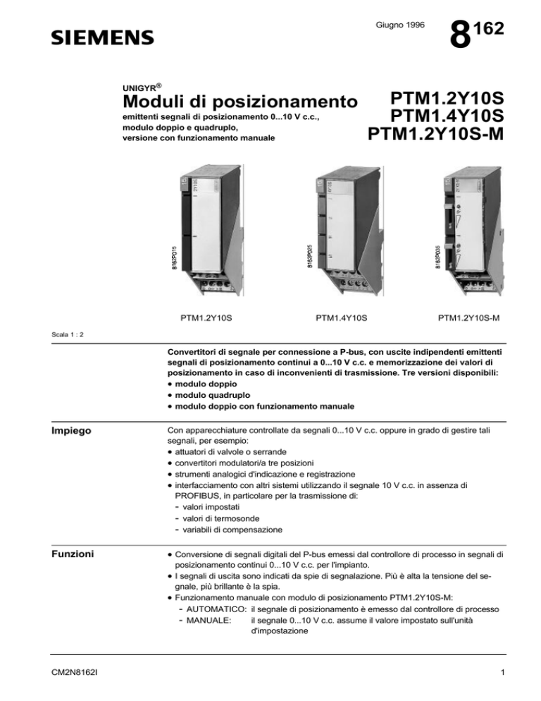 s Giugno 1996 UNIGYR® Moduli di posizionamento emittenti segnali di posizionamento 0...10 V c.c., modulo doppio e quadruplo, versione con funzionamento manuale PTM1.2Y10S 8 162 PTM1.2Y10S PTM1.4Y10S PTM1.2Y10S-M PTM1.4Y10S PTM1.2Y10S-M Scala 1 : 2 Convertitori di segnale per connessione a P-bus, con uscite indipendenti emittenti segnali di posizionamento continui a 0...10 V c.c. e memorizzazione dei valori di posizionamento in caso di inconvenienti di trasmissione. Tre versioni disponibili: • modulo doppio • modulo quadruplo • modulo doppio con funzionamento manuale Impiego Con apparecchiature controllate da segnali 0...10 V c.c. oppure in grado di gestire tali segnali, per esempio: • attuatori di valvole o serrande • convertitori modulatori/a tre posizioni • strumenti analogici d'indicazione e registrazione • interfacciamento con altri sistemi utilizzando il segnale 10 V c.c. in assenza di PROFIBUS, in particolare per la trasmissione di: - valori impostati - valori di termosonde - variabili di compensazione Funzioni • Conversione di segnali digitali del P-bus emessi dal controllore di processo in segnali di posizionamento continui 0...10 V c.c. per l'impianto. • I segnali di uscita sono indicati da spie di segnalazione. Più è alta la tensione del segnale, più brillante è la spia. • Funzionamento manuale con modulo di posizionamento PTM1.2Y10S-M: - CM2N8162I AUTOMATICO: il segnale di posizionamento è emesso dal controllore di processo MANUALE: il segnale 0...10 V c.c. assume il valore impostato sull'unità d'impostazione 1 Comportamento in caso di anomalia Nota: • Memorizzazione del valore di posizionamento: se la trasmissione dei dati non è corretta, cioè in assenza di un telegramma corretto del P-bus dall'unità di processo entro 4 secondi, attraverso il controllore di processo possono essere preselezionati i seguenti stati: - l'uscita diventerà 0, anche se non è stata effettuata alcuna preselezione (valore di base) - l'uscita assumerà un valore preselezionato compreso fra 0 e 10 V - l'uscita manterrà l'ultimo valore trasmesso • Qualora venga a mancare la tensione di esercizio sull'unità compatta I/O, il segnale di uscita diventerà 0. Al ripristino della tensione, il segnale rimarrà 0 finché il telegramma valido successivo non trasmetterà un altro valore. La funzione «Memorizzazione del valore di posizionamento» è supportata dai seguenti tipi di controllore di processo: - Controllore di processo universale UNIGYR PRU... 1) - Controllore di processo VISONIK PRV2... 1) A partire dalla versione software 5 Utilizzando i moduli di posizionamento con una versione precedente del software del controllore di processo, l'uscita di posizionamento diventerà sempre 0 in caso di trasmissione non corretta. Modelli disponibili Modulo di posizionamento con due uscite Modulo di posizionamento con quattro uscite Modulo di posizionamento con due uscite e funzionamento manuale Consegna Base e modulo elettronico vengono consegnati assieme, ma in confezioni separate collegate fra loro. Accessori Gli accessori generali per i moduli I/O devono essere ordinati separatamente. Per i dettagli, vedere il foglio tecnico 8105. PTM1.2Y10S PTM1.4Y10S PTM1.2Y10S-M Combinazioni possibili Controllori di processo Fondamentalmente i moduli I/O possono essere collegati a qualsiasi controllore di processo che disponga di una connessione P-bus e supporti le funzioni I/O sul lato software. Unità di campo Può essere collegata qualsiasi unità della gamma di prodotti Landis & Gyr, purché i suoi segnali siano compatibili con gli ingressi e le uscite del modulo. E' altresì possibile utili zzare prodotti di altra marca se i loro segnali sono compatibili e se soddisfano i relativi requisiti di sicurezza. Esecuzione tecnica Comportamento all'accensione Quando il modulo viene alimentato (BEZ=tensione di riferimento via linea del P-bus +24 V c.c., e G=fase del sistema 24 V a.c.), vengono raggiunti i seguenti stati: - dopo 0,5 secondi le funzioni I/O saranno pronte a ricevere un telegramma - 1 secondo dopo il ricevimento del prompt, le uscite analogiche saranno stabili Protezione contro il cortocircuito Le uscite di posizionamento 0...10 V c.c. sono protette contro il cortocircuito. Nota: • L'intera funzionalità del modulo I/O comprende il modulo stesso (hardware) e la gestione dei segnali nel controllore di processo (software). Per una piena comprensione delle funzioni del modulo, nella configurazione del programma utente devono essere prese in considerazione le corrispondenti sequenze di processo e le scelte disponibili. • Per le caratteristiche tecniche comuni a tutti i moduli I/O, fare riferimento al foglio tecnico 8102, «Dati base del sistema con moduli I/O», stesso capitolo. 2 CM2N8162I Esecuzione meccanica Unità modulare con custodia in plastica, composta da base e modulo elettronico, che vengono innestati sul P-bus. I segnali e le tensioni vengono prelevati da contatti sul Pbus. I morsetti di connessione dei moduli I/O collocati sul P-bus vengono utilizzati in luogo delle morsettiere per cablaggio esterno solitamente collocate nel quadro di comando. Questi morsetti sono conformi alle normative applicabili e hanno la funzione di morsetti di prova. Essi possono, inoltre, essere muniti di etichette specifiche dell'impianto. Le etichette specifiche dell'impianto per i moduli possono essere inserite nel frontale trasparente del modulo. Queste etichette, appositamente approntate e perforate, vengono marcate con il PC-tool «UNIGYR Design». Lo spazio per l'indirizzo e le spie di segnalazione sono collocati anch'essi nel frontale del modulo PTM1.2Y10S-M, che alloggia anche gli elementi per il funzionamento manuale. Tutti i moduli I/O utilizzano gli stessi accessori indicati sul foglio tecnico 8105. Nota: Per una descrizione più dettagliata dell'esecuzione meccanica del modulo, vedere il foglio tecnico 8102, «Dati di base del sistema con moduli I/O», stesso capitolo. Viste anter