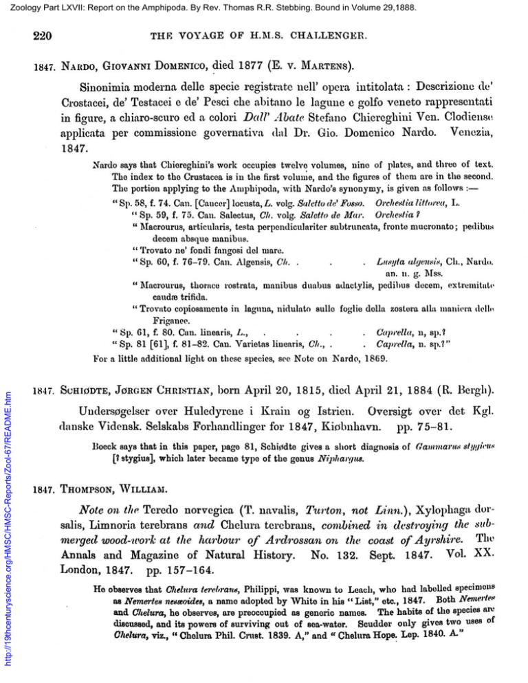Zoology Part LXVII: Report on the Amphipoda. By Rev. Thomas R.R. Stebbing. Bound in Volume 29,1888. 220 THE VOYAGE OF H.M.S. CHALLENGER. 1847. NARDO, GIOVANNI DoMIco, died 1877 (E. v. MARTENS). Sinonimia moderna delle specie registrate iiell' opera intitolata : Descrizione de' Crostacei, de' Testacei e de' Pesci che abitano le lagune e golfo veneto rappresentati in figure, a chiaro-scuro ed a colon Dali' Abate Stefano Chiereghini Yen. Clodiense applicata per commissione governativa 1847. dal Dr. Gio. Domenico Nardo. Venezia, Nardo says that Chiereghini's work occupies twelve volumes, nine of plates, and three of text. The index to the Crustacea is in the first volume, and the figures of them are in the second. The portion applying to the Amphipoda, with Nardo's synonymy, is given as follows "Sp. 58, f. 74. Can. [Cancer] locusta, L. volg. Sale/to d' Fusso. Ore/i es/ia littorea, L. "Sp. 59, f. 75. Can. Salectus, Ch. voig. Sale/to do Mar. Orcliestia? Macrourus, articularis, testa porpondicuinriter subtruncata, fronte mucronato; pedibus decent absque manibus. "Trovato no' fondi fangosi del mare. . Liayta aiqeiisis, Ch., Naidu. . "Sp. 60, f. 76-79. Can. Algeusis, Ch. . an. it. g. Mss. lIacrourus, thorace rostrata, manibus duabus adactylis, pedibus decem, treinitat caudre trifida. Trovato copiosamente in laguna, nidulato sullo foglie della zostera alla maniera (lelk http://19thcenturyscience.org/HMSC/HMSC-Reports/Zool-67/README.htm Friganee. 61, f. 80. Can. linearis, L., . . . . (Japrella, ii, sp.? Sp. . Caprella, n. sp.?" "Sp. 81 [61], f. 81-82. Can. Varietas liucaris, Ch., . For a little additional light on these species, see Note on Nardo, 1869. 1847. SCHIØDTE, JØRGEN CHRISTIAN, born April 20, 1815, died April 21, 1884 (R. Bergh). Undersøgelser over Huleclyrcue i Krain og Istrien. Oversigt over det KgI. dauske Vidensk. Seiskabs Forhandlinger for 1847, Kiøhnhavm p. 75-81. Boeck says that in this paper, page 81, Schiødte gives a short diagnosis of Ganimara. 81!/!Ii(-US [?stygius], which later became type of the genus Nip/iargu3. 1847. THOMPSON, WILLIAM. Note on the Teredo norvegica (P. navalis, Turton., not Linn.), Xylophaga. dorsalis, Limnoria terebrans and Chelura terebraus, combined in destroying the sub The merged wood-work at the harbour of Ardrossan on the coast of Ayrshire. Vol. XX. Annals and Magazine of Natural History. No. 132. Sept. 1847. London, 1847. pp. 157-164. Ho observes that C'helura /erel'rans, Philippi, was known to Leach, who had labelled 8pecimdfls as Nemerks nesoi4es, a name adopted by White in his "List," etc., 1847. Both Nenierles and. Chelura, he observes, are preoccupied as generic names. The habits of the species ai of discussed, and its powers of surviving out of sea-water. Soucider only gives two uses Clielura, viz., "Cholura Phil. Crust. 1839. A," and "Chelura Hope. Lep. 1840. A."