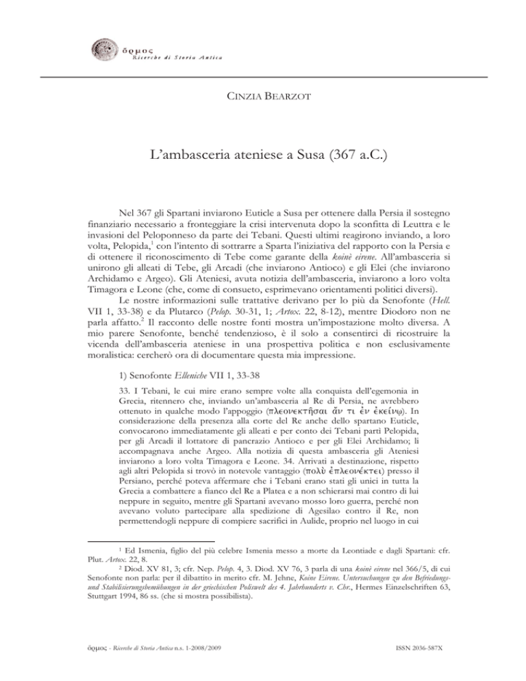 CINZIA BEARZOT L’ambasceria ateniese a Susa (367 a.C.) Nel 367 gli Spartani inviarono Euticle a Susa per ottenere dalla Persia il sostegno finanziario necessario a fronteggiare la crisi intervenuta dopo la sconfitta di Leuttra e le invasioni del Peloponneso da parte dei Tebani. Questi ultimi reagirono inviando, a loro volta, Pelopida,1 con l’intento di sottrarre a Sparta l’iniziativa del rapporto con la Persia e di ottenere il riconoscimento di Tebe come garante della koinè eirene. All’ambasceria si unirono gli alleati di Tebe, gli Arcadi (che inviarono Antioco) e gli Elei (che inviarono Archidamo e Argeo). Gli Ateniesi, avuta notizia dell’ambasceria, inviarono a loro volta Timagora e Leone (che, come di consueto, esprimevano orientamenti politici diversi). Le nostre informazioni sulle trattative derivano per lo più da Senofonte (Hell. VII 1, 33-38) e da Plutarco (Pelop. 30-31, 1; Artox. 22, 8-12), mentre Diodoro non ne parla affatto.2 Il racconto delle nostre fonti mostra un’impostazione molto diversa. A mio parere Senofonte, benché tendenzioso, è il solo a consentirci di ricostruire la vicenda dell’ambasceria ateniese in una prospettiva politica e non esclusivamente moralistica: cercherò ora di documentare questa mia impressione. 1) Senofonte Elleniche VII 1, 33-38 33. I Tebani, le cui mire erano sempre volte alla conquista dell’egemonia in Grecia, ritennero che, inviando un’ambasceria al Re di Persia, ne avrebbero ottenuto in qualche modo l’appoggio ( ). In considerazione della presenza alla corte del Re anche dello spartano Euticle, convocarono immediatamente gli alleati e per conto dei Tebani partì Pelopida, per gli Arcadi il lottatore di pancrazio Antioco e per gli Elei Archidamo; li accompagnava anche Argeo. Alla notizia di questa ambasceria gli Ateniesi inviarono a loro volta Timagora e Leone. 34. Arrivati a destinazione, rispetto ) presso il agli altri Pelopida si trovò in notevole vantaggio ( Persiano, perché poteva affermare che i Tebani erano stati gli unici in tutta la Grecia a combattere a fianco del Re a Platea e a non schierarsi mai contro di lui neppure in seguito, mentre gli Spartani avevano mosso loro guerra, perché non avevano voluto partecipare alla spedizione di Agesilao contro il Re, non permettendogli neppure di compiere sacrifici in Aulide, proprio nel luogo in cui 1 Ed Ismenia, figlio del più celebre Ismenia messo a morte da Leontiade e dagli Spartani: cfr. Plut. Artox. 22, 8. 2 Diod. XV 81, 3; cfr. Nep. Pelop. 4, 3. Diod. XV 76, 3 parla di una koinè eirene nel 366/5, di cui Senofonte non parla: per il dibattito in merito cfr. M. Jehne, Koine Eirene. Untersuchungen zu den Befriedungsund Stabilisierungsbemühungen in der griechischen Poliswelt des 4. Jahrhunderts v. Chr., Hermes Einzelschriften 63, Stuttgart 1994, 86 ss. (che si mostra possibilista). ὅρμος - Ricerche di Storia Antica n.s. 1-2008/2009 ISSN 2036-587X Cinzia Bearzot, L’ambasceria ateniese a Susa (367 a.C.) | 101 li aveva compiuti Agamennone salpando per l’Asia alla conquista di Troia. 35. Contribuiva poi ad aumentare la stima per Pelopida, oltre alla vittoria dei Tebani nella battaglia di Leuttra, anche il fatto che fossero riusciti a saccheggiare il territorio di Sparta. E Pelopida fece notare che anche gli Argivi e gli Arcadi, senza l’aiuto tebano, erano stati sconfitti dagli Spartani. Le sue affermazioni furono confermate dalla testimonianza dell’ateniese Timagora, secondo dopo Pelopida nella stima del Re ( ). 36. Questi chiese quindi a Pelopida quali condizioni a lui favorevoli voleva fossero inserite nel trattato ed egli rispose: “L’autonomia di Messene da Sparta e il disarmo della flotta di Atene; l’impegno a compiere una spedizione contro di esse in caso di rifiuto delle presenti condizioni e a marciare innanzitutto contro qualunque città non volesse partecipare sotto la guida di Tebe”. 37. Dopo la redazione e la lettura di queste condizioni agli ambasciatori, Leone esclamò in presenza del Re: “Per Zeus, Ateniesi, a quanto pare è ormai tempo per voi di cercare un altro amico al posto del Re”. Quando il segretario gli riferì le parole dell’Ateniese, il Re fece aggiungere questa clausola: “Se gli Ateniesi sono a conoscenza di condizioni più giuste di queste, vengano a renderle note al Re”. 38. dopo che gli ambasciatori tornarono nelle rispettive città, gli Ateniesi misero a morte Timagora, accusato da Leone di non aver voluto stare3 con lui e di essersi consigliato su ogni punto del trattato con Pelopida ( ). Quanto agli altri ambasciatori, l’eleo Archidamo ebbe parole di approvazione per ciò che aveva deliberato il Re, perché si era mostrato più favorevole agli Elei che agli Arcadi, mentre Antioco, vedendo che la potenza arcadica era stata tenuta in poco conto, non accettò neppure i doni e riferì ai Diecimila che il re aveva un’infinità di fornai, cuochi, coppieri e valletti, ma uomini in grado di combattere con i Greci, pur avendo cercato tanto, non era riuscito proprio a vederne. Disse anche che tutte quelle immense ricchezze a lui parevano solo una spacconeria, dal momento che anche il famoso platano d’oro non era in grado di far ombra neppure a una cicala”.4 La ricostruzione di Senofonte (che parla qui di Pelopida per la prima volta)5 si segnala per la sua tendenza antitebana, come mostrano diversi aspetti del racconto. a) L’obiettivo dei Tebani è di ottenere l’egemonia della Grecia; viene usato due volte (§§ 33 e 34) il verbo pleonektein (= “pretendere di avere di più” senza vero diritto) per esprimere le conseguenze dell’appoggio del Re a Tebe. È questa, fin da Tucidide, la terminologia dell’imperialismo, non dell’egemonia spontaneamente riconosciuta e quindi legittima.6 b) Pelopida trova udienza presso il Re a motivo del tradizionale medismo di Tebe, espressosi in particolare in occasione della battaglia di Platea del 479 e nel divieto fatto ad Agesilao di sacrificare ad Aulide prima de
